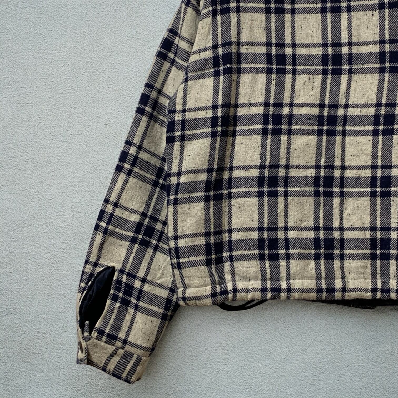 前身頃のコットンツイル生地と、後身頃と袖のネップ感の強いウール生地をドッキングさせた一着。