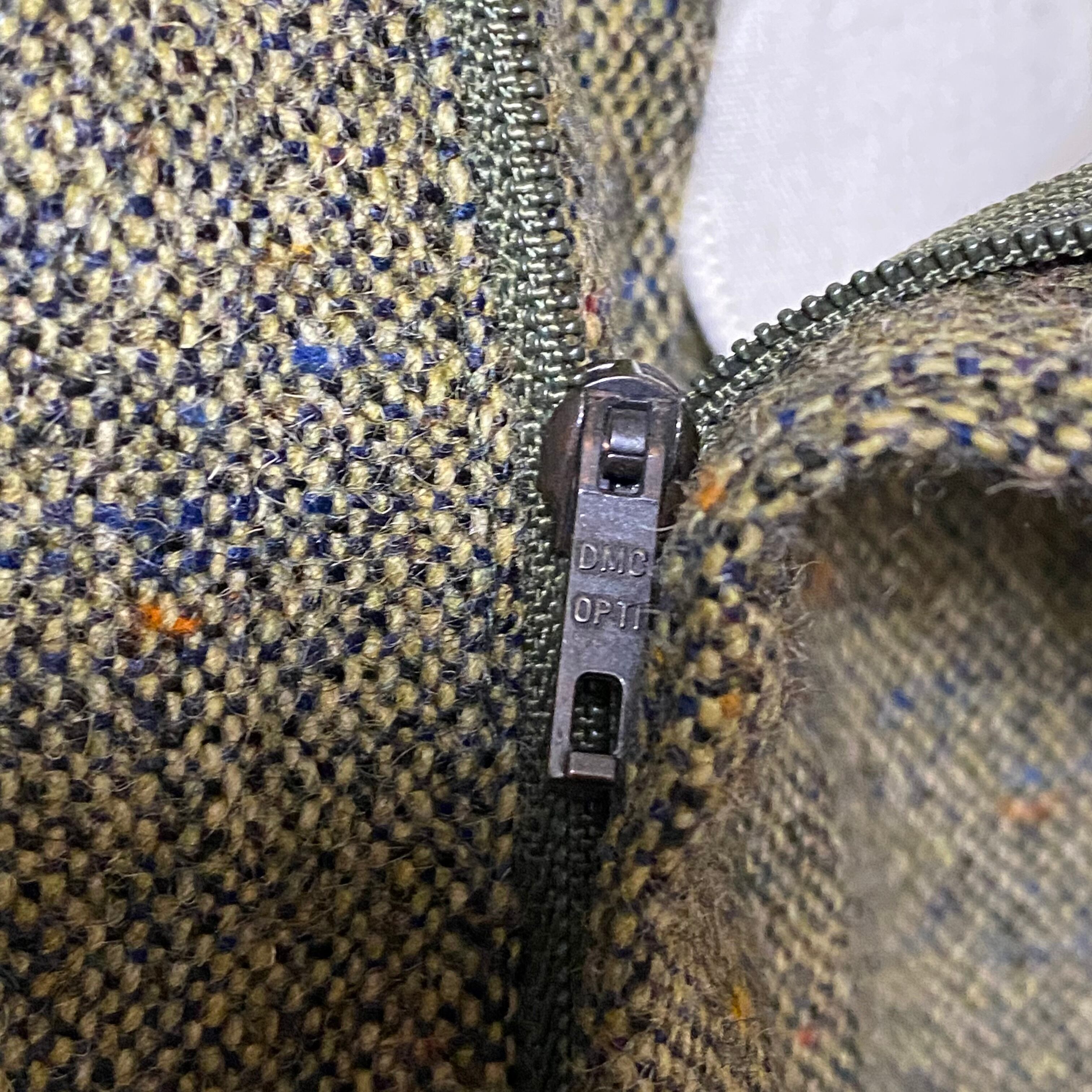 グレーともグリーンとも言い難い非常に絶妙なカラーの混紡ウール生地の中に青や水色、赤にオレンジといったネップが混じり、素晴らしい風合いと雰囲気を醸し出しすワイドトラウザーズです。