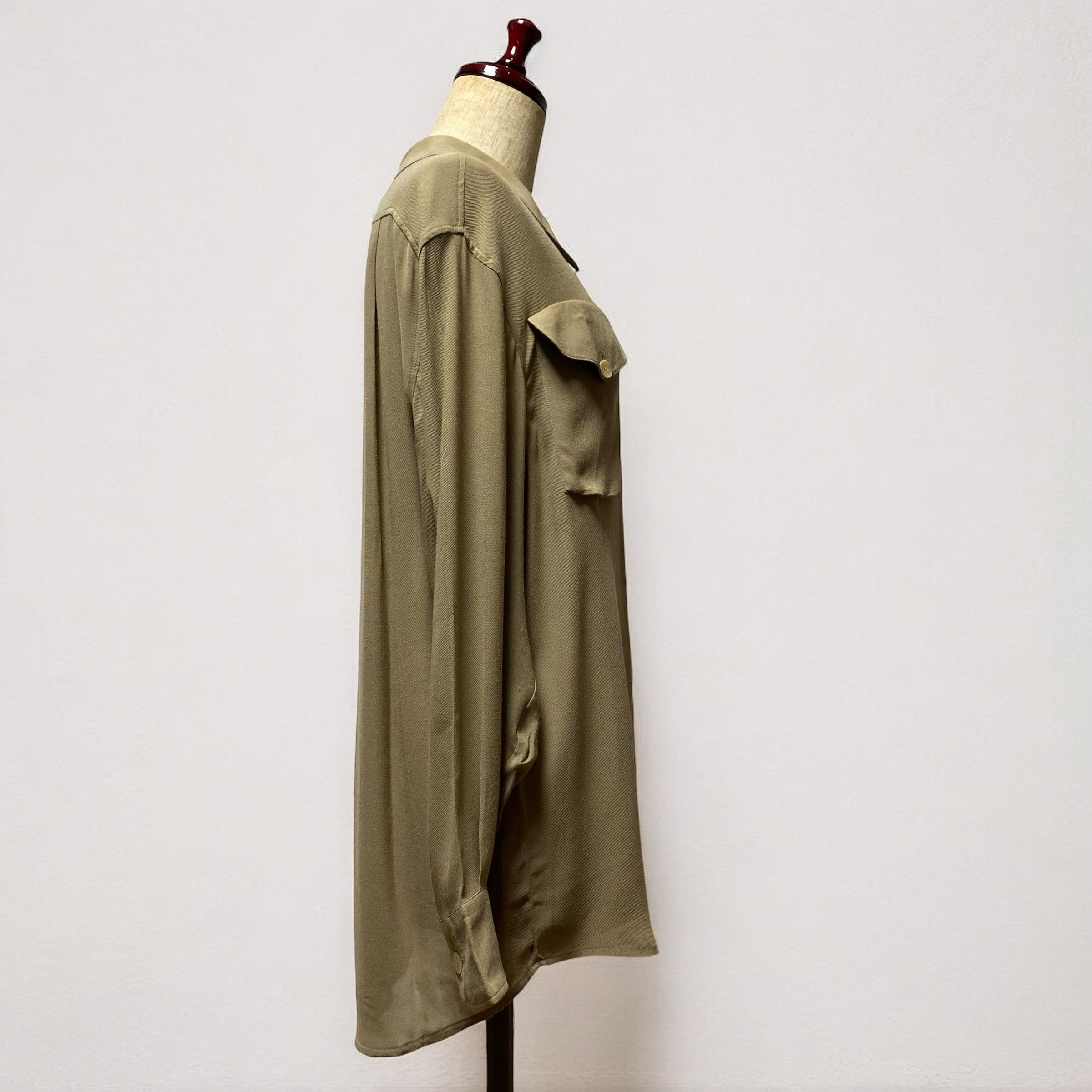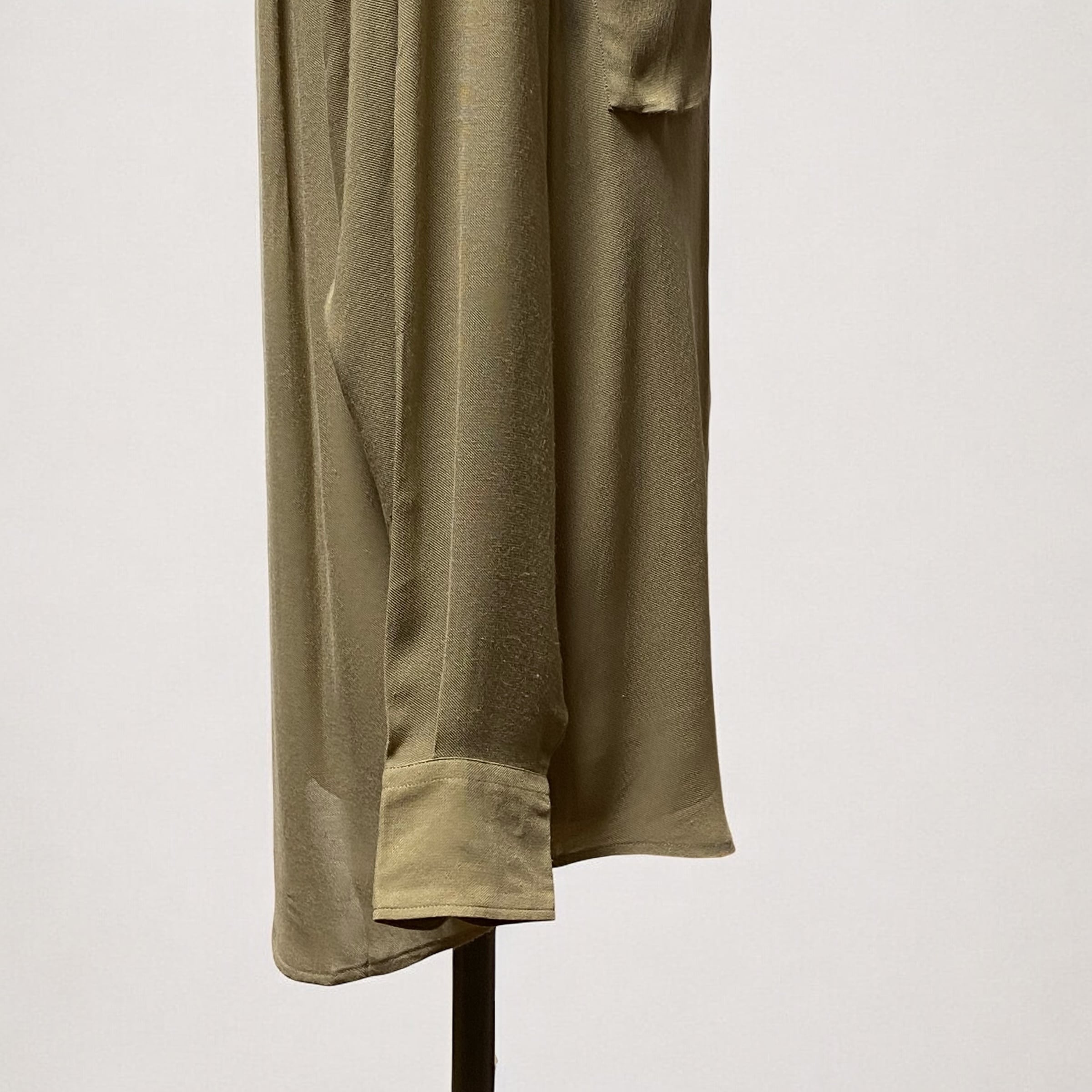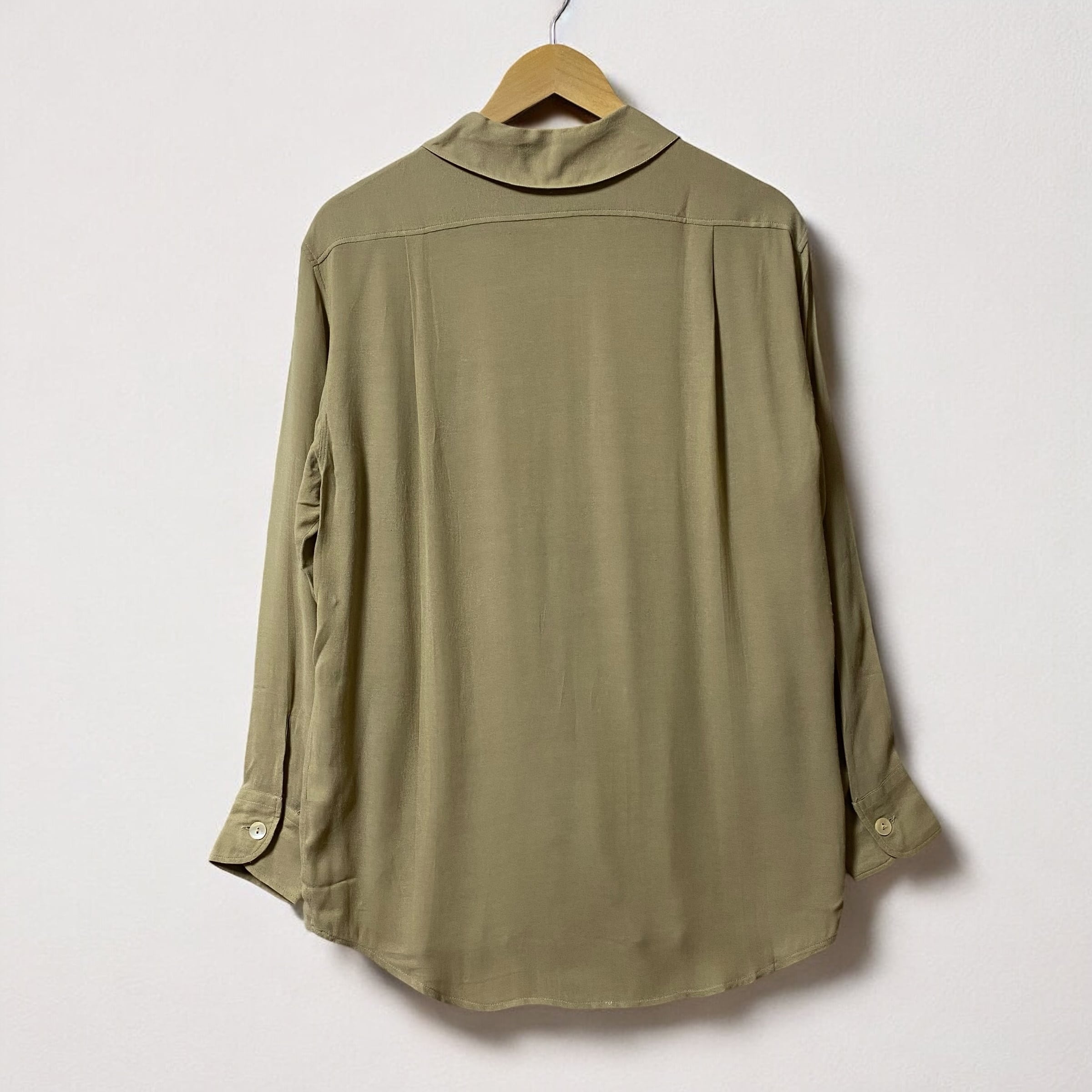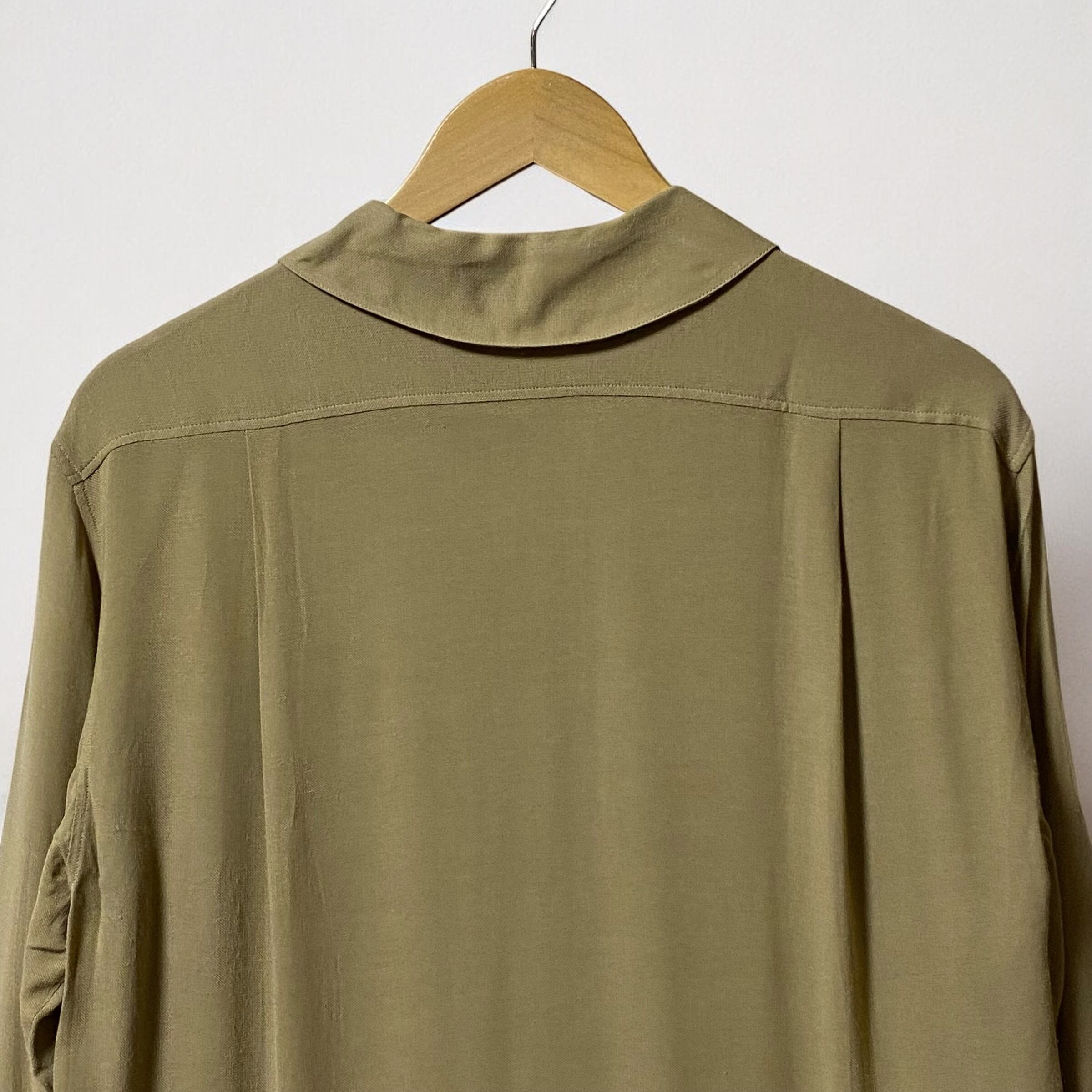 レーヨンビスコース生地が生み出す美しいドレープ感と、光の加減が見せてくれる様々な表情を楽しむ事が出来るエレガンスなシャツです。
