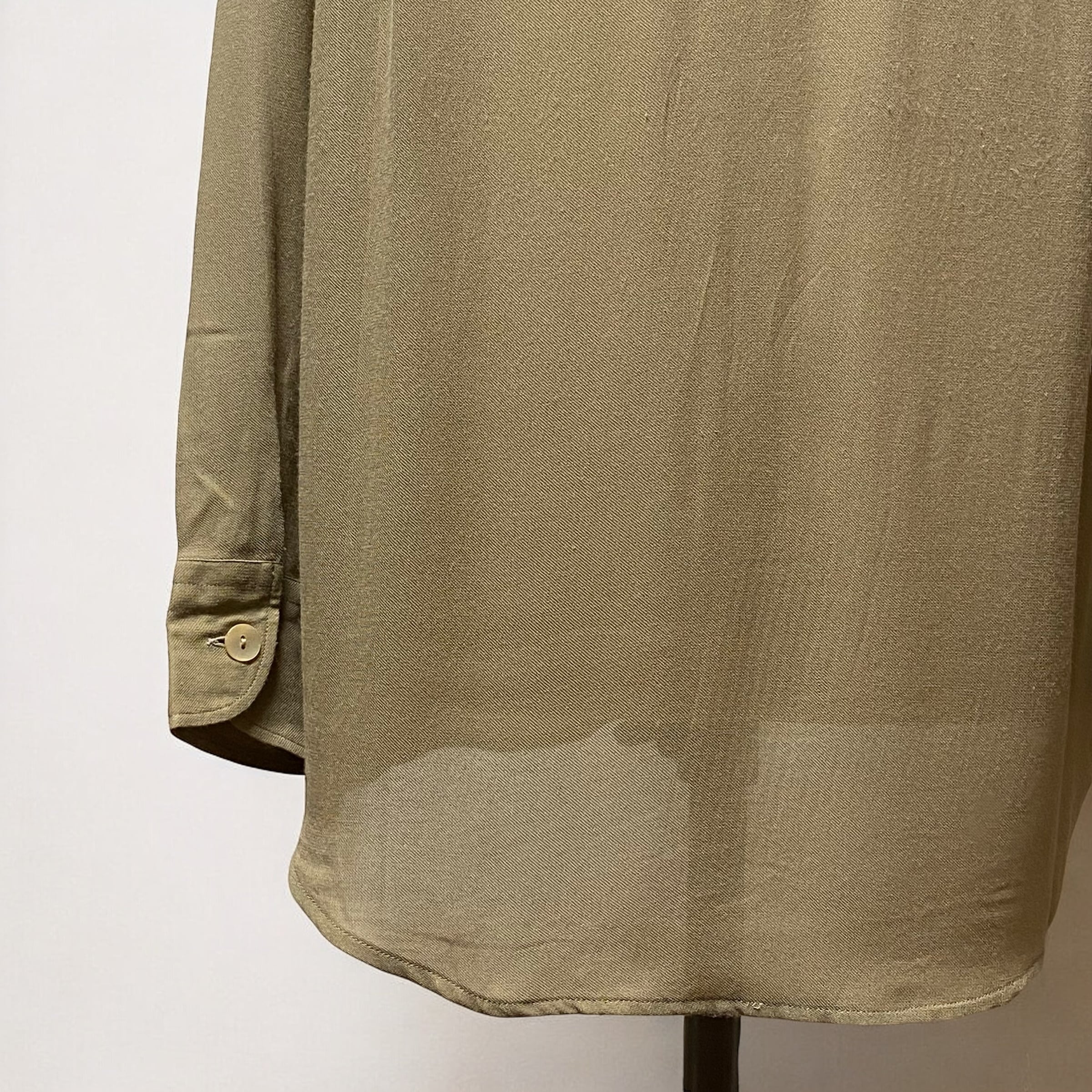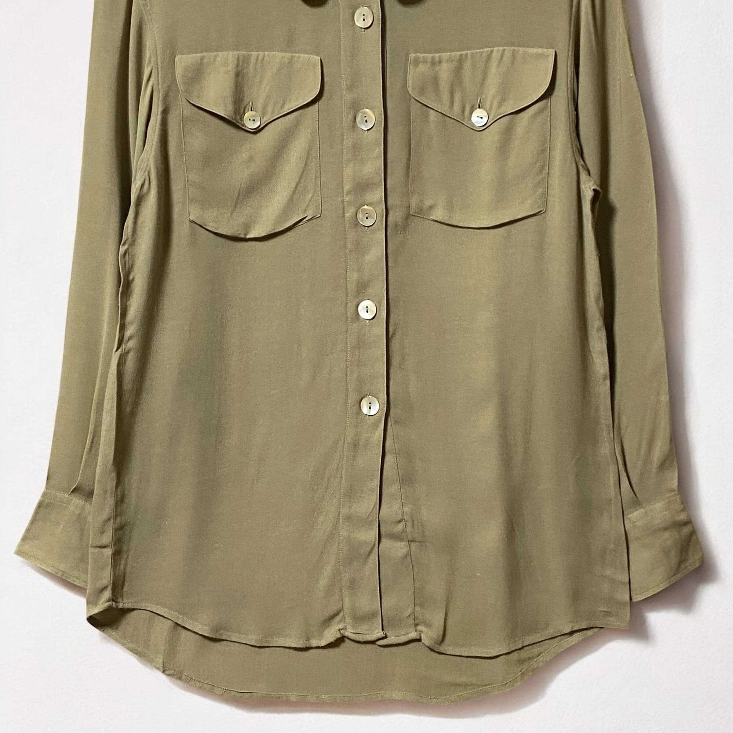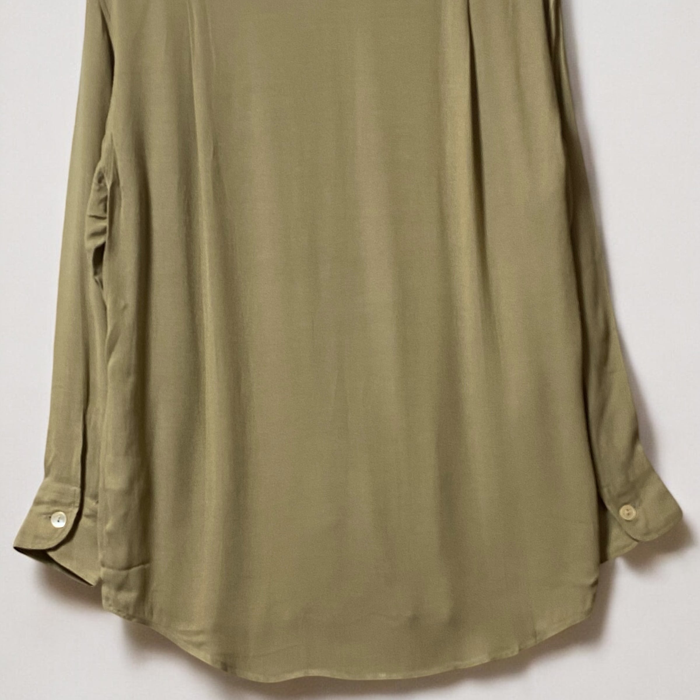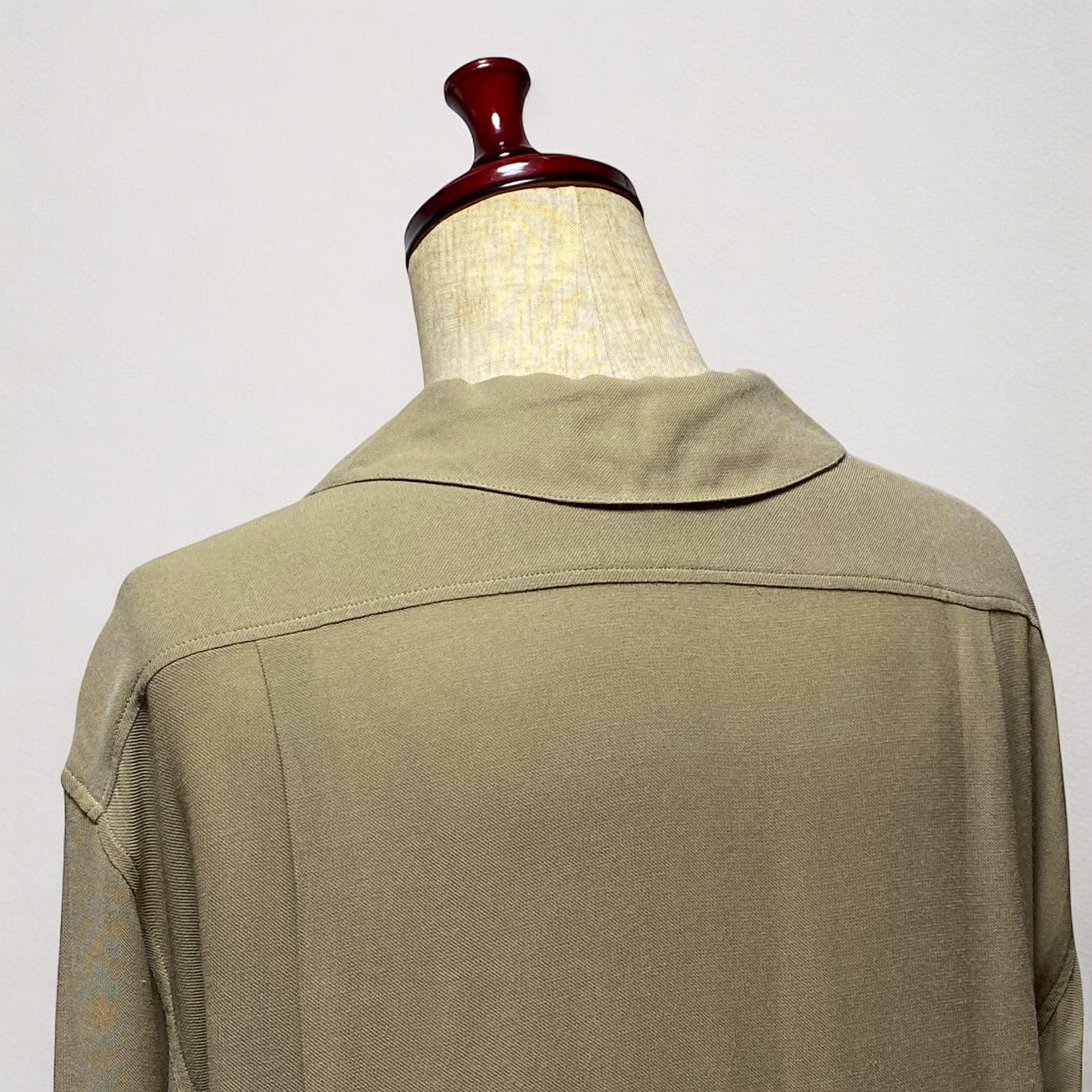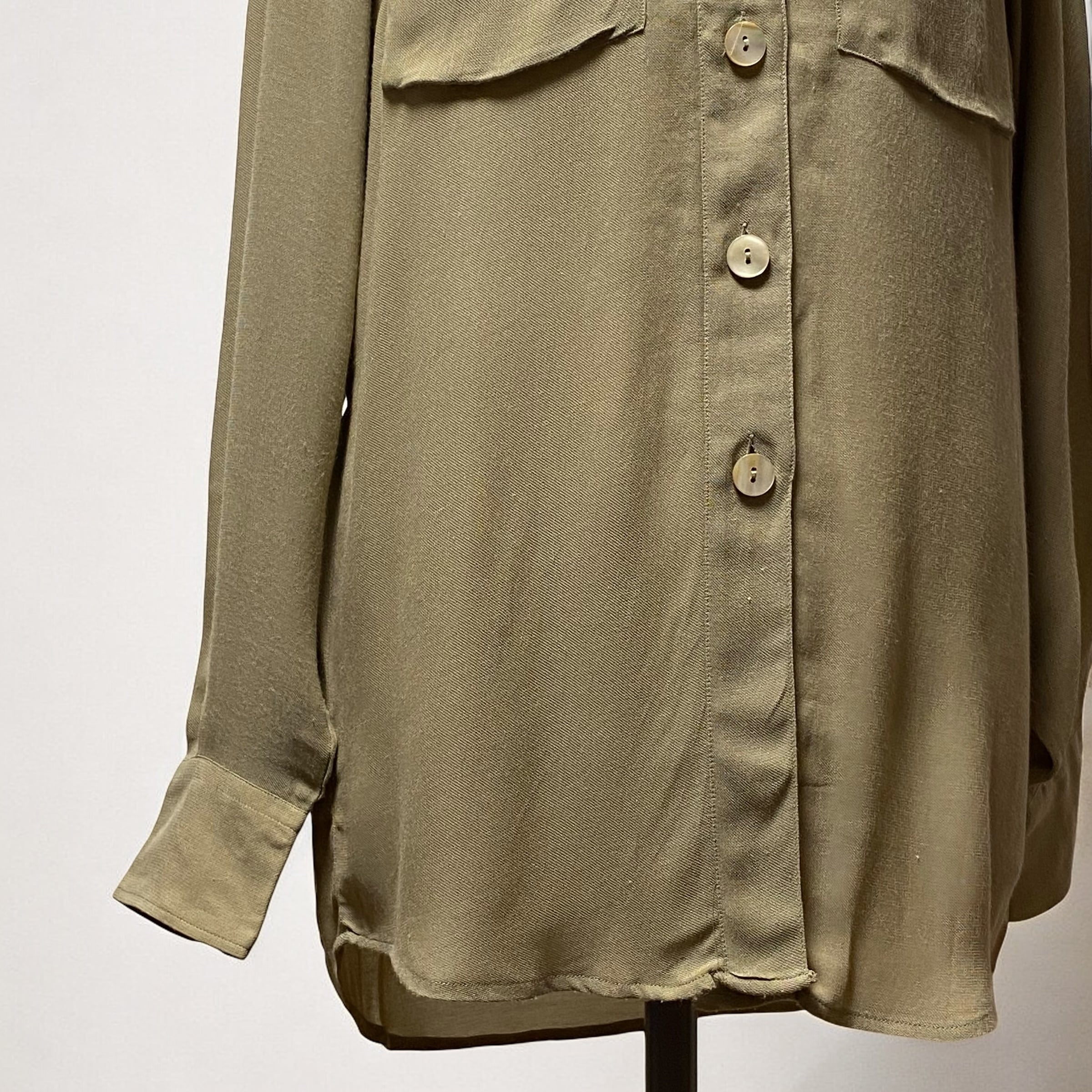 レーヨンビスコース生地が生み出す美しいドレープ感と、光の加減が見せてくれる様々な表情を楽しむ事が出来るエレガンスなシャツです。