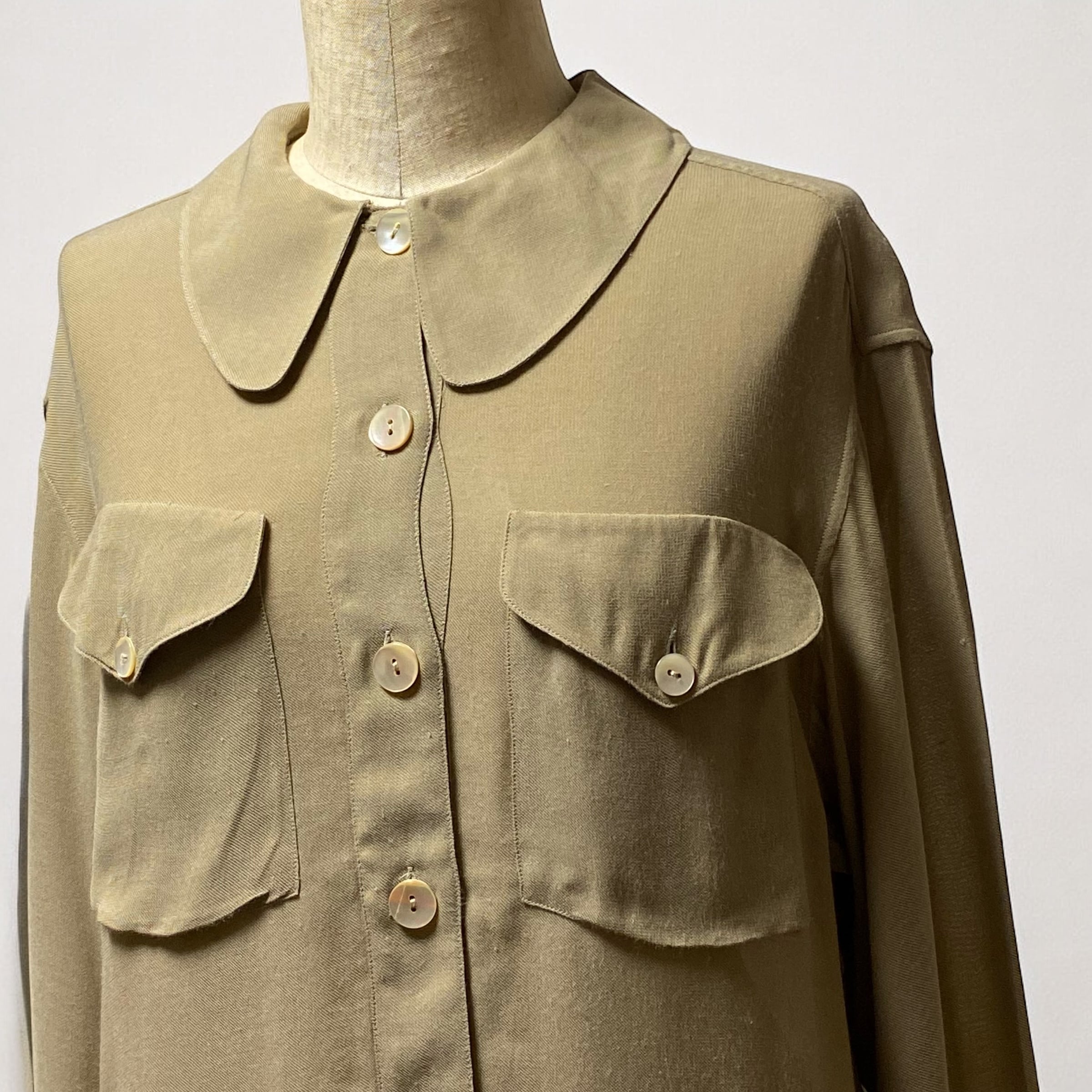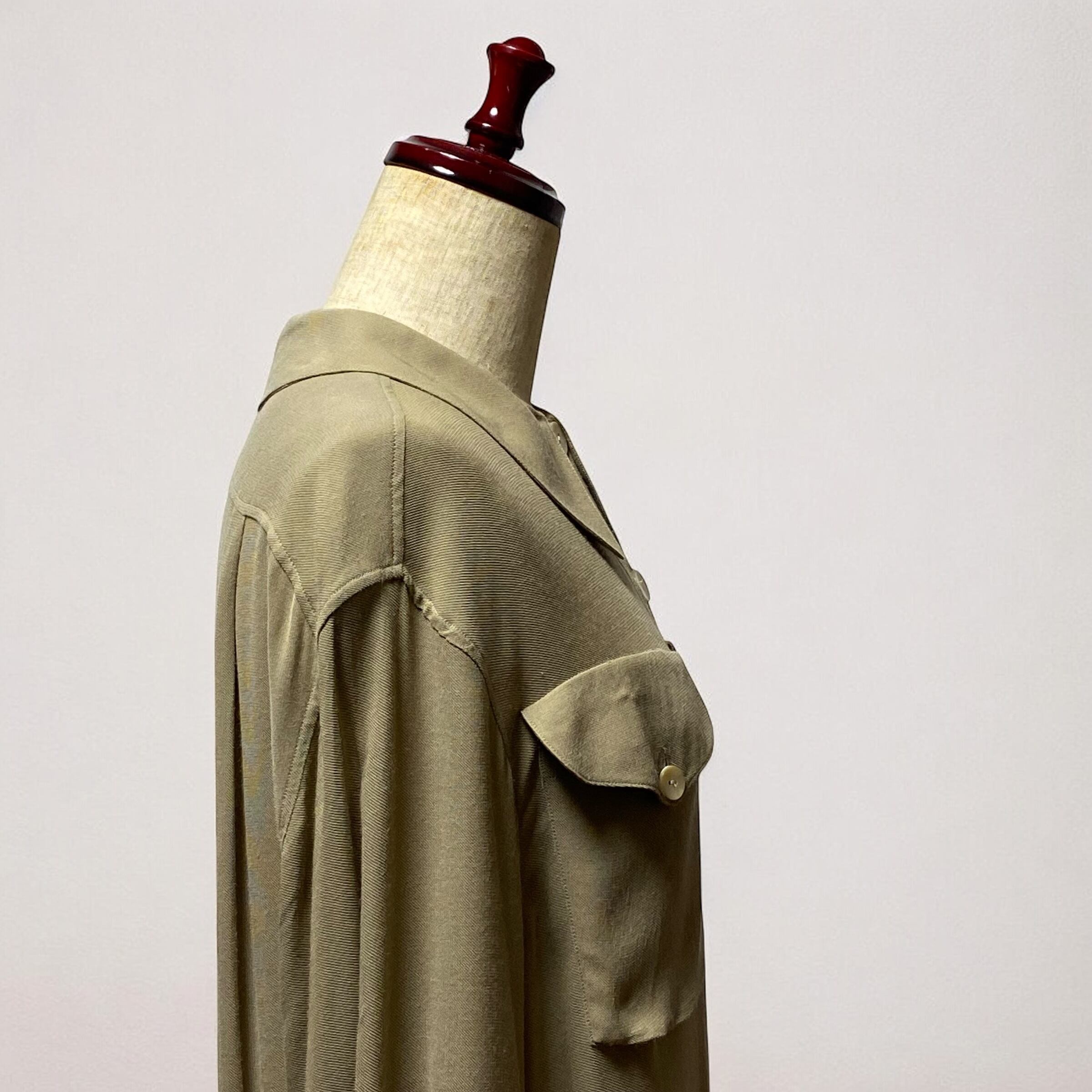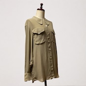 やや大振りなラウンドカラーの襟に大きめなボタン、胸元のフラップポケット、アンニュイな雰囲気のグレージュカラーの色味も最高です◎