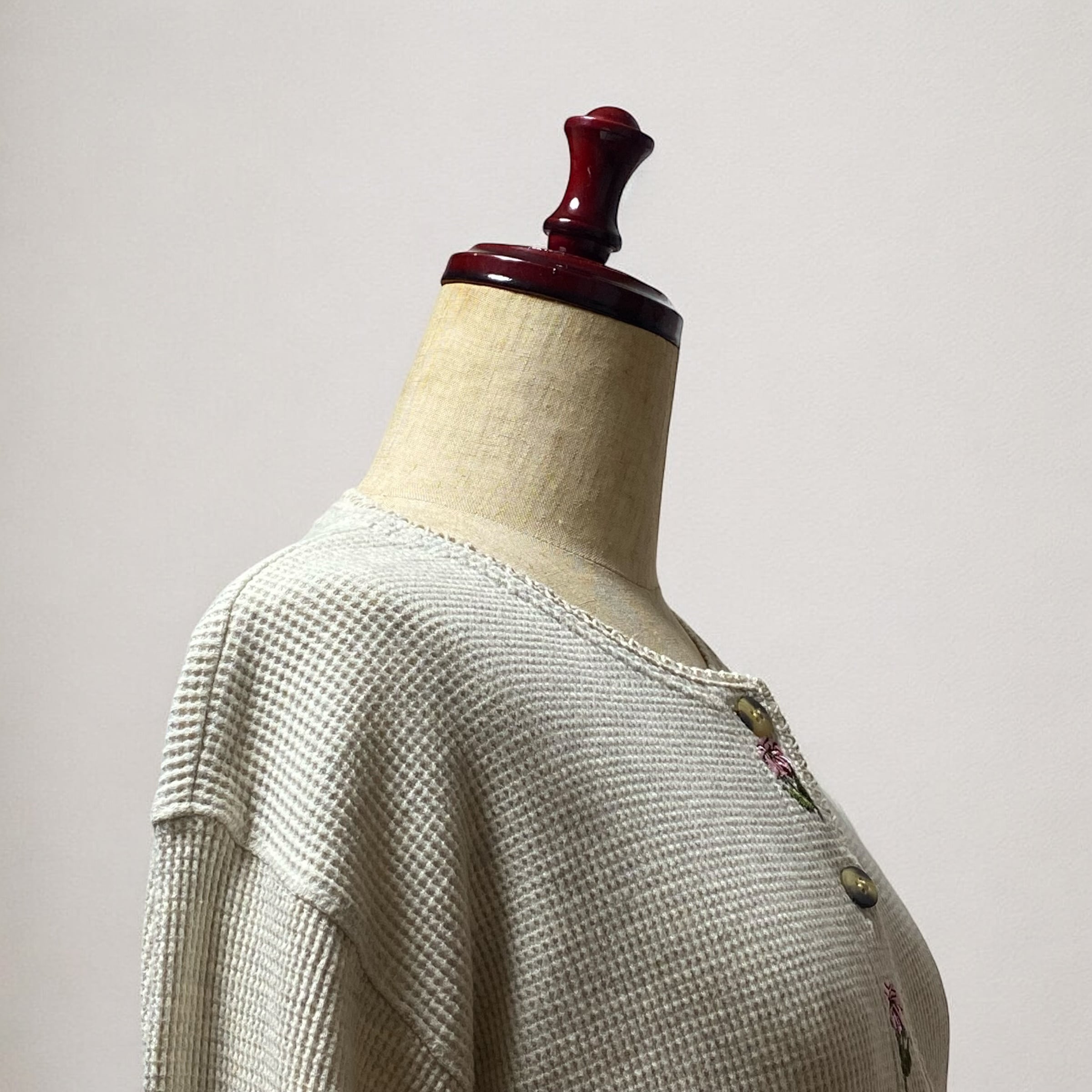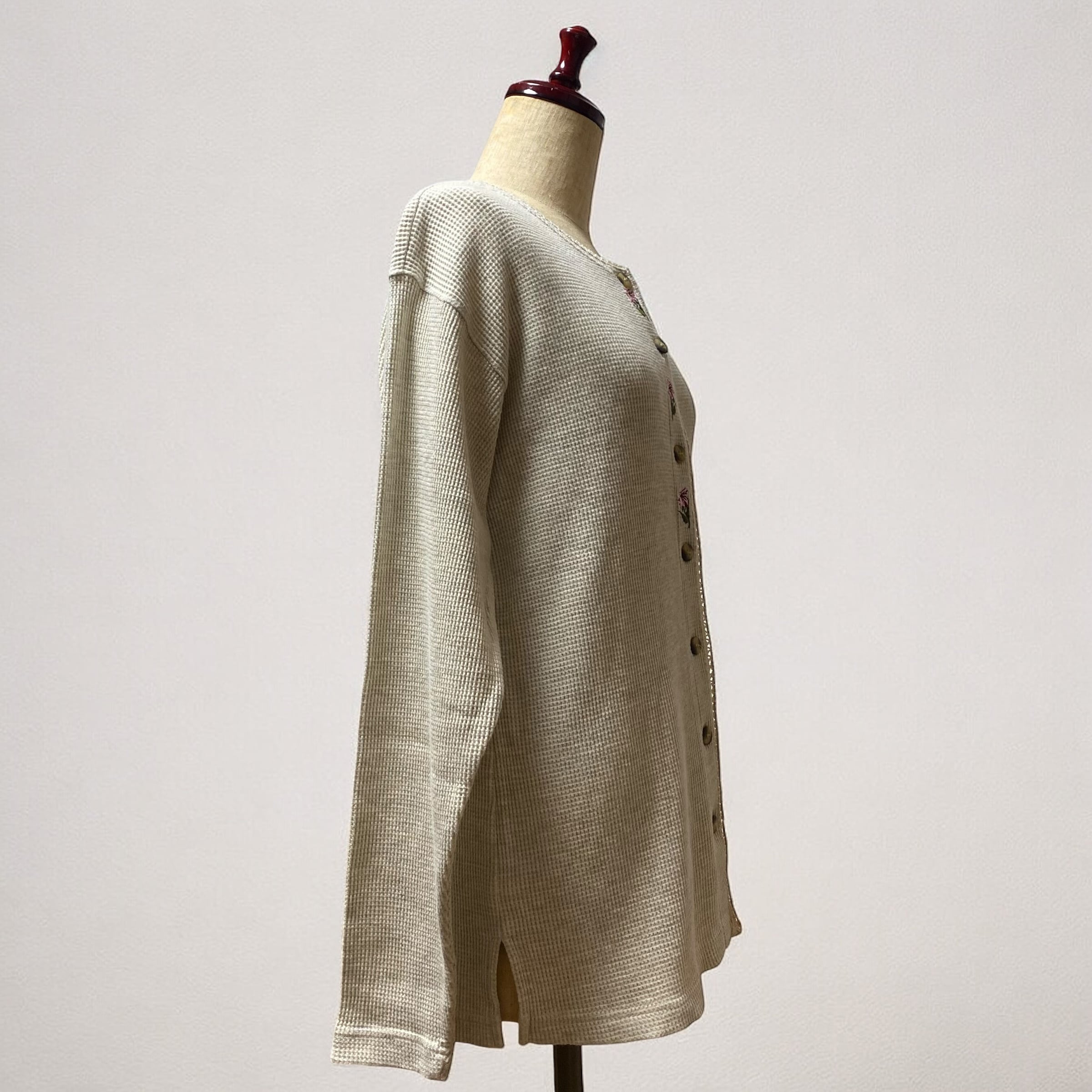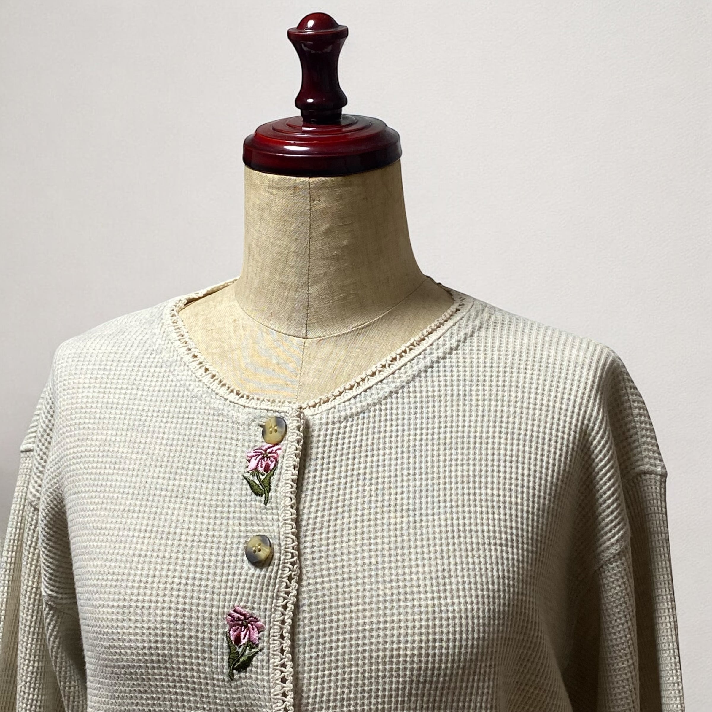 フローラル刺繍が入ったワッフルサーマルカーディガンです。