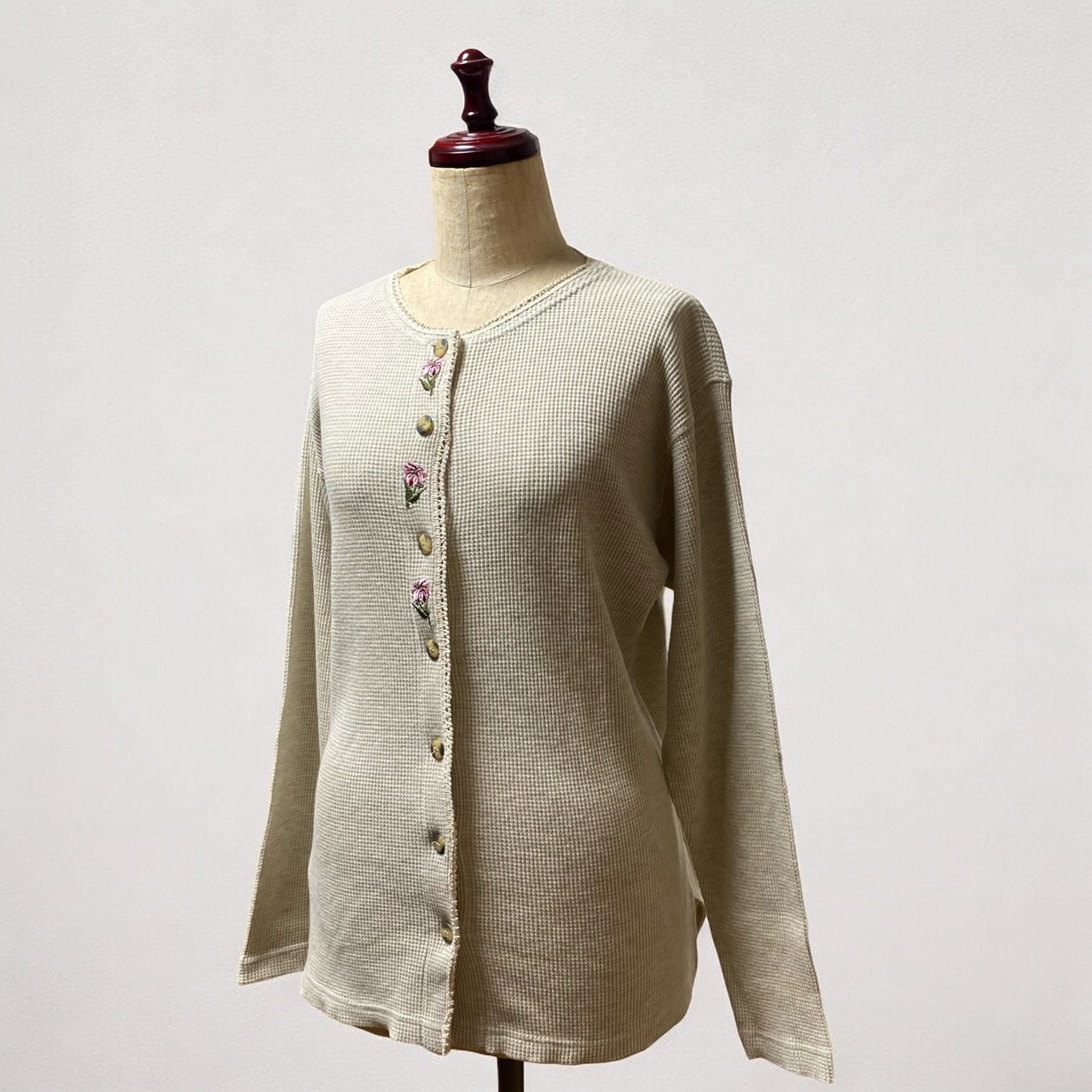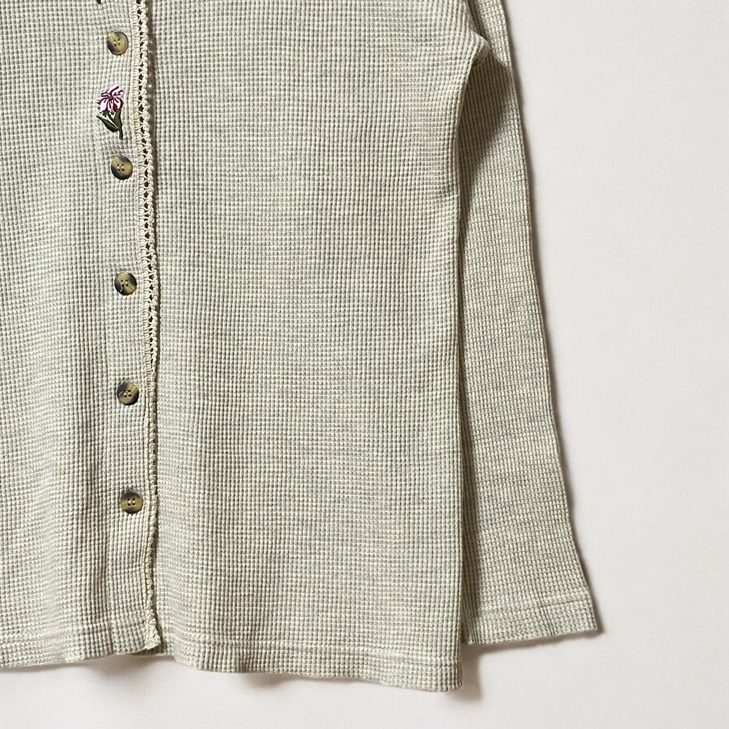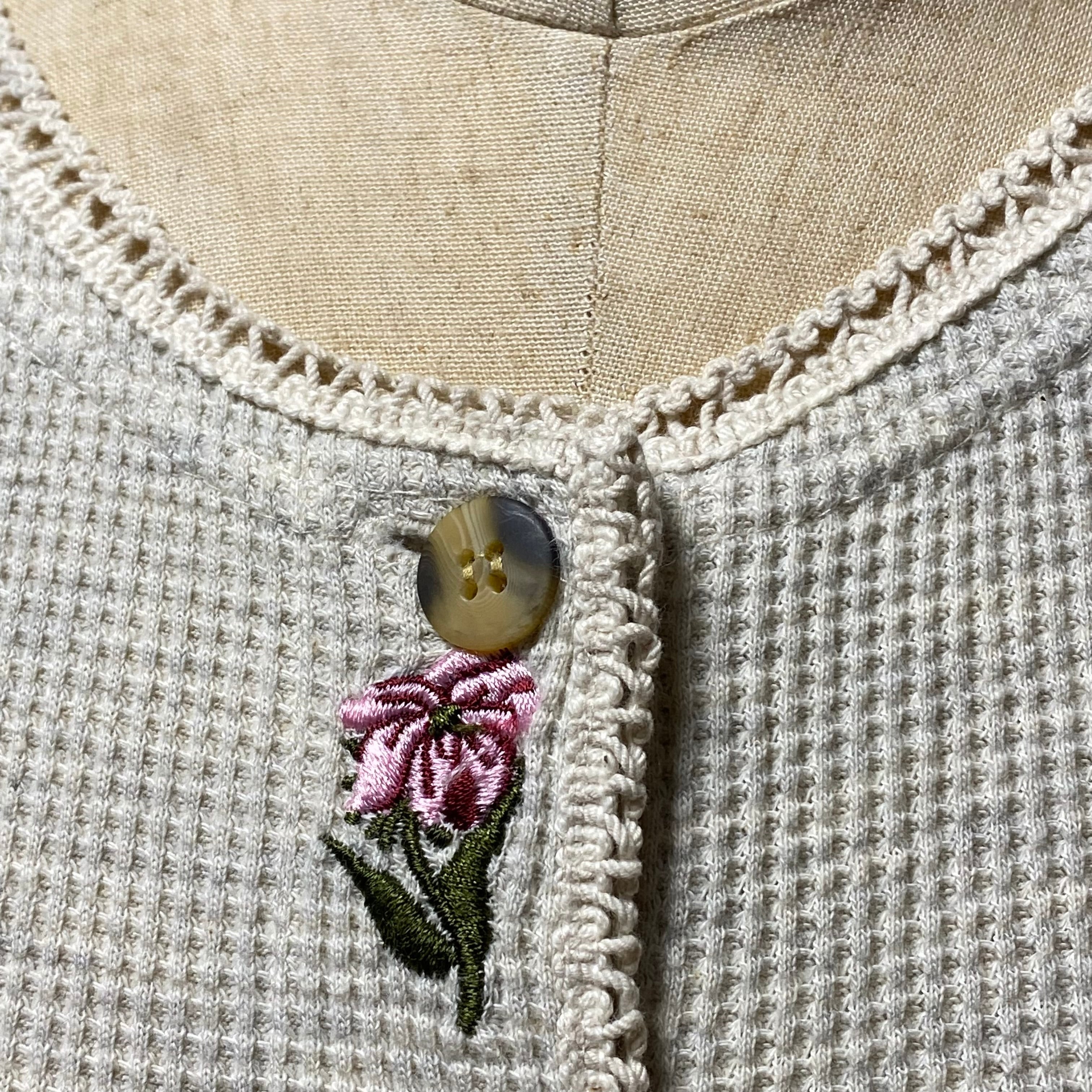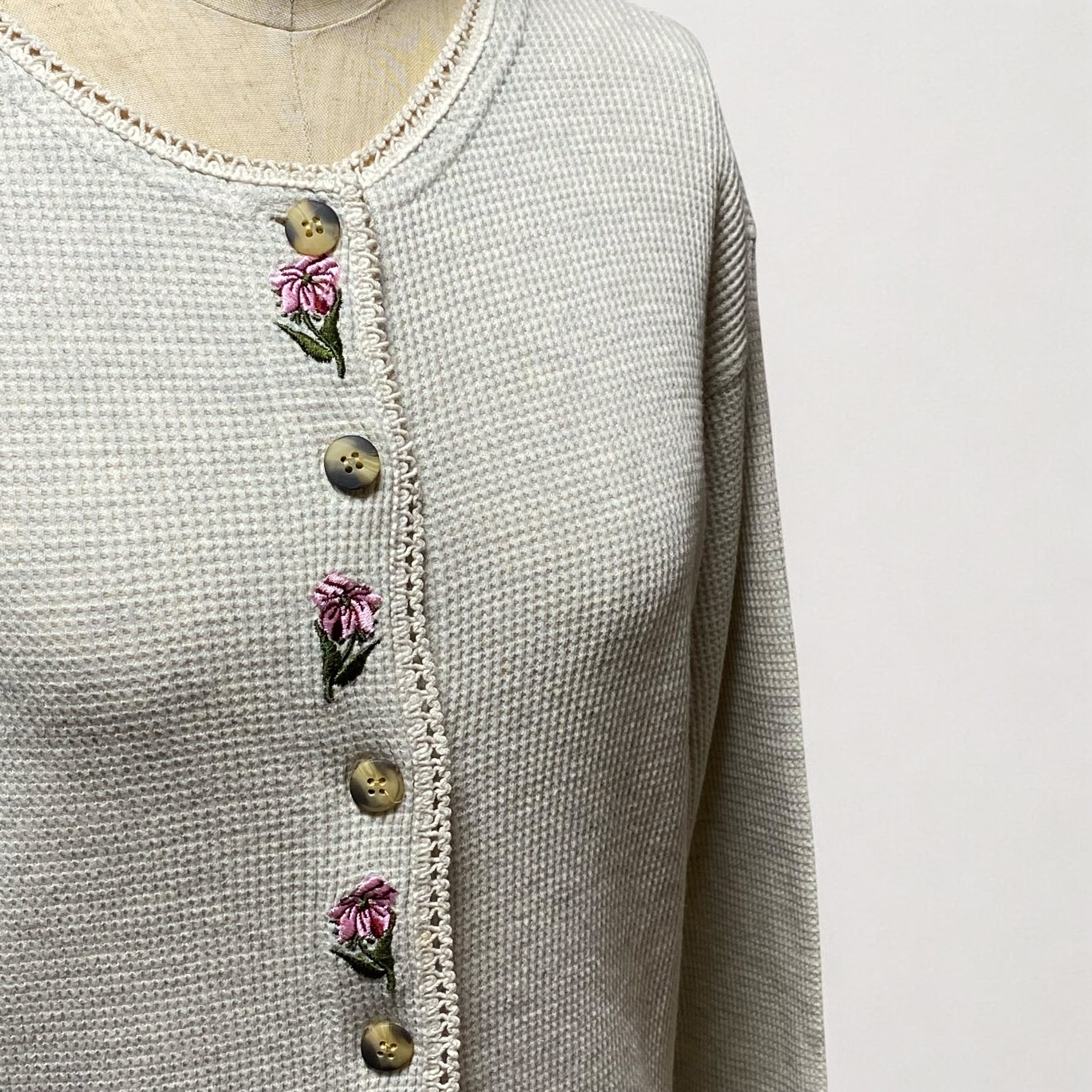 フローラル刺繍が入ったワッフルサーマルカーディガンです。