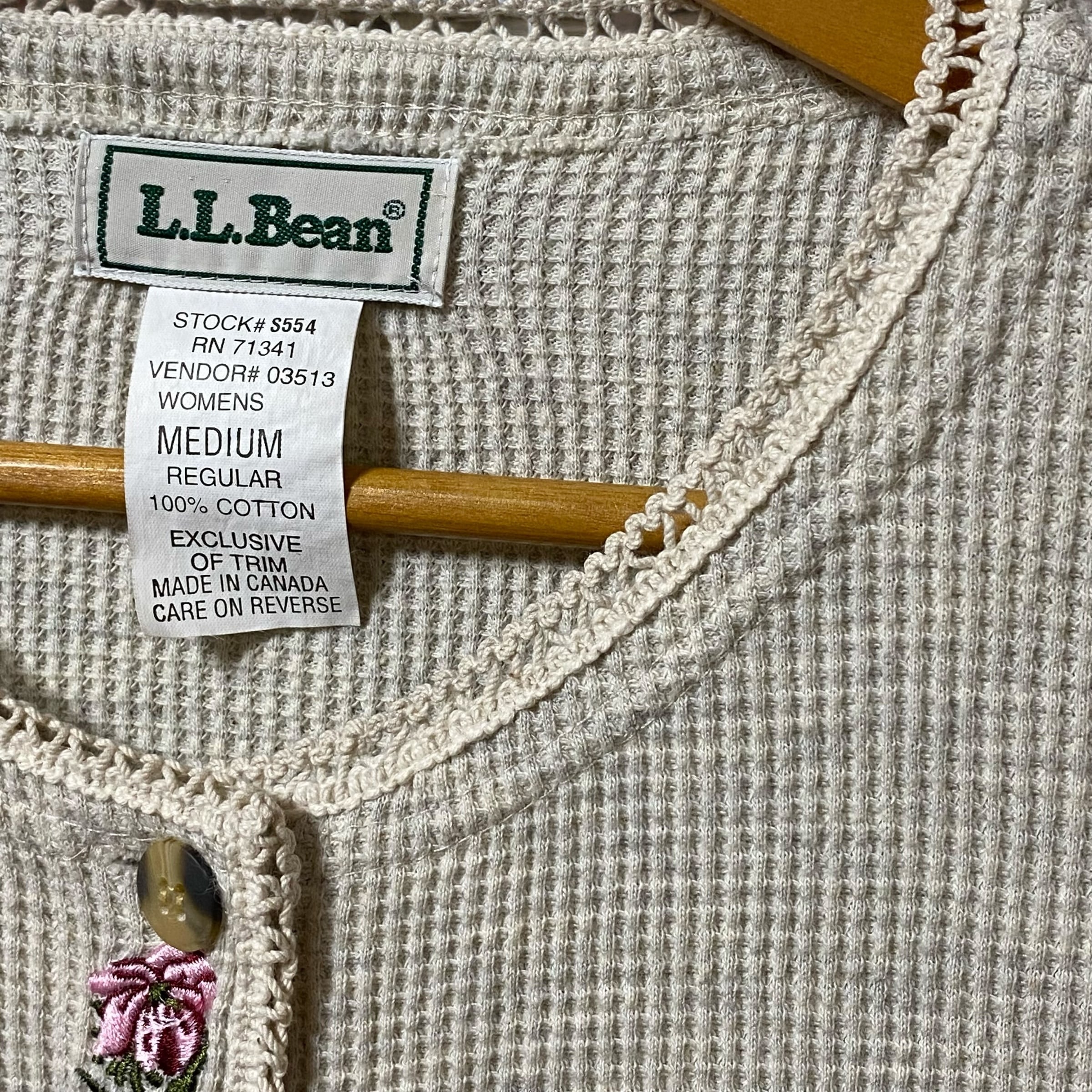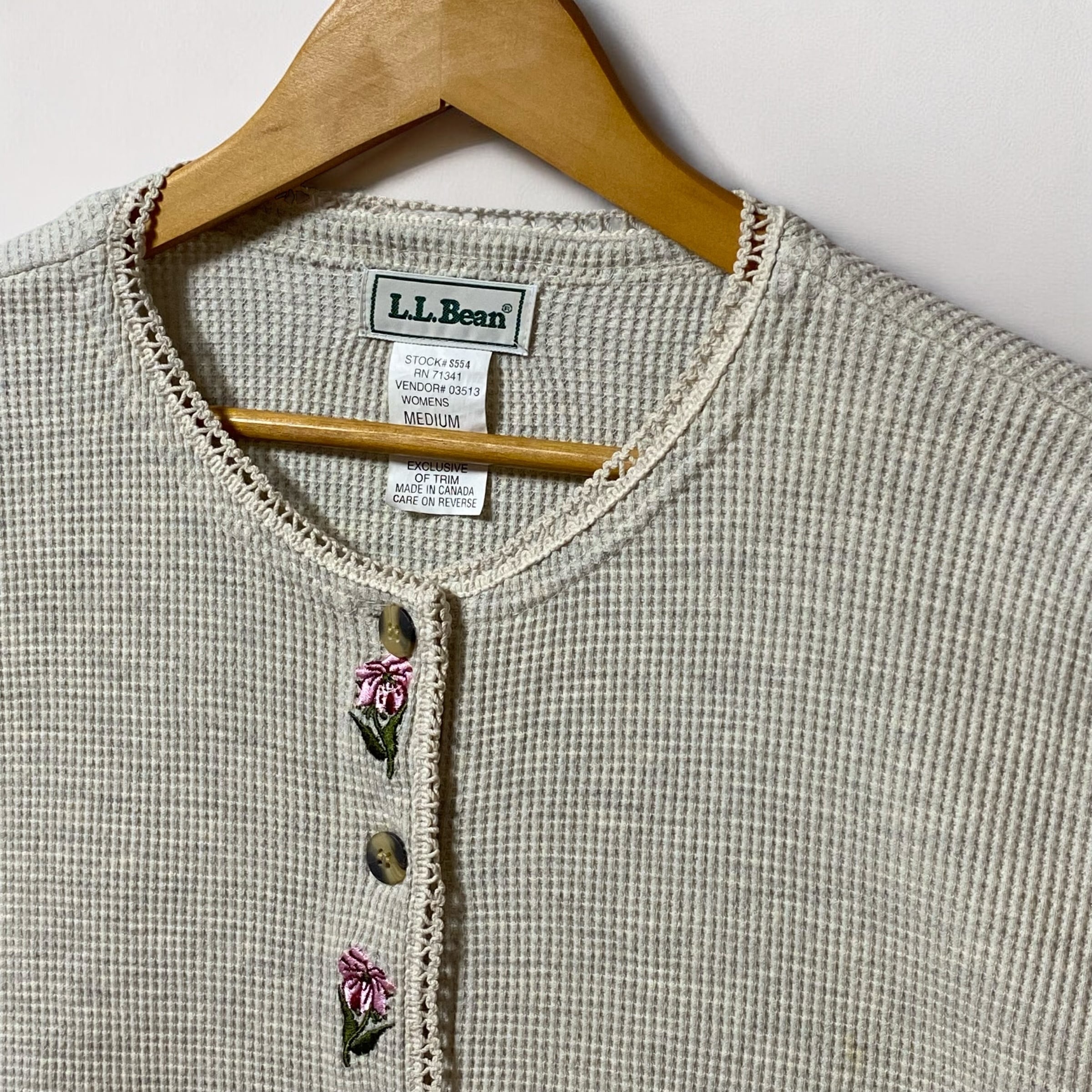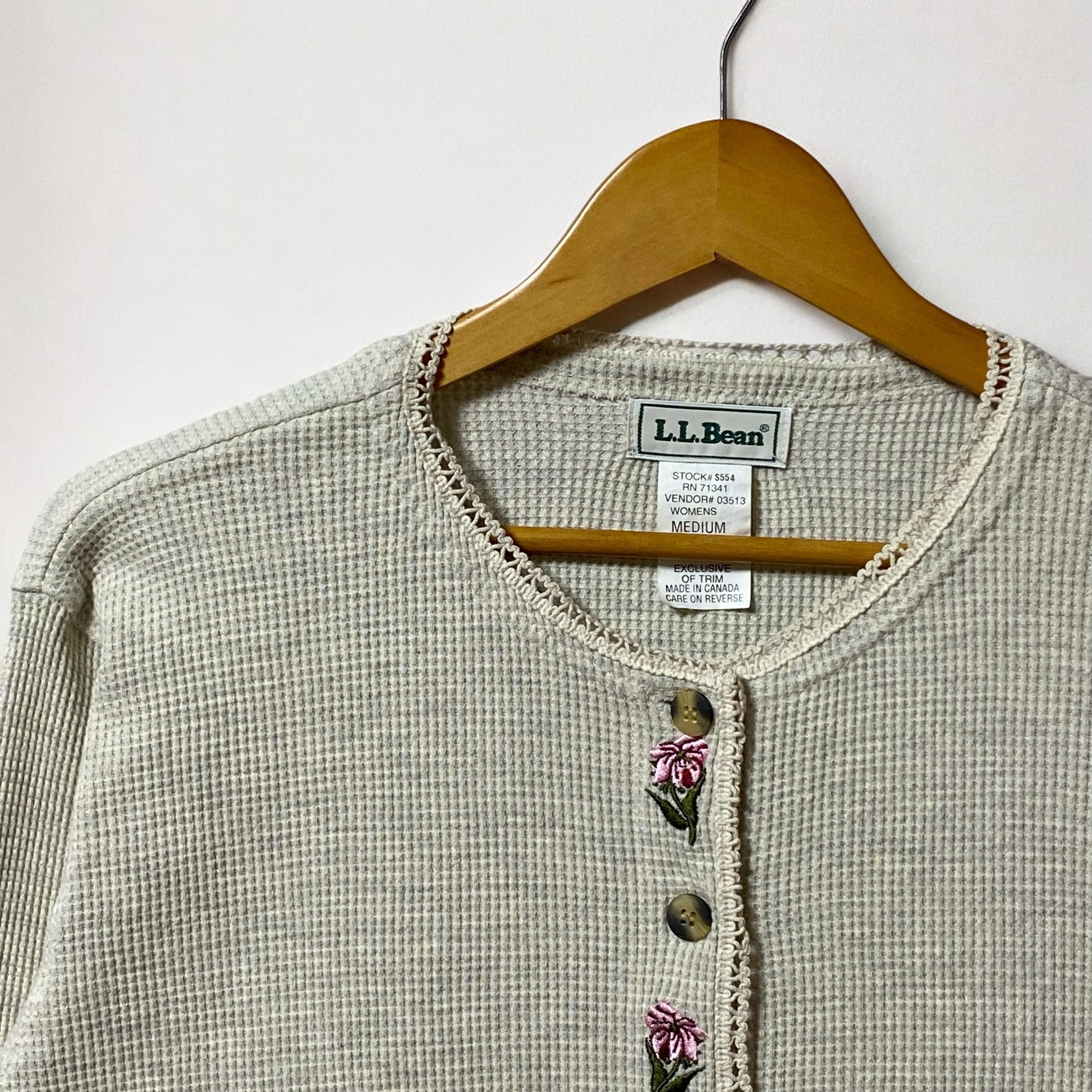 【For Women's】1980s〜90s "L.L.Bean" Floral Embroidery Waffle Thermal Cardigan MADE IN CANADA