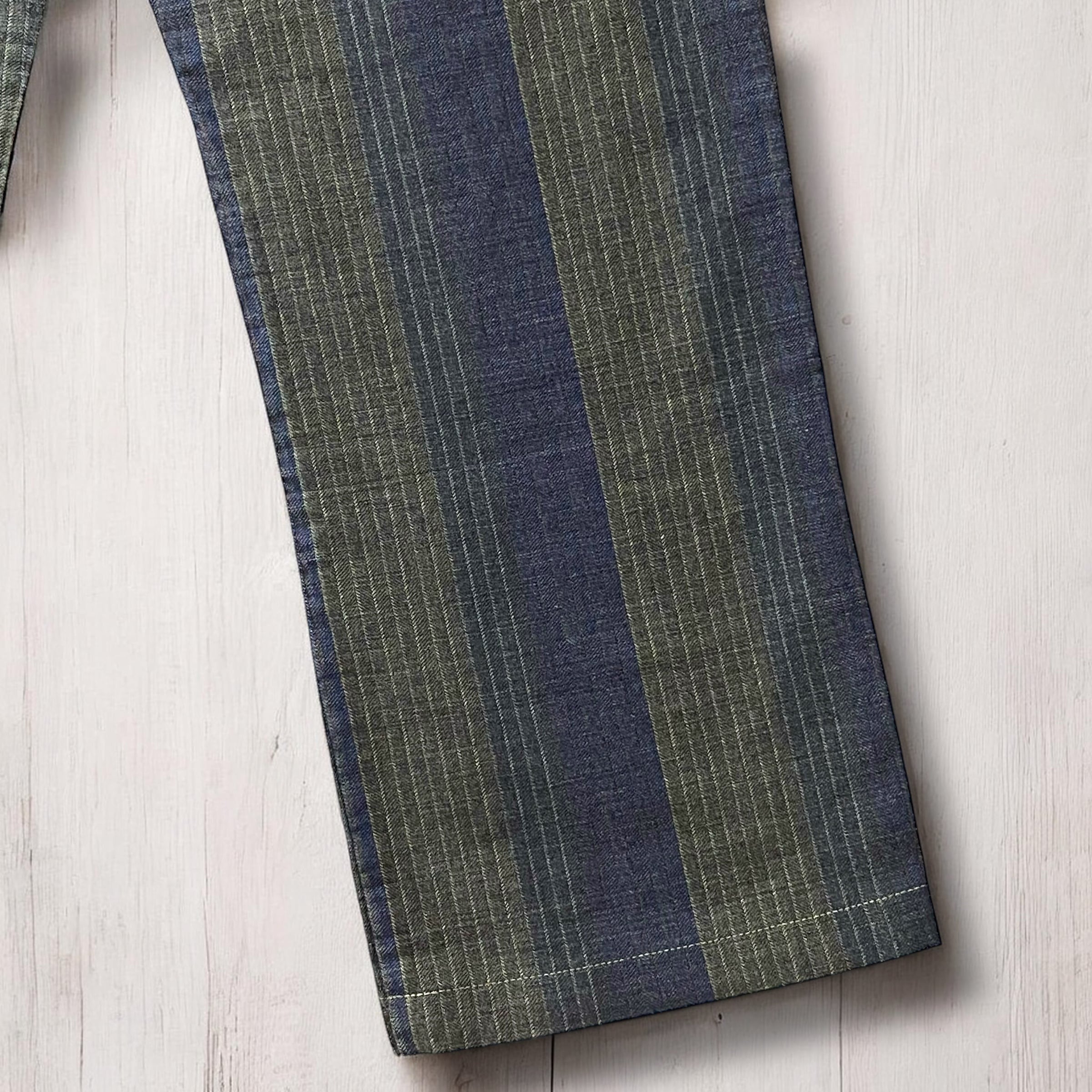 インディゴとグレーをベースとしたストライプに、ブラウンやカーキといった色味の複数の糸で構成されたステッチワークが非常に秀逸で、