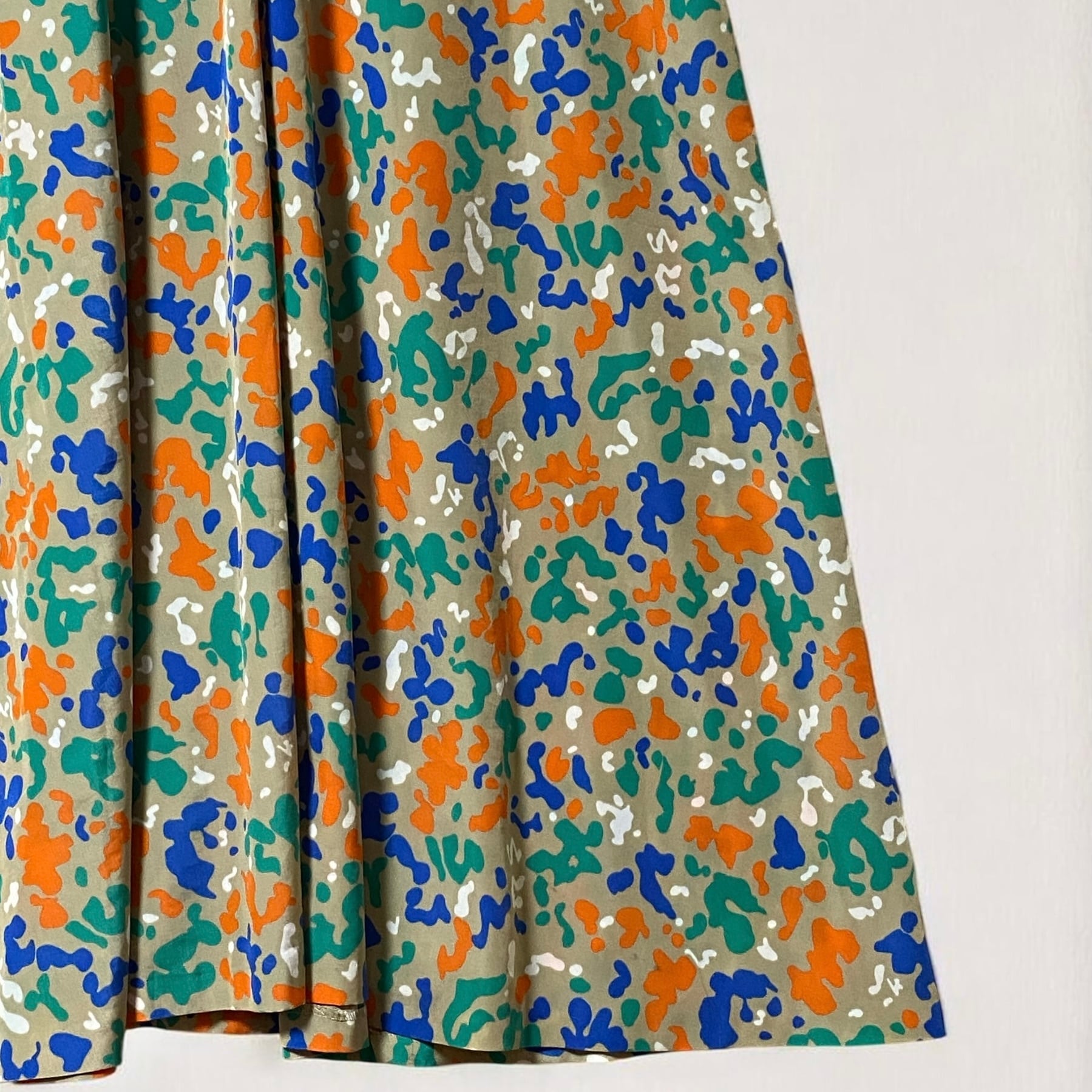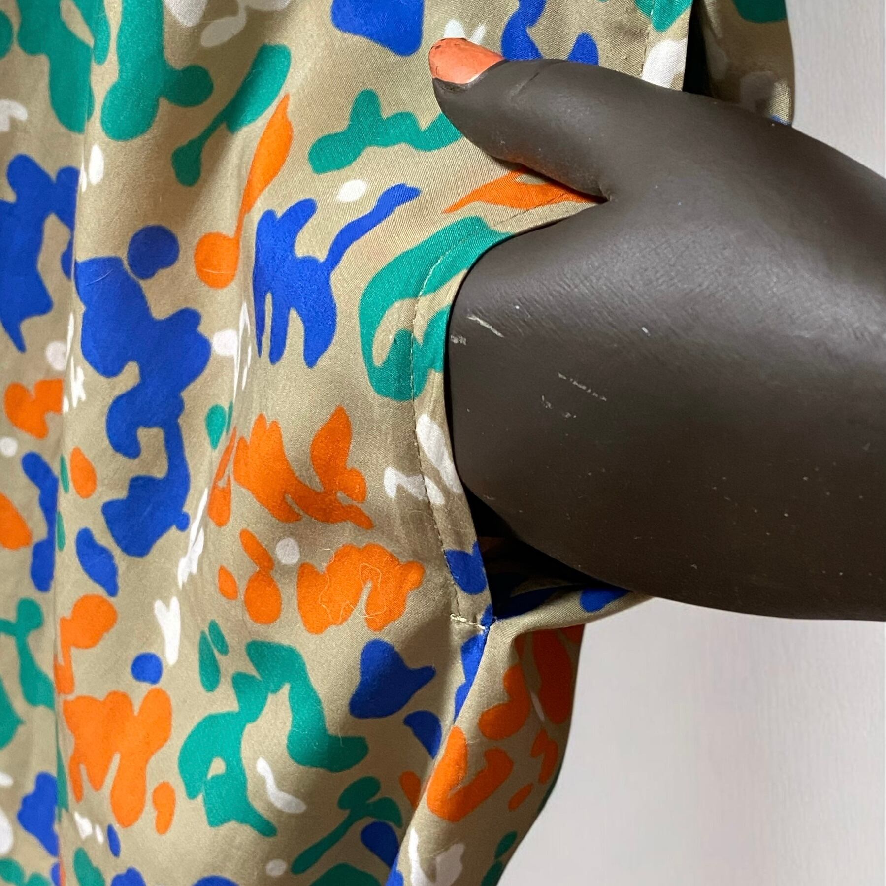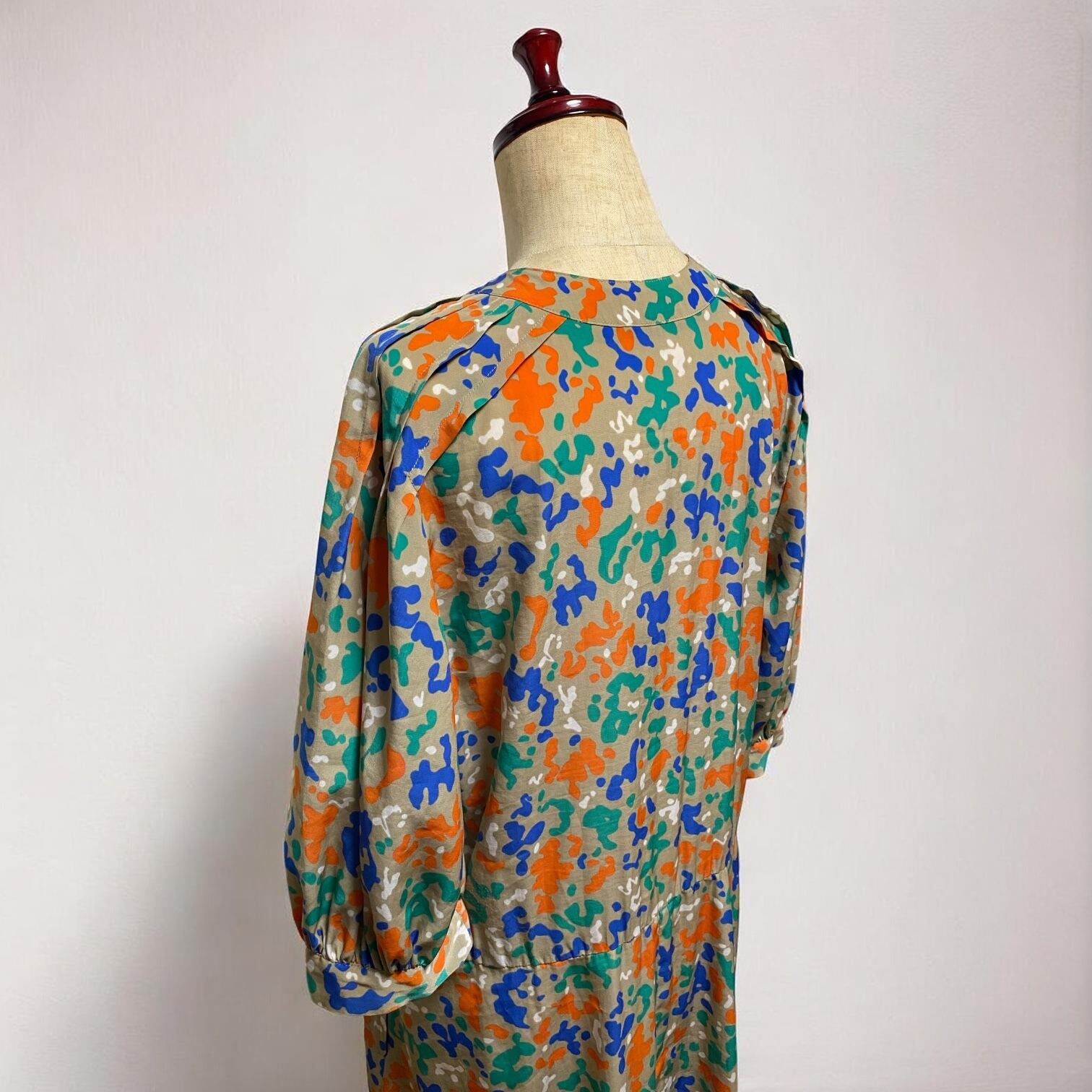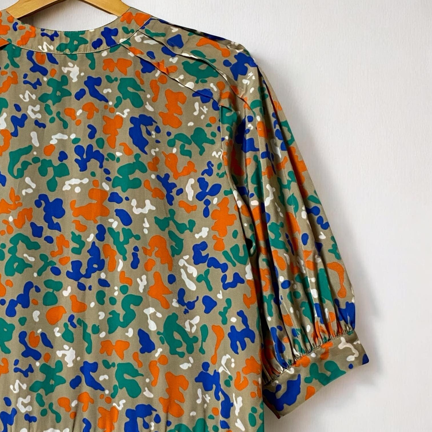 柄は勿論、ギャザーが入る袖や、肩部分のピンタック、美しいAラインのシルエットなどのディテールも大変素晴らしい一枚です。