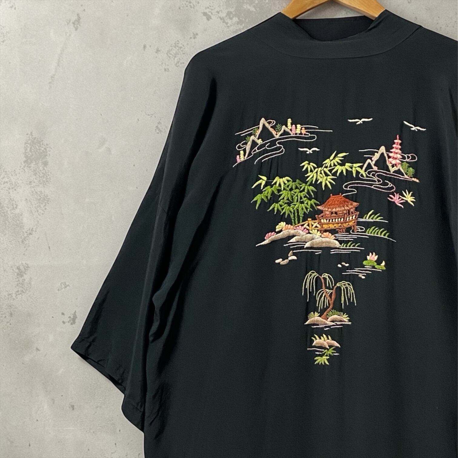 動きの中から生み出されるブラックレーヨンの美しいドレープ感に、職人による色彩豊かなアート刺繍が、これまた美しく映えます◎