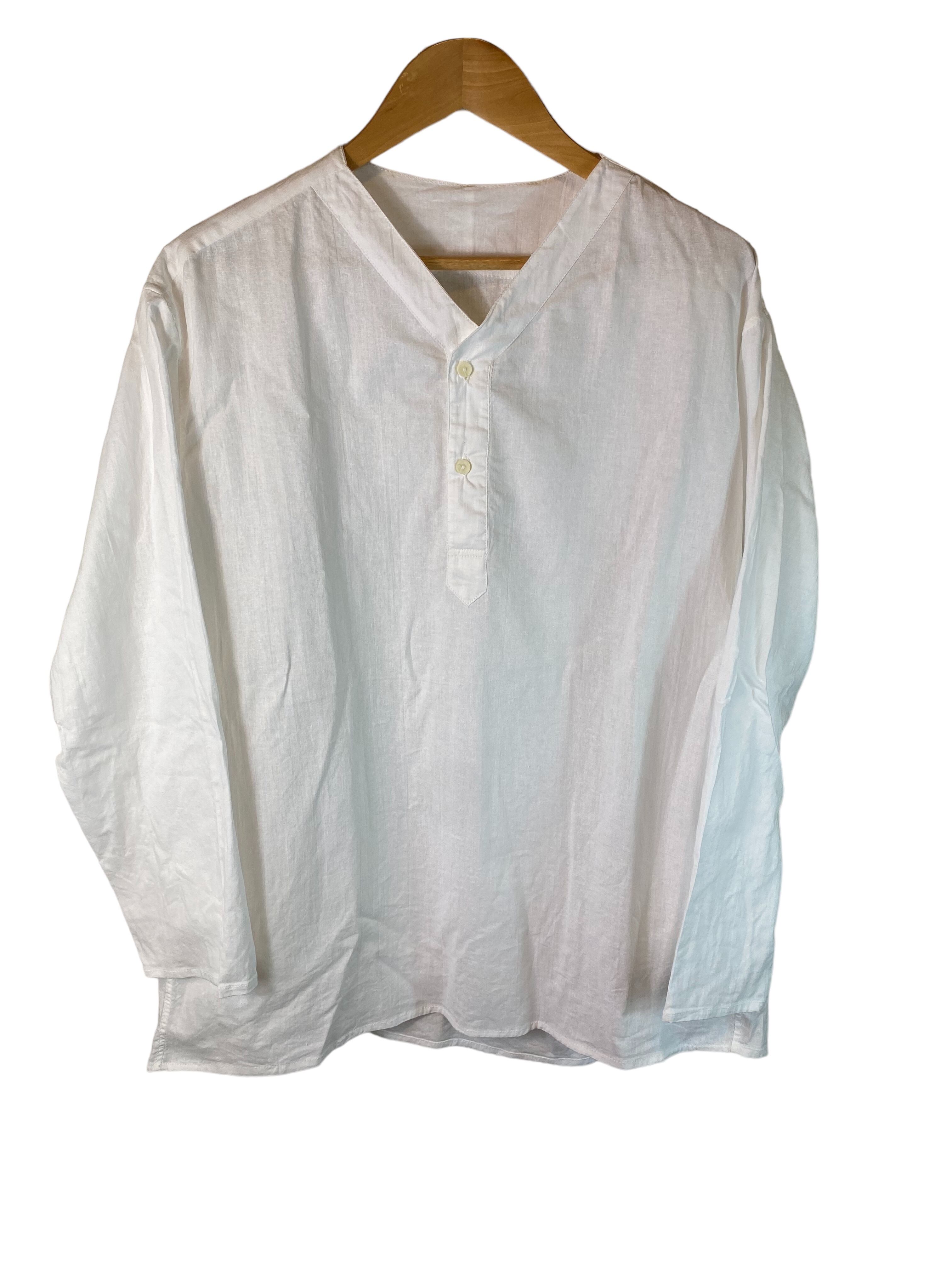 首元は浅いV襟のヘンリーネック仕様。セットインスリーブで、オンスの低いコットン100%のサラりとした生地を使用。