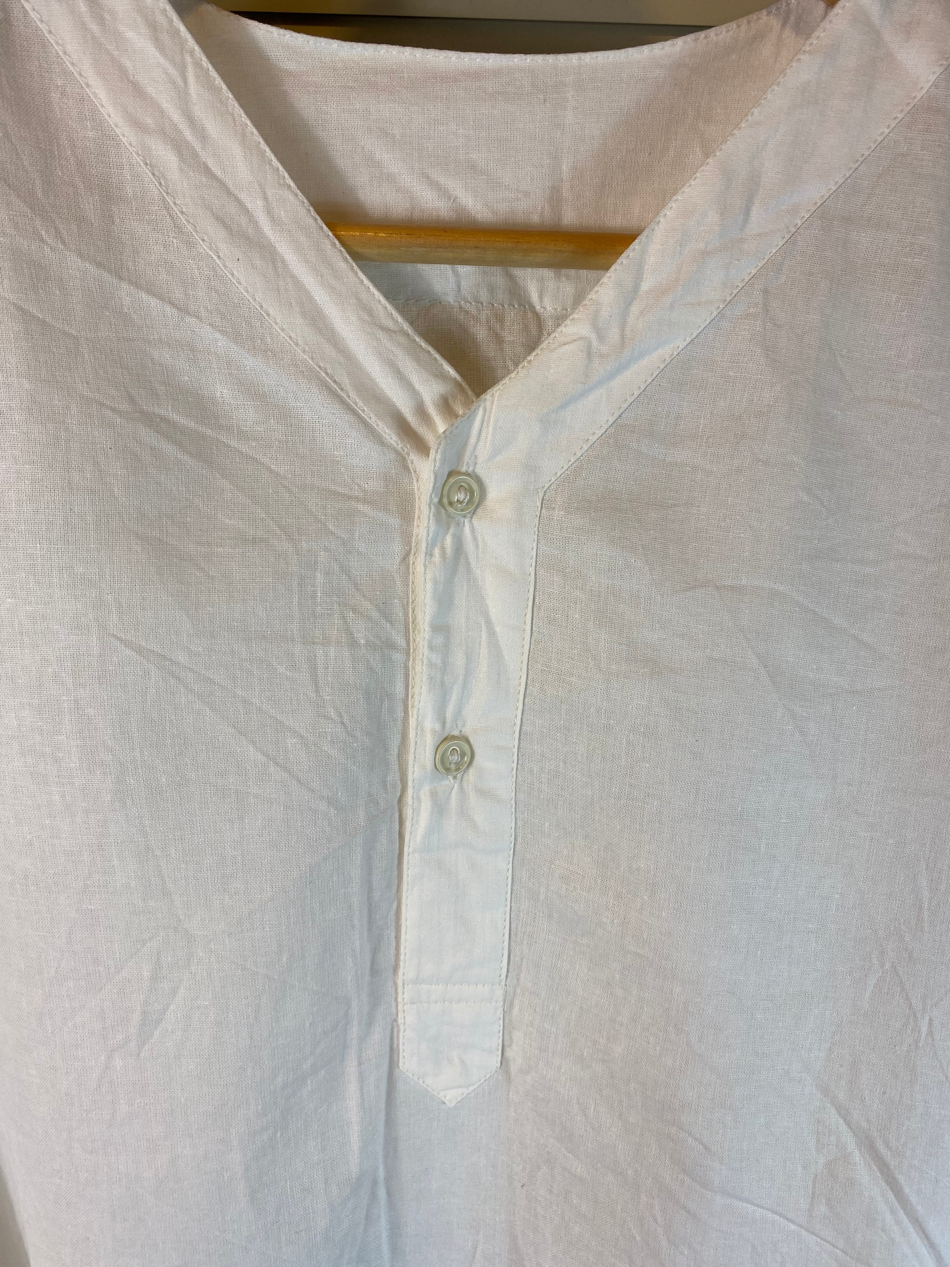 首元は浅いV襟のヘンリーネック仕様。セットインスリーブで、オンスの低いコットン100%のサラりとした生地を使用。