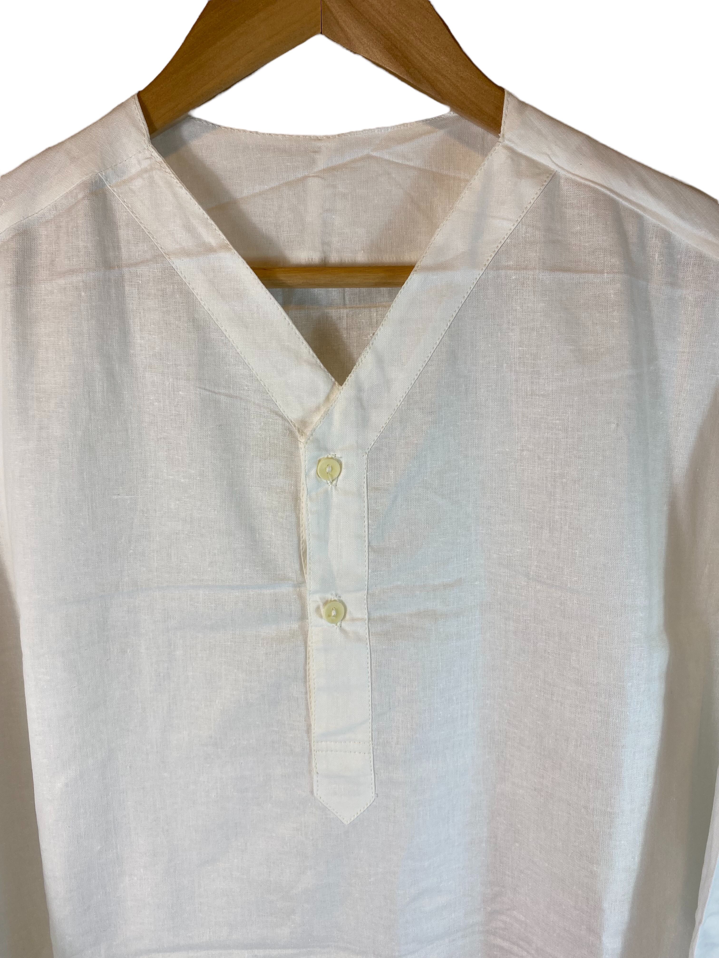 首元は浅いV襟のヘンリーネック仕様。セットインスリーブで、オンスの低いコットン100%のサラりとした生地を使用。