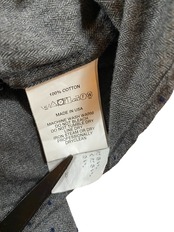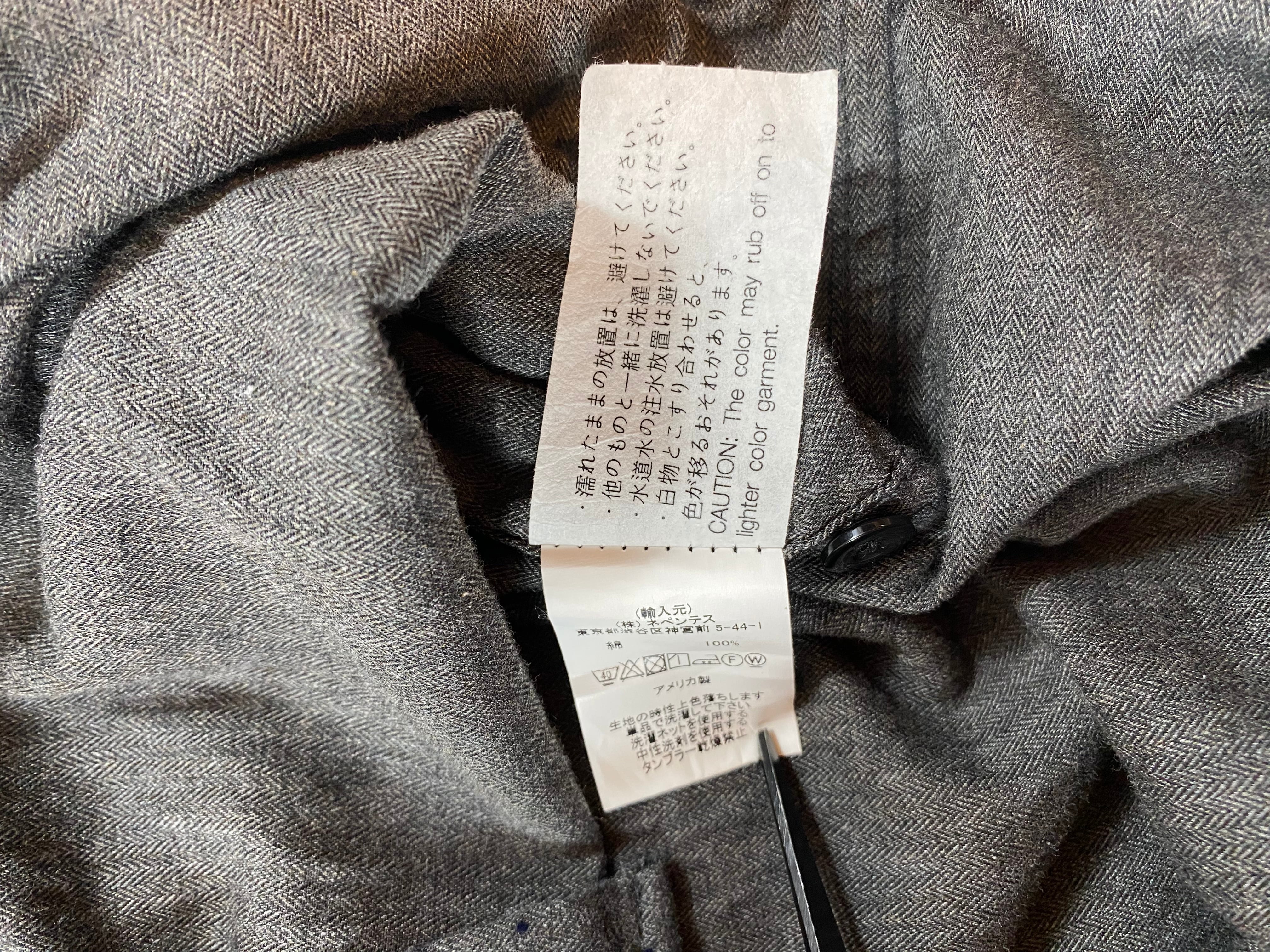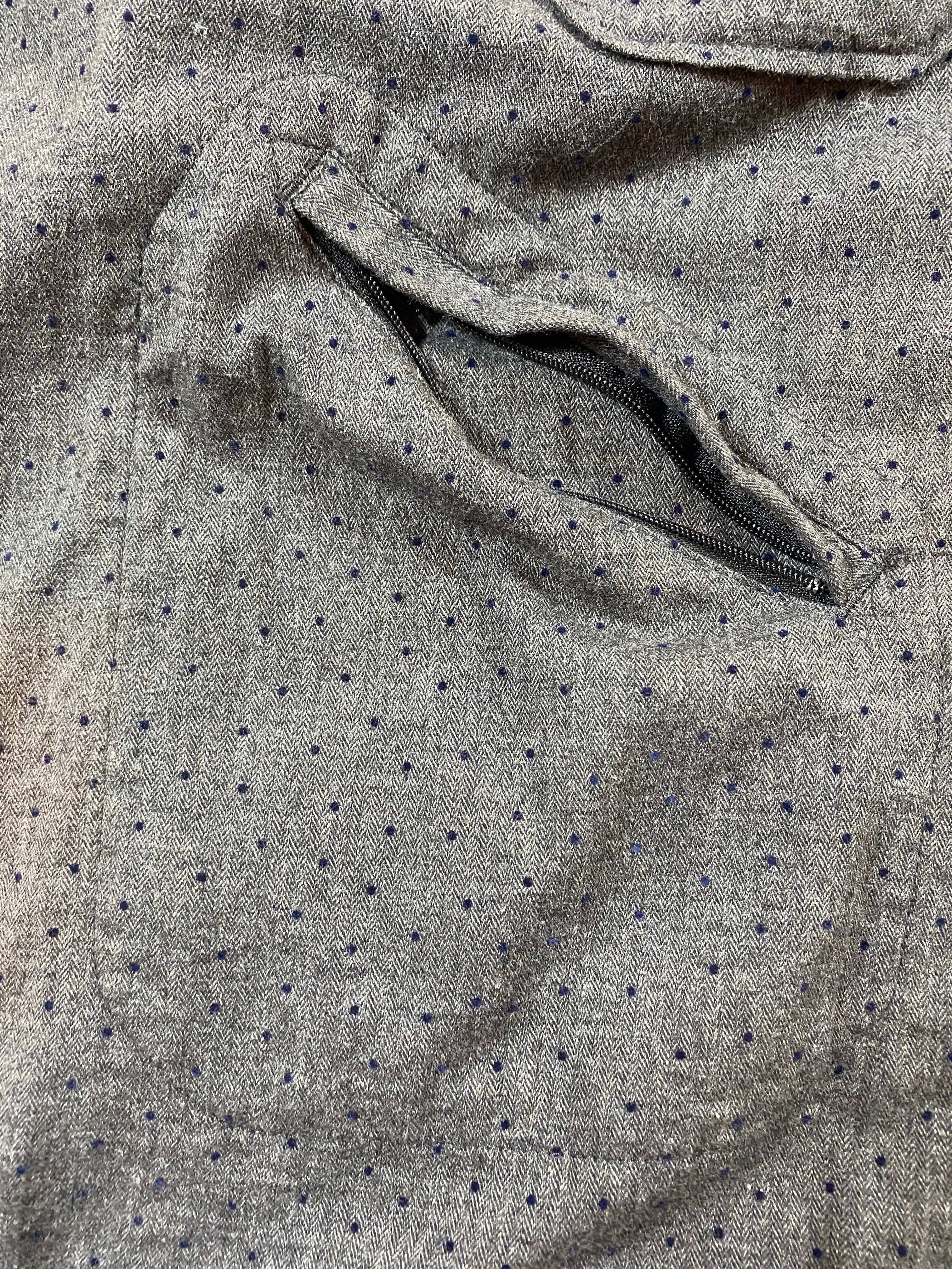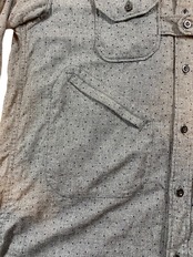 こちらも、例に漏れずな一枚で、落ち着いた色見のチャコールグレーベースのコットンヘリンボーン生地に、ポルカドット柄があしらわれたバンドカラーシャツに、左右で非対称な大きさのフラップポケット、右腹部付近にはジップ付きポケットが付き、胸部にはストラップが付くなど、