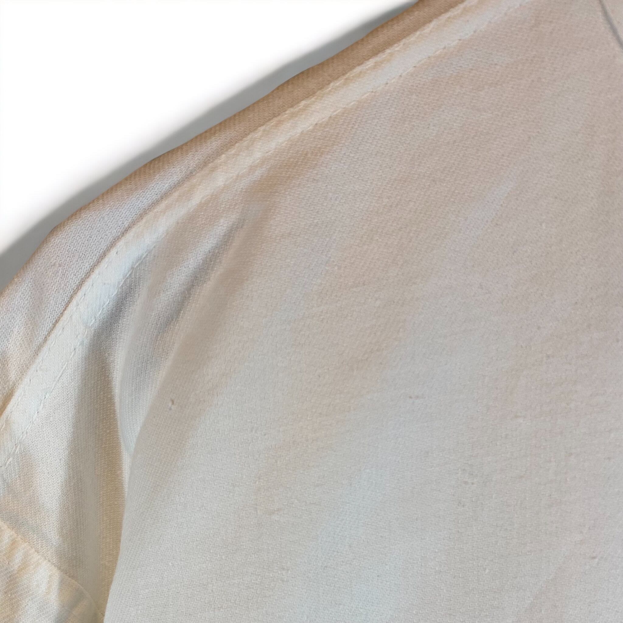 首元はヘンリーネック仕様。セットインスリーブで、やや厚めのコットン100%生地を使用。裏地はピーチスキンと言われる非常に柔らかい起毛で素肌に一枚で着ていただくと分かりますが、肌触りが最高です。