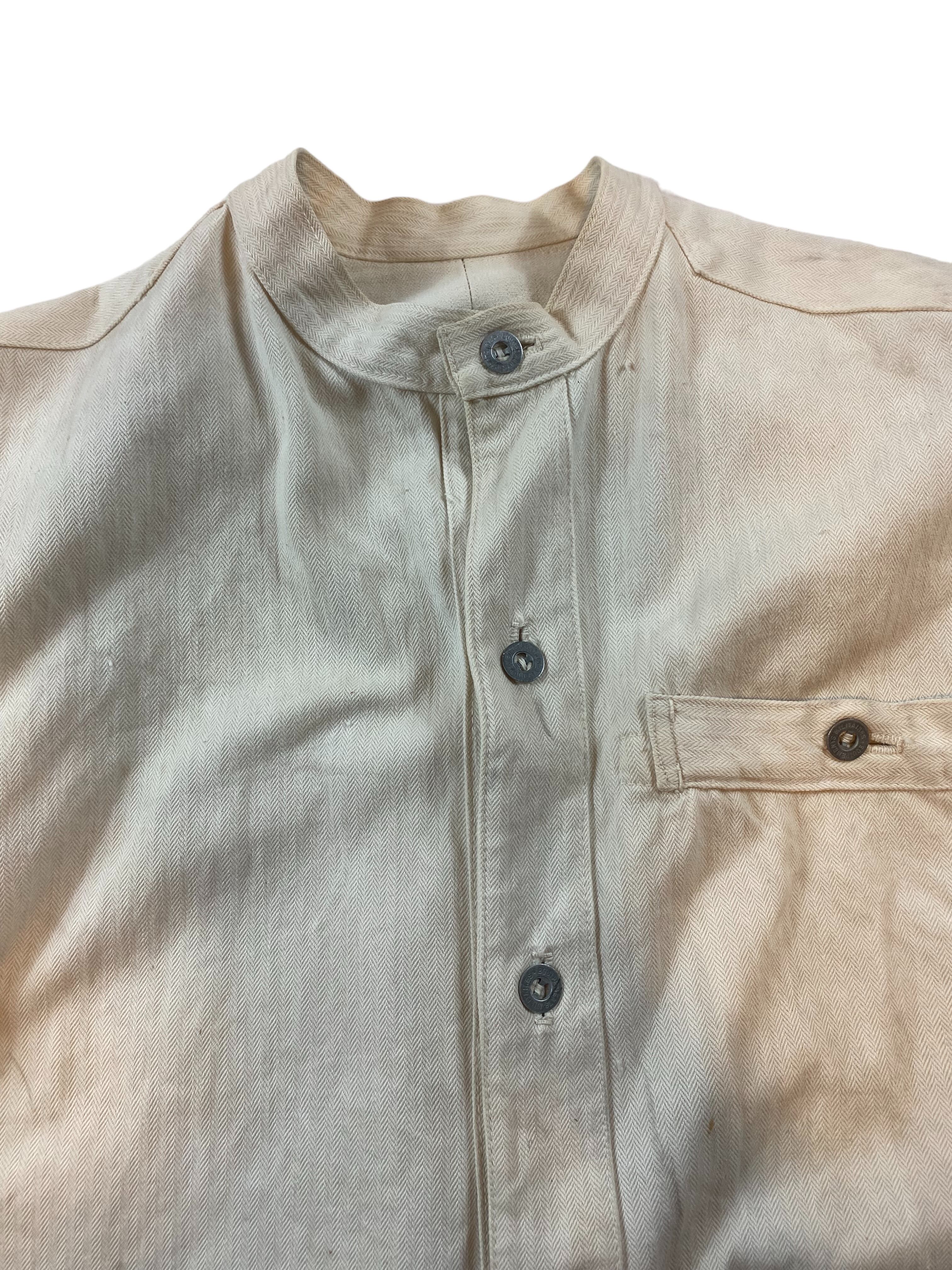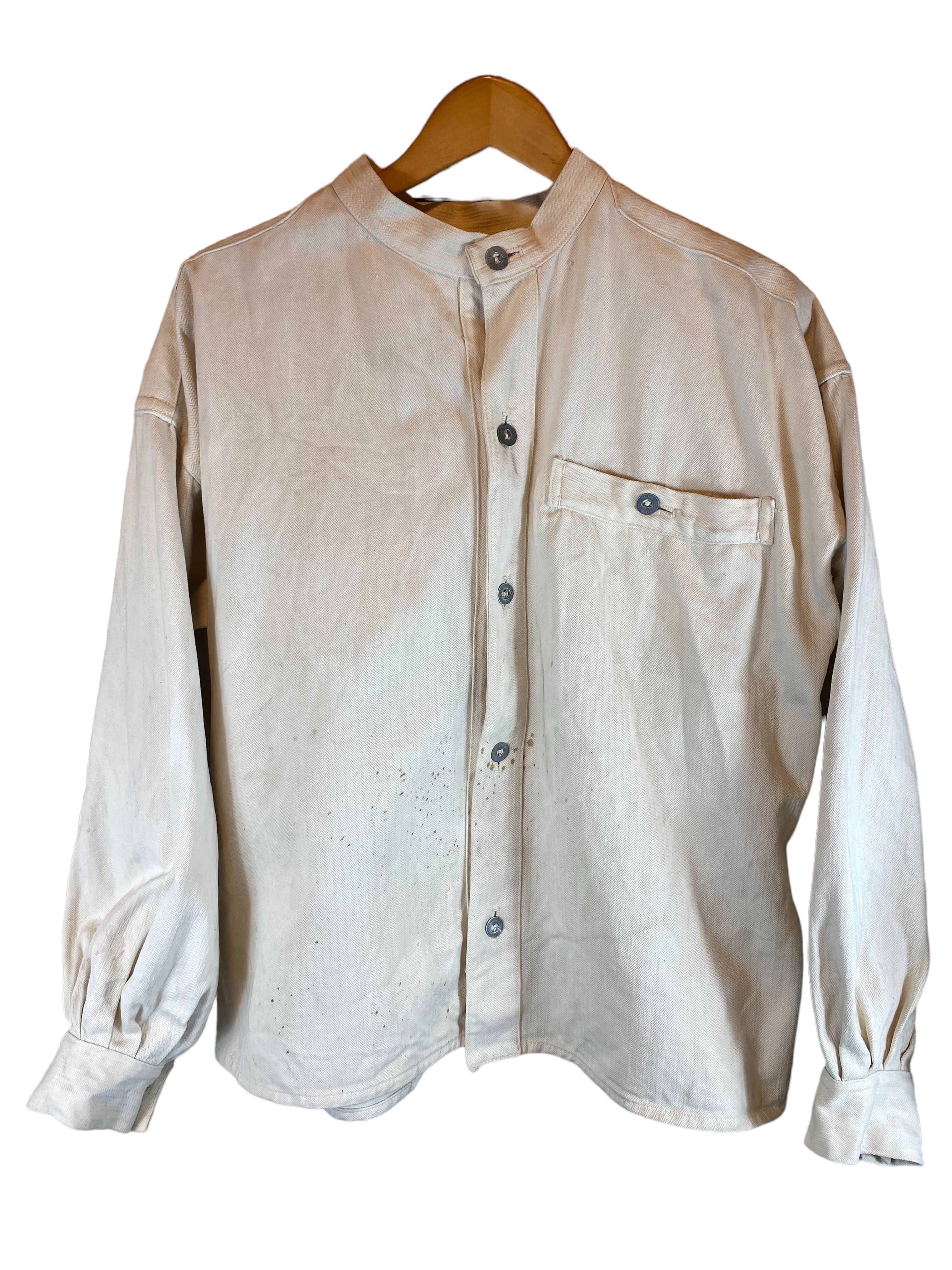 勿論当時のオリジナル。 フランス軍の作業用衣類の総称として用いられるBourgeron"ボージョン"や"ブルジョン"とも呼ばれます。様々な用途で使用され、プルオーバー、前開き、の仕様に分かれる他、マルタンガルの有無、襟の高さやファブリックの違いなど様々な仕様のモデルが存在をするフランス軍のビンテージ、アンティーク古着の中でも大変希少な個体として知られます。 また、生地はリネンの方が珍しい様に見られがちなのですが、素材としてはコットンの方が大分希少です。理由は当時リネンはフランス北部が一大生産地として有名ですが、コットンはフランス国内での栽培が非常に脆弱な為、輸入貿易に頼らざるをえなかった為とされています。
