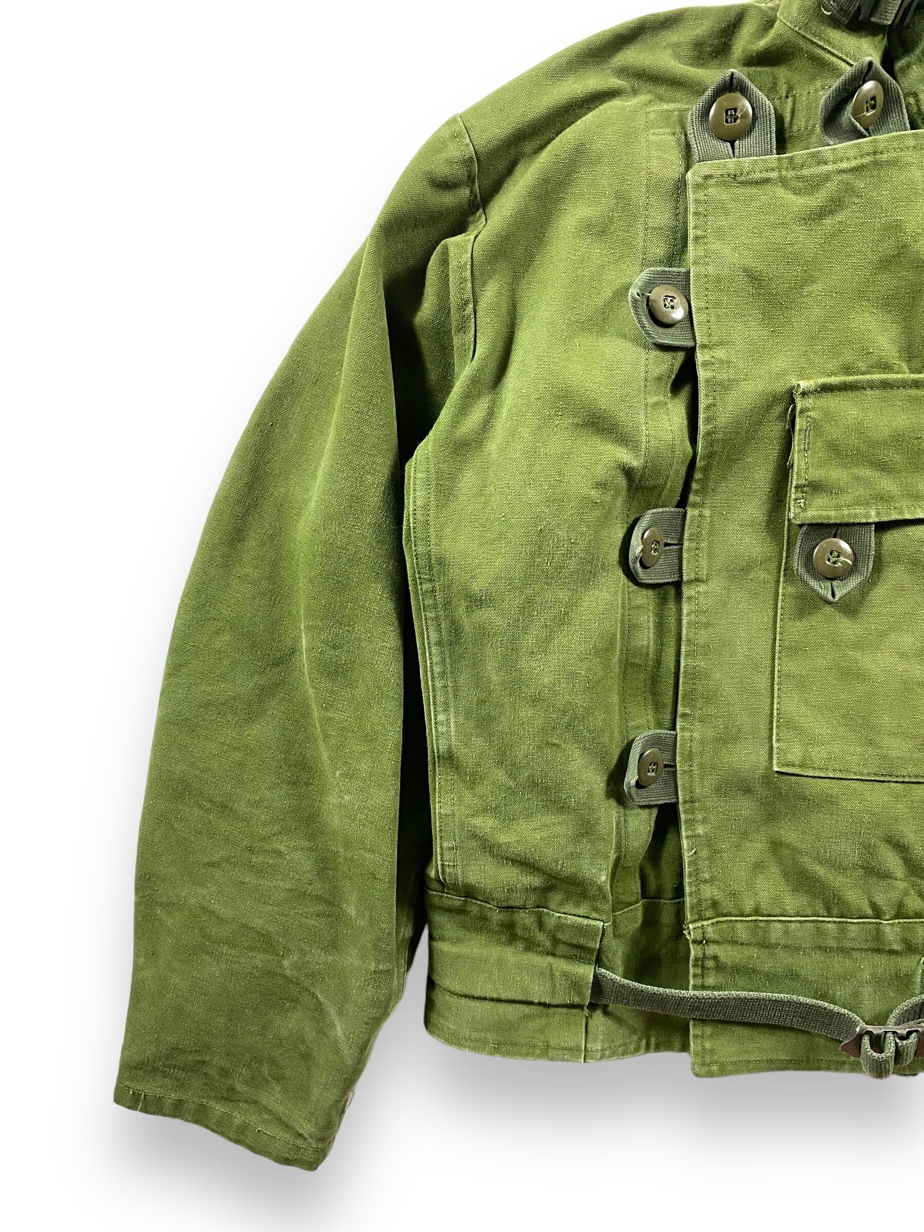 元々はバイク部隊のジャケットとして使用されていたこちら。防風性や保温性といった機能面は勿論、アシンメトリーなフロントの作りやストラップ機能等、デザイナーズブランド顔負けのデザイン性の高さで、とてもミリタリー物とは思えないルックスが最大の魅力でしょうか。