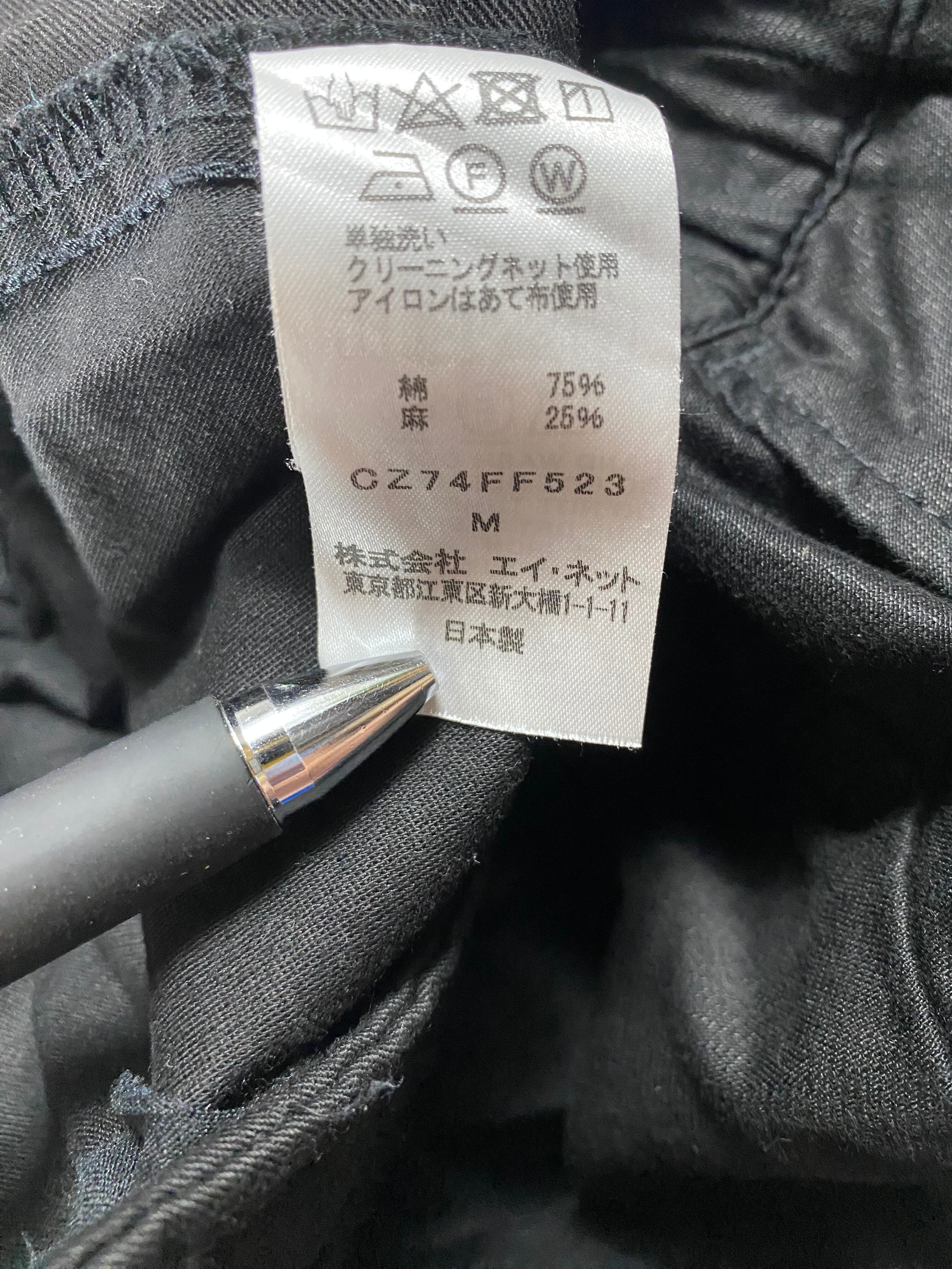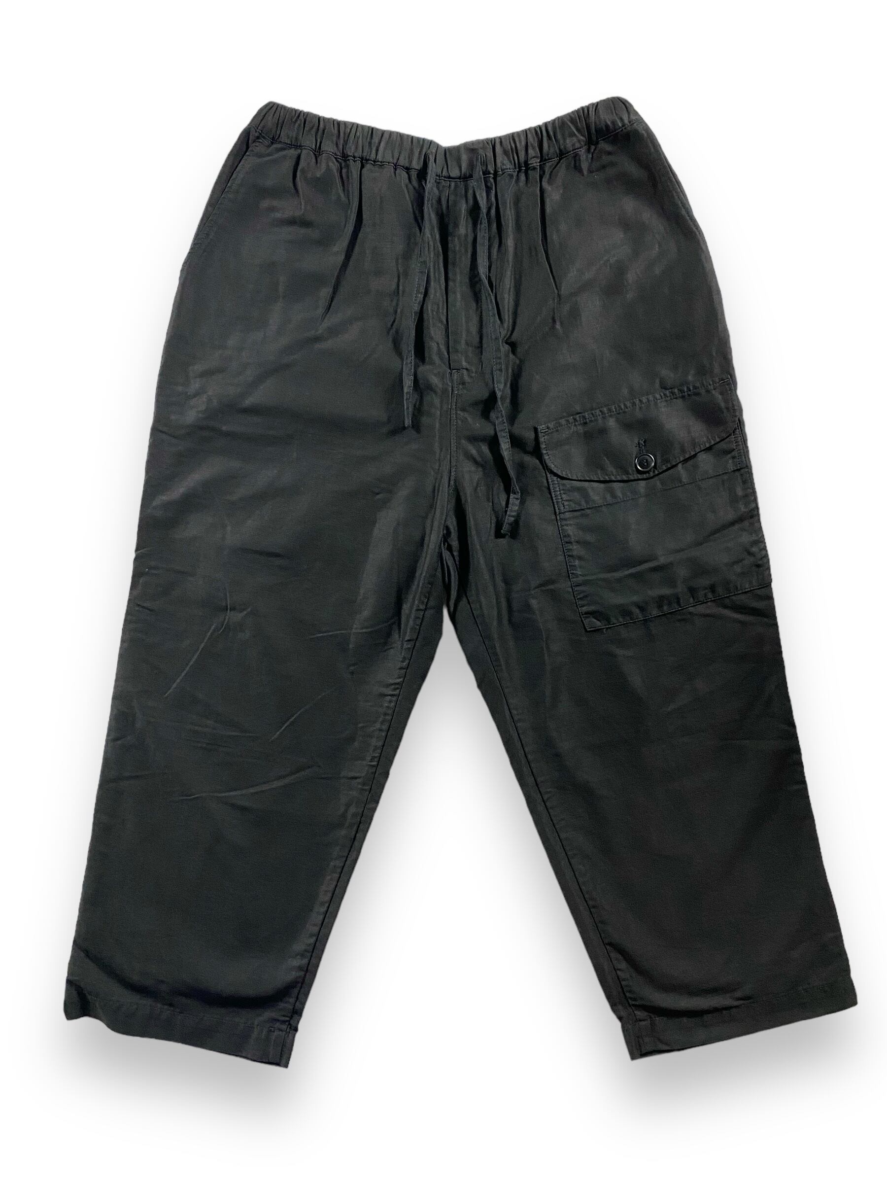 左フロント部にフラップ付きの大きなカーゴポケットが付く、1タック入りのワイドイージーパンツで、色は黒です。