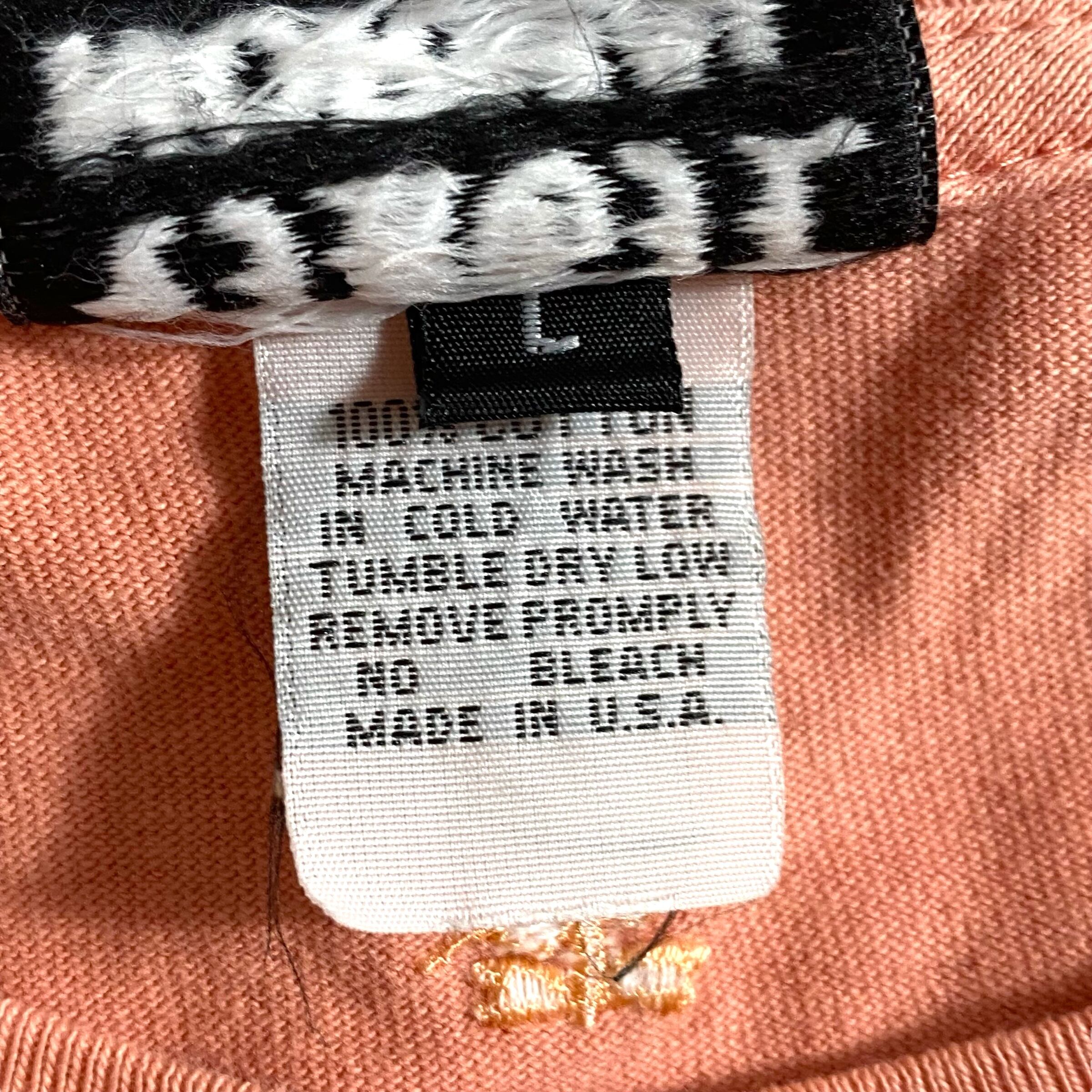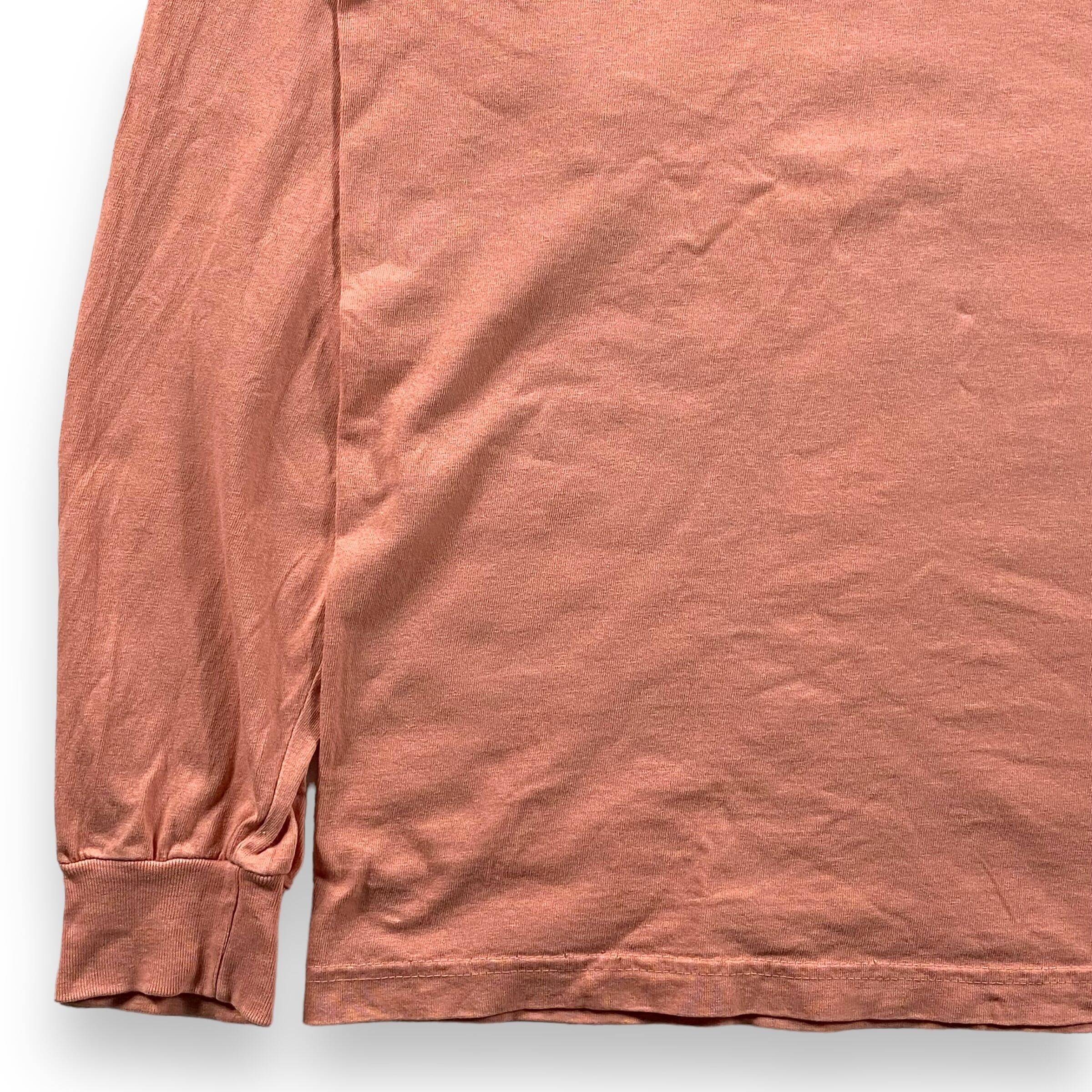 美しいサーモンカラーのガーメントダイが施されたアメリカ製のロンTで、らしさ満点のノリの良いプリントと刺繍が施された一枚。
