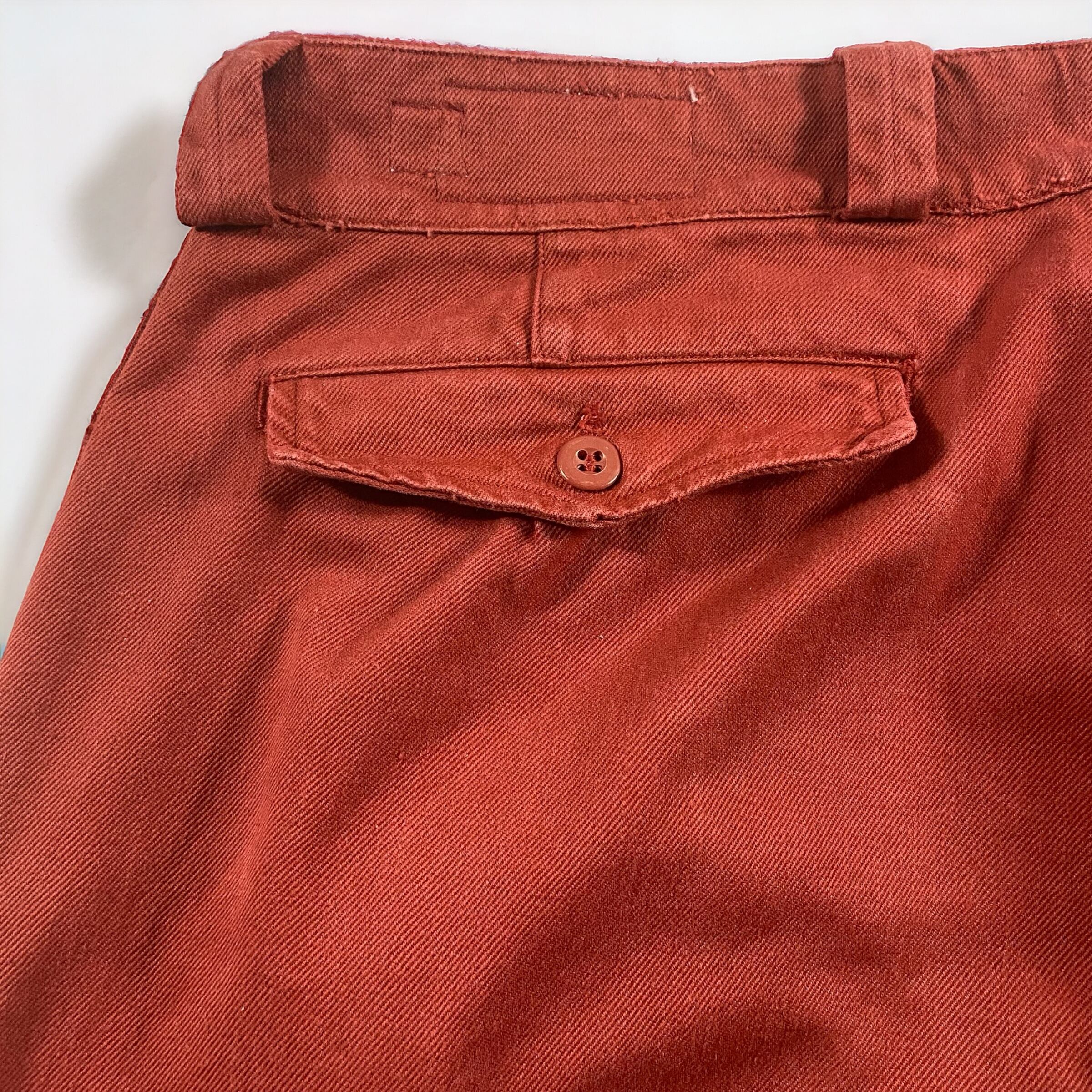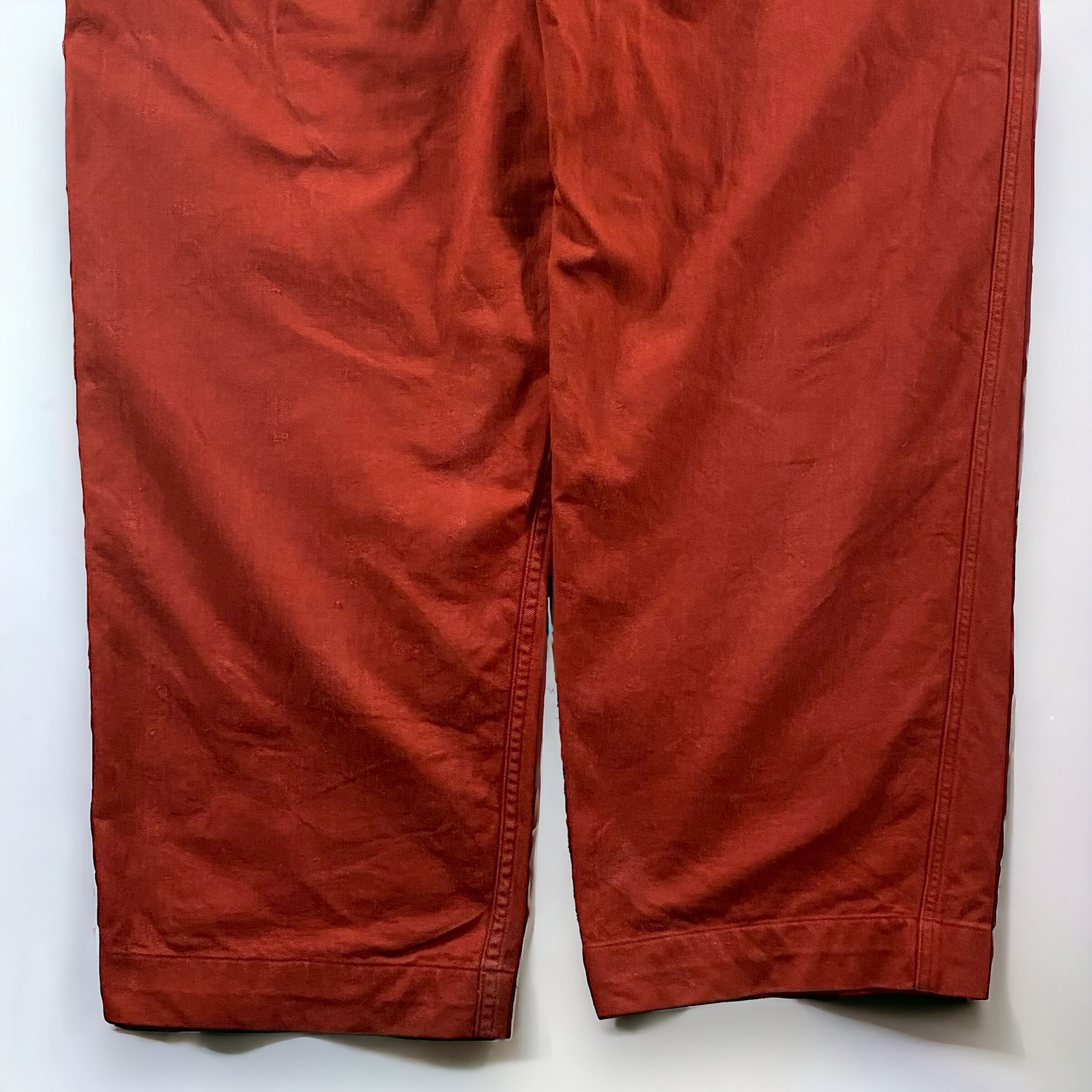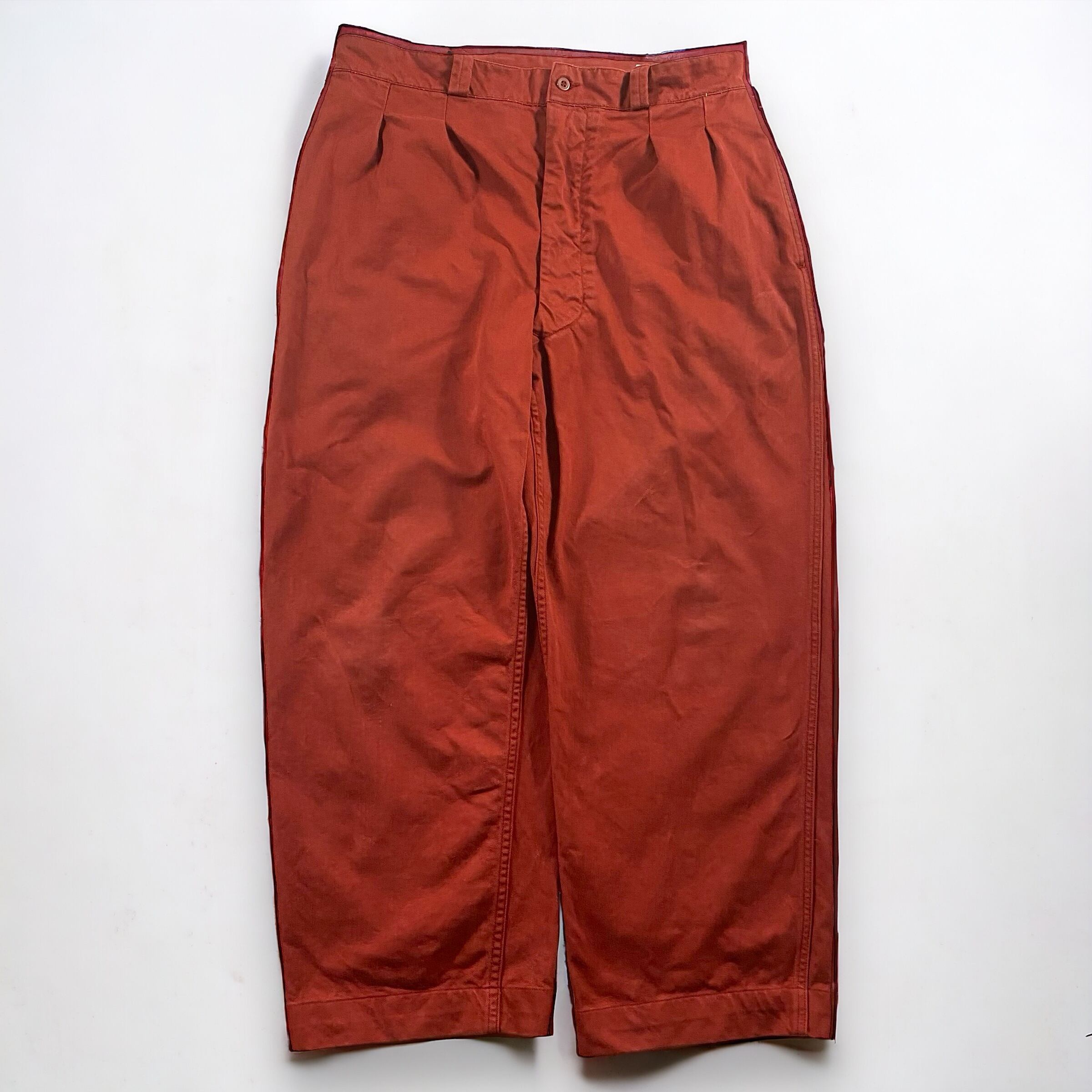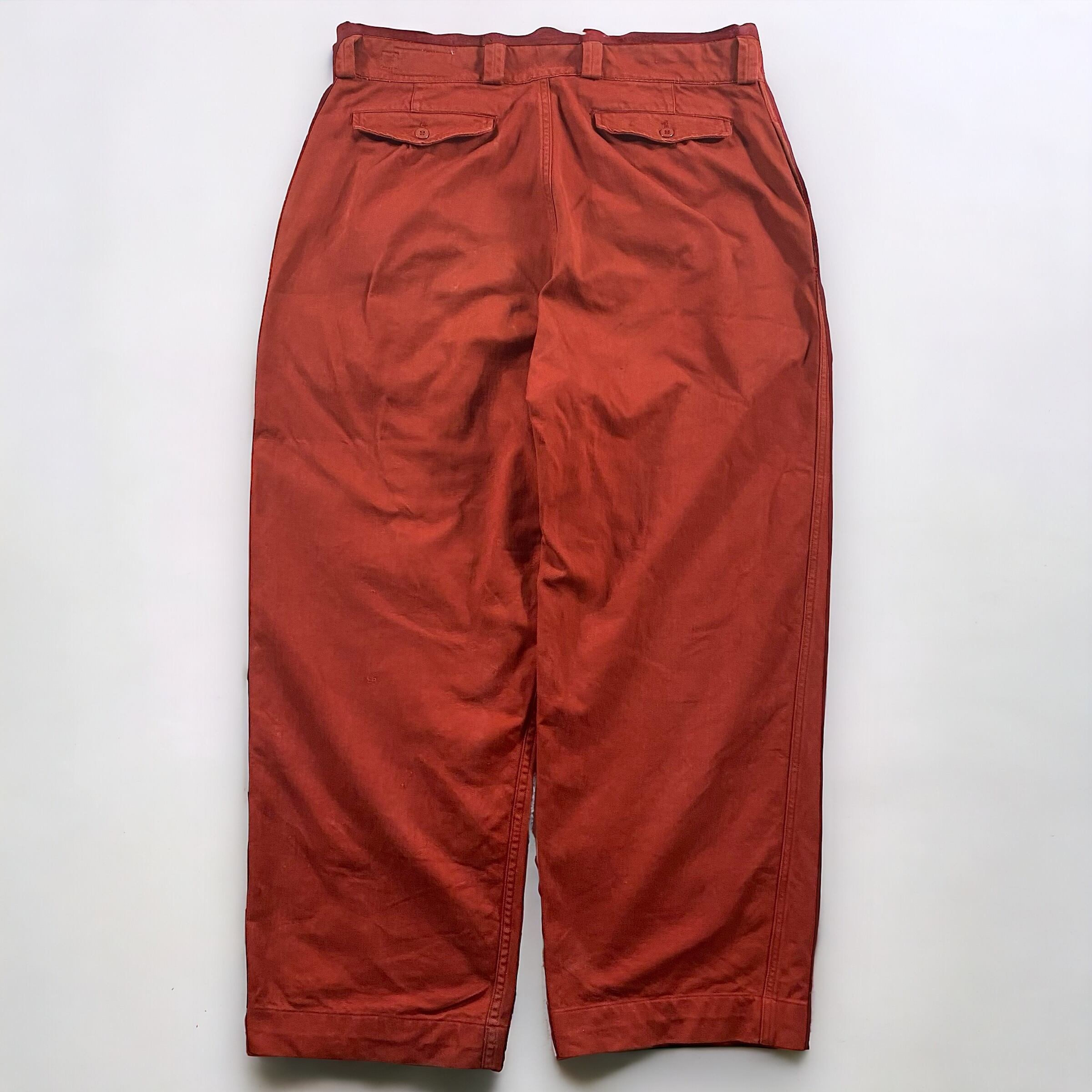 テラコッタの様な、ワインレッドの様な何色にも形容しにくいかなり独特な色味で、元々のM-52のコットンツイル生地と相まってかなり良い雰囲気のパンツに仕上がっています。