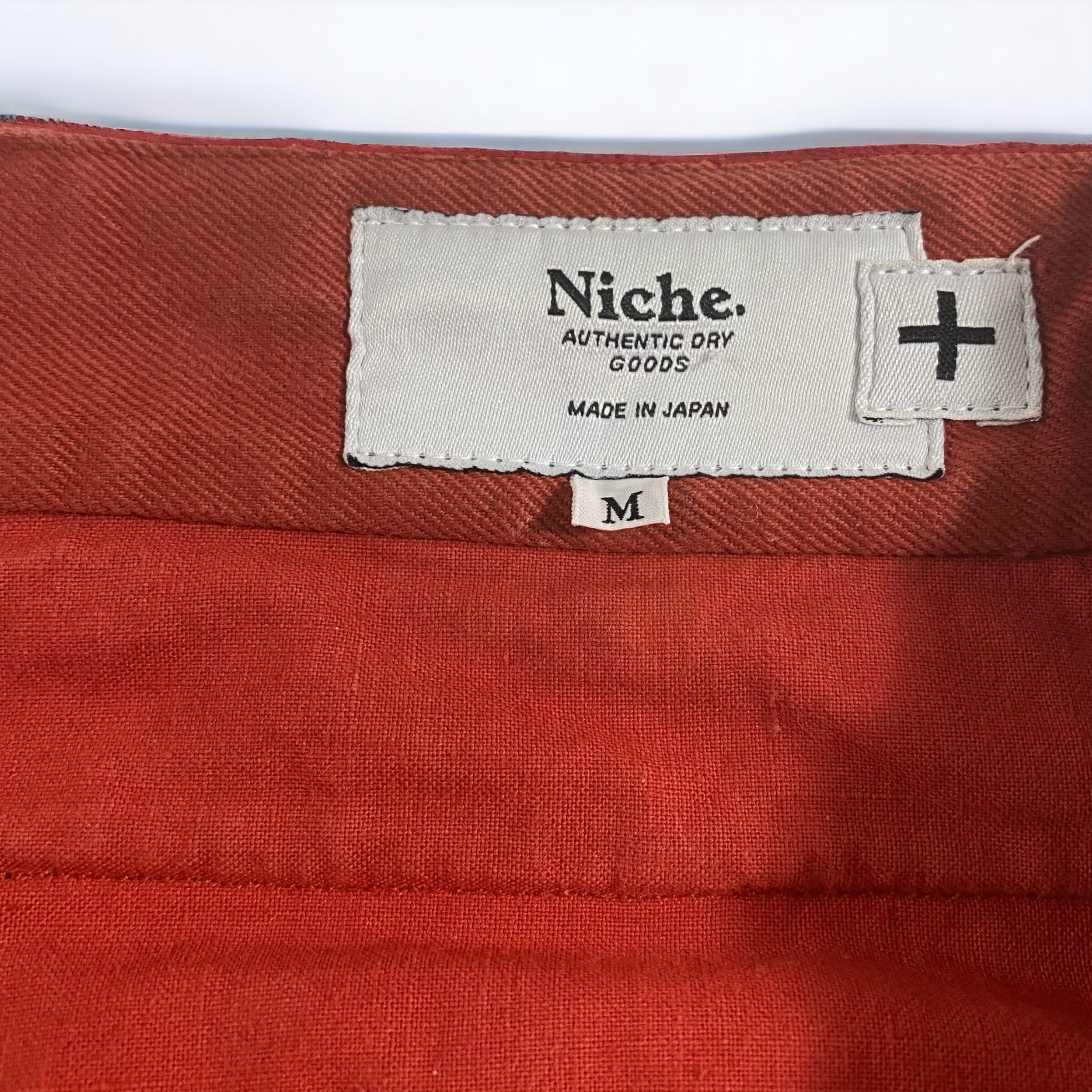 表記からもお分かりの様に、フランス軍のM-52パンツをまんま使用して、オーバーダイを施した上に、通称の1タックを→2タック仕様に変更。ボタンもそれぞれ染色カラーに近い色の物に付け替えて、レングスもリサイズし、Niche.のパンツとして生まれ変えさせてリリースされた一本です。