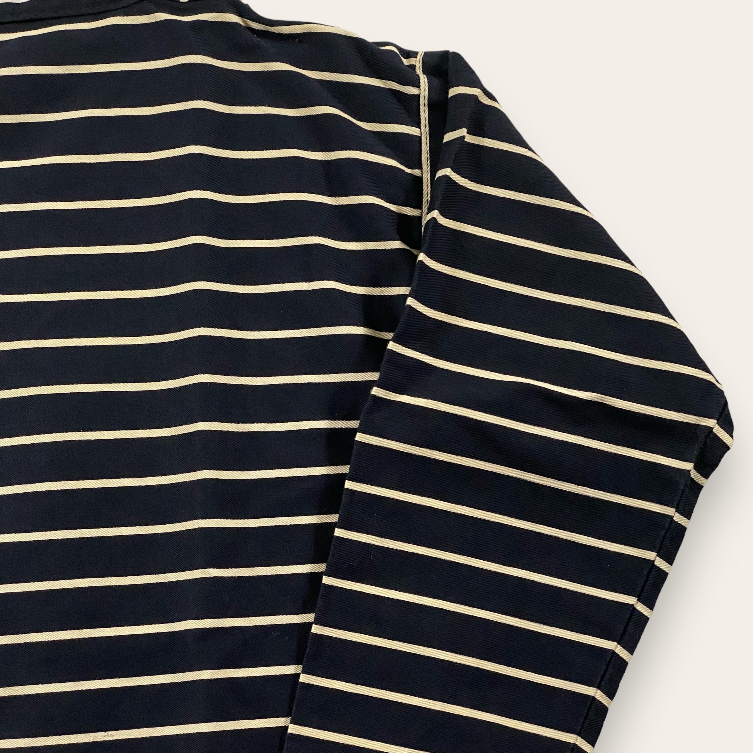 こちらはネイビーと白のボーダーのデザインで、サイズバランスも良く、春夏時期はショーツに合わせてガバッと羽織っていただいても良いかなと思います。