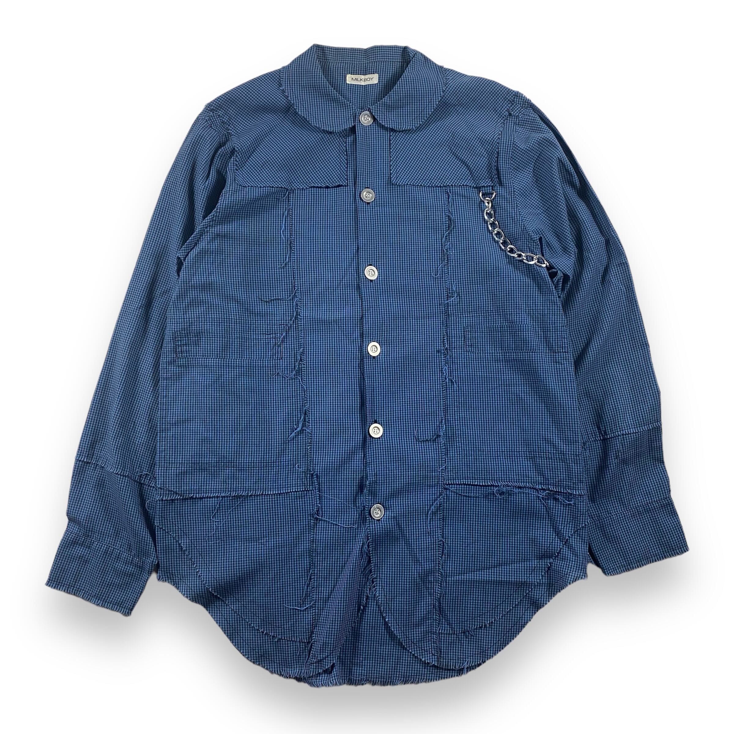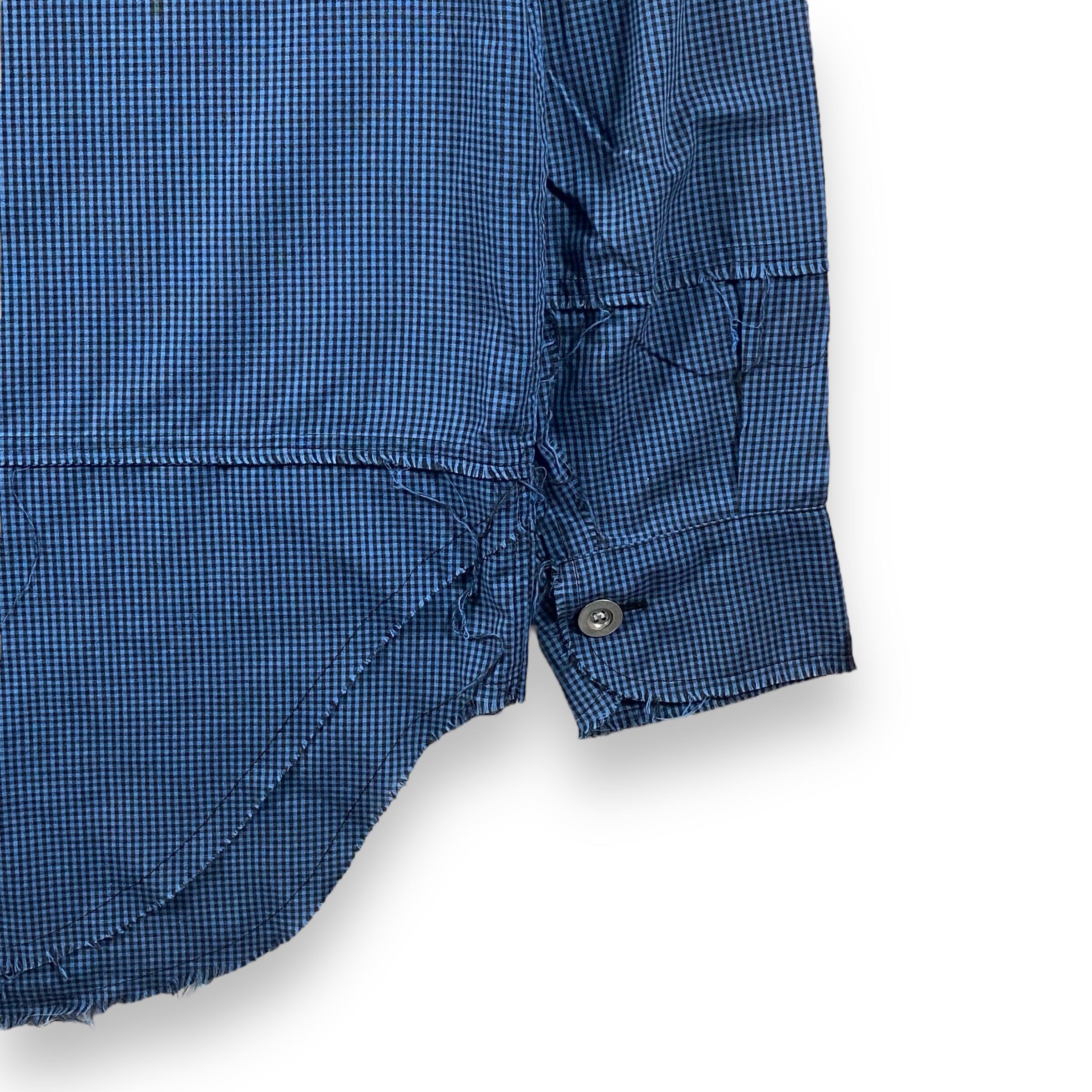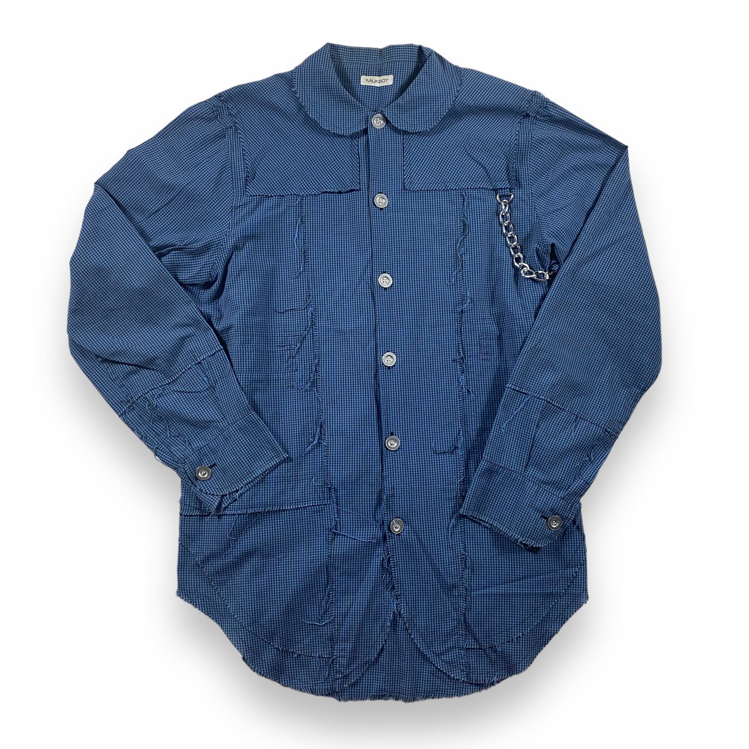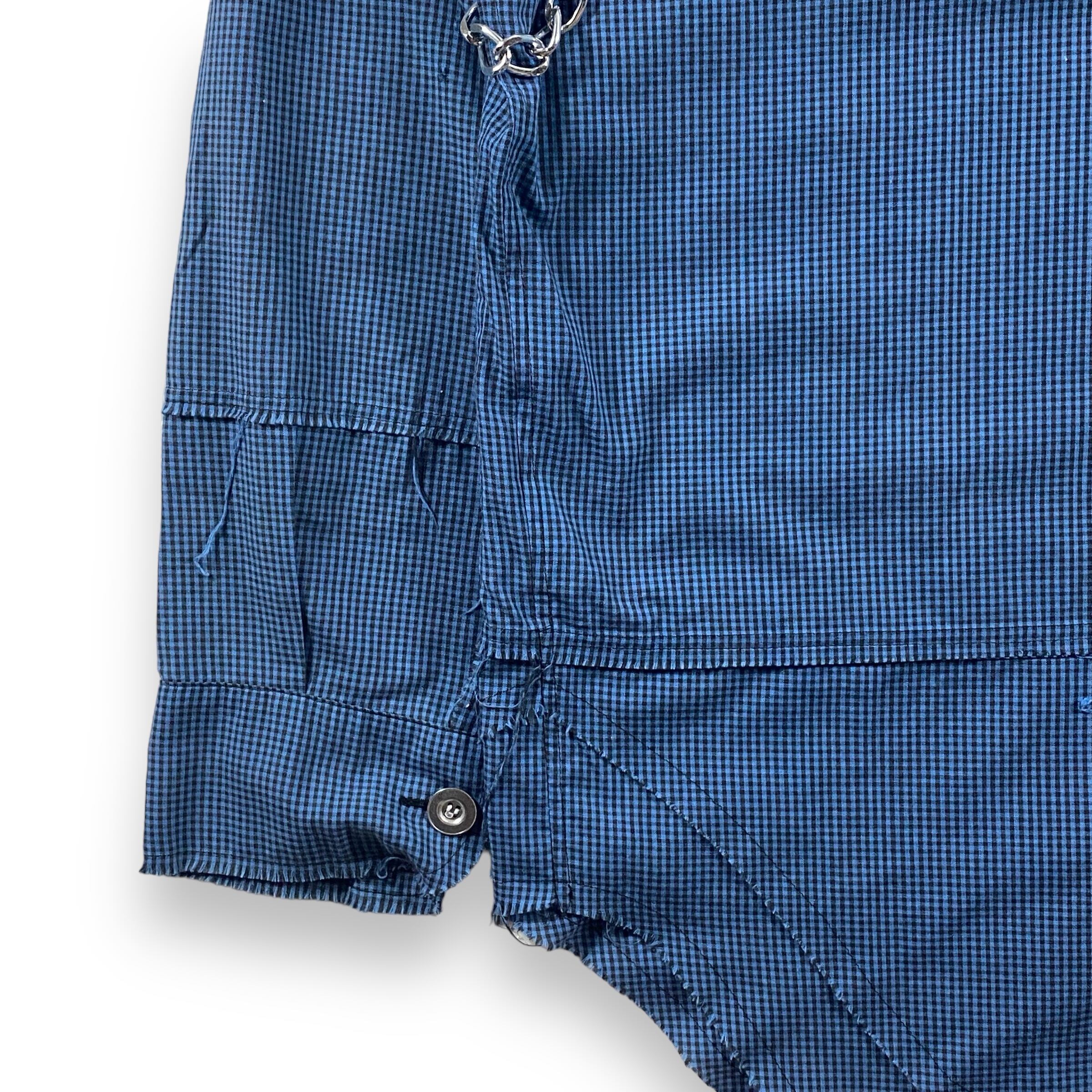 ブルー系のギンガムチェックに、全体的にデストロイ加工とパッチが施され、脇にチェーンが付いたシャツです。