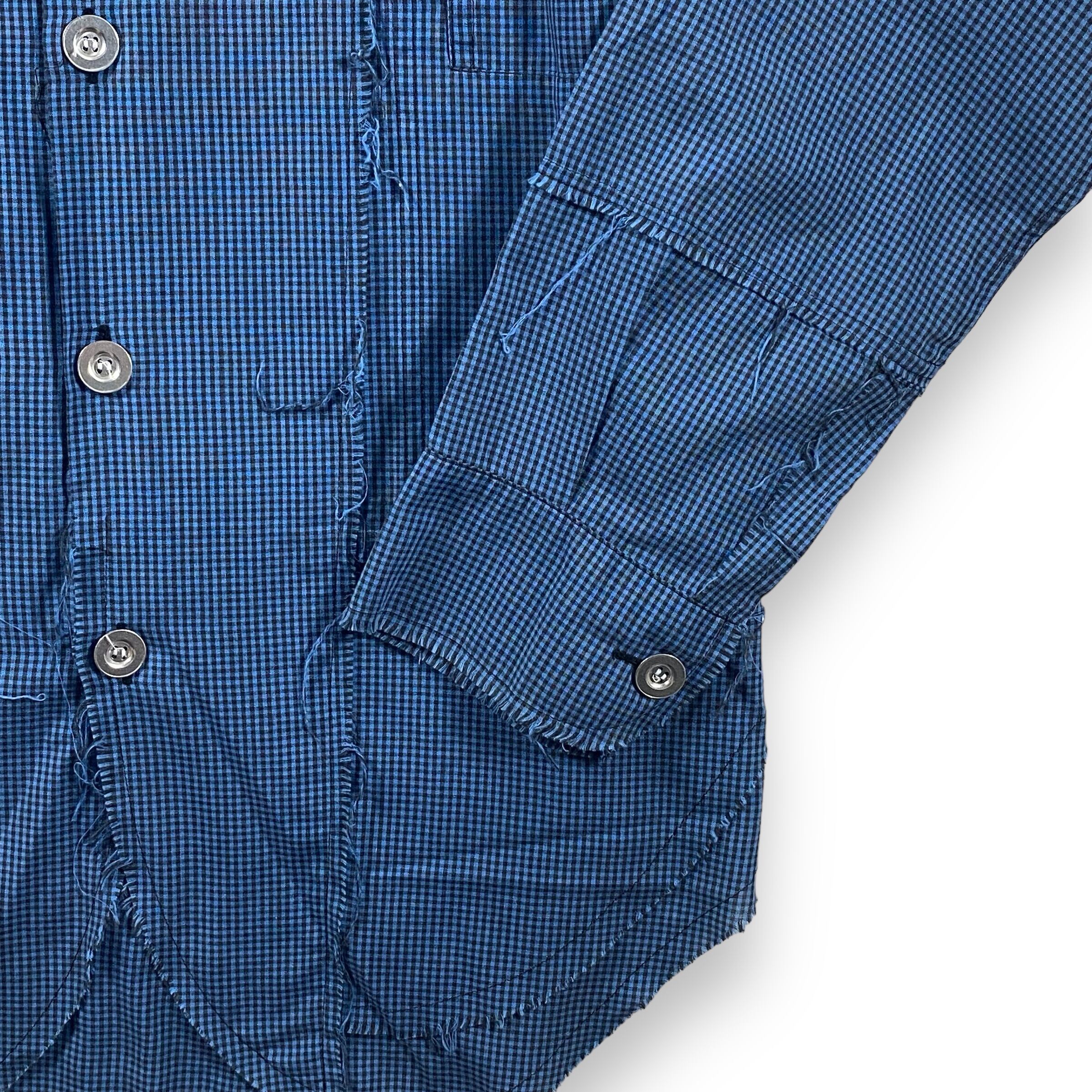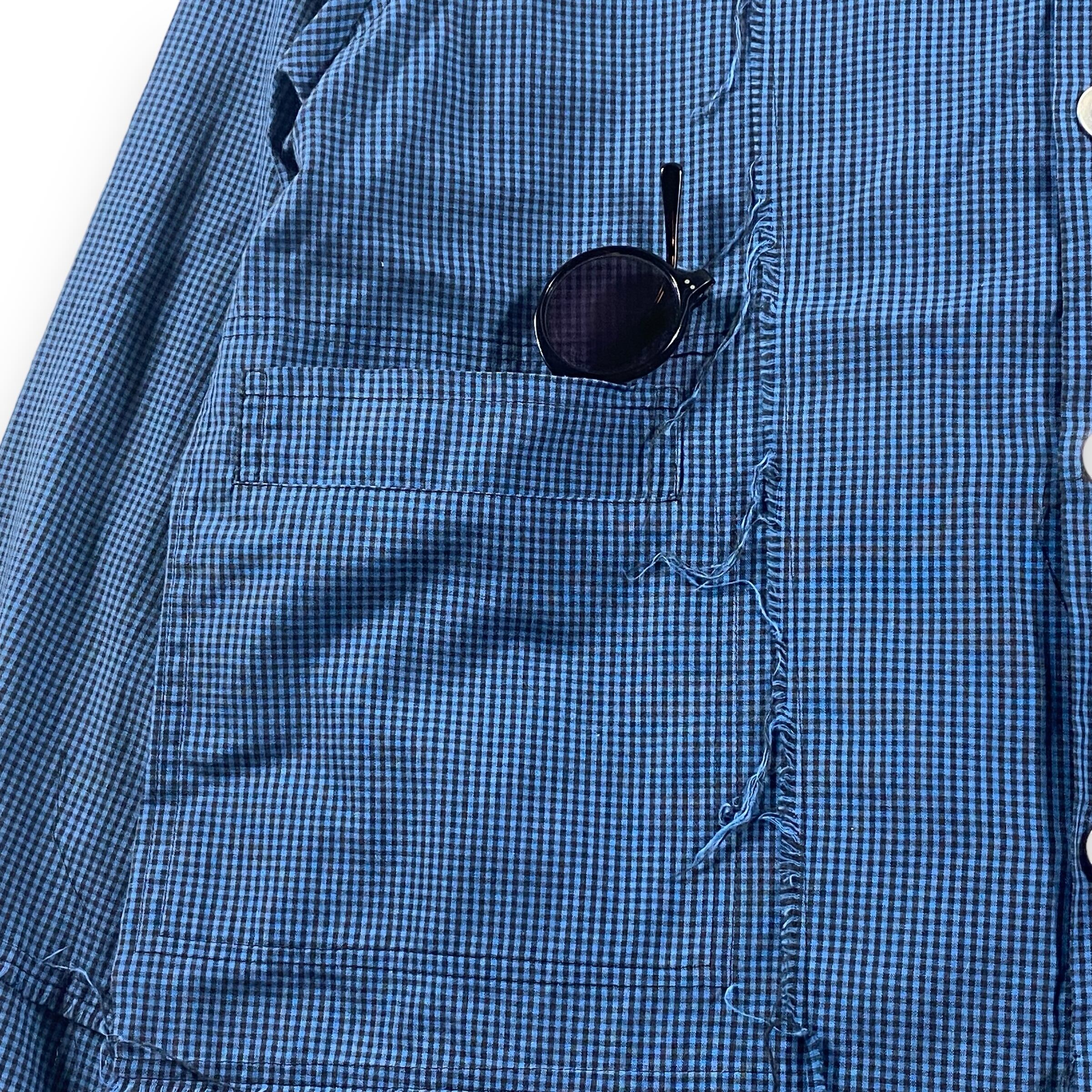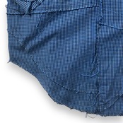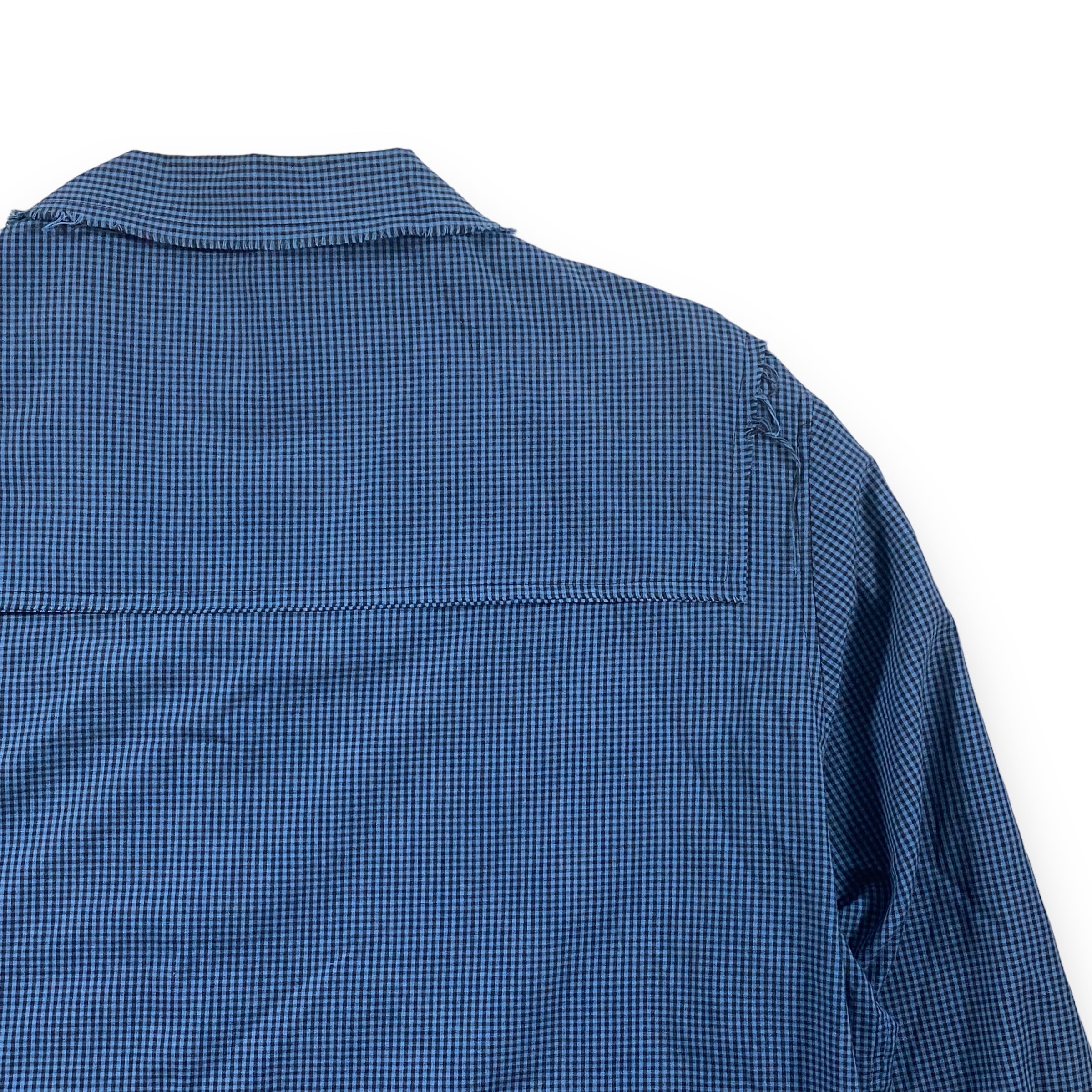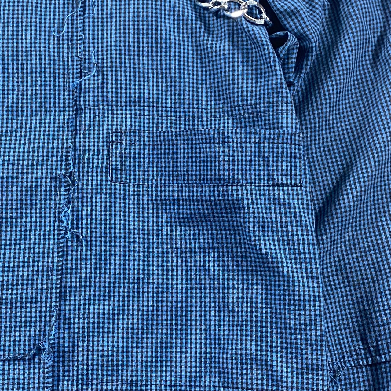 ブルー系のギンガムチェックに、全体的にデストロイ加工とパッチが施され、脇にチェーンが付いたシャツです。
