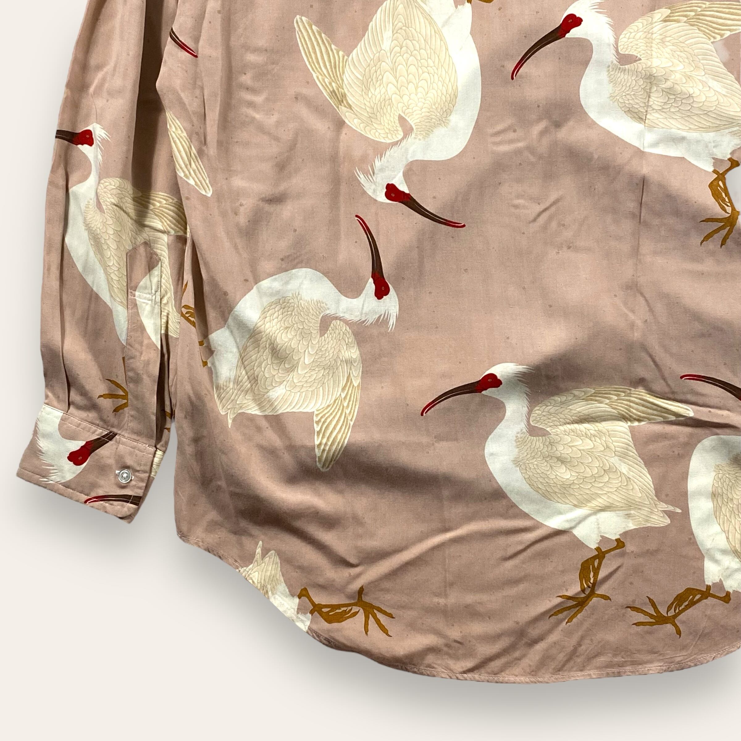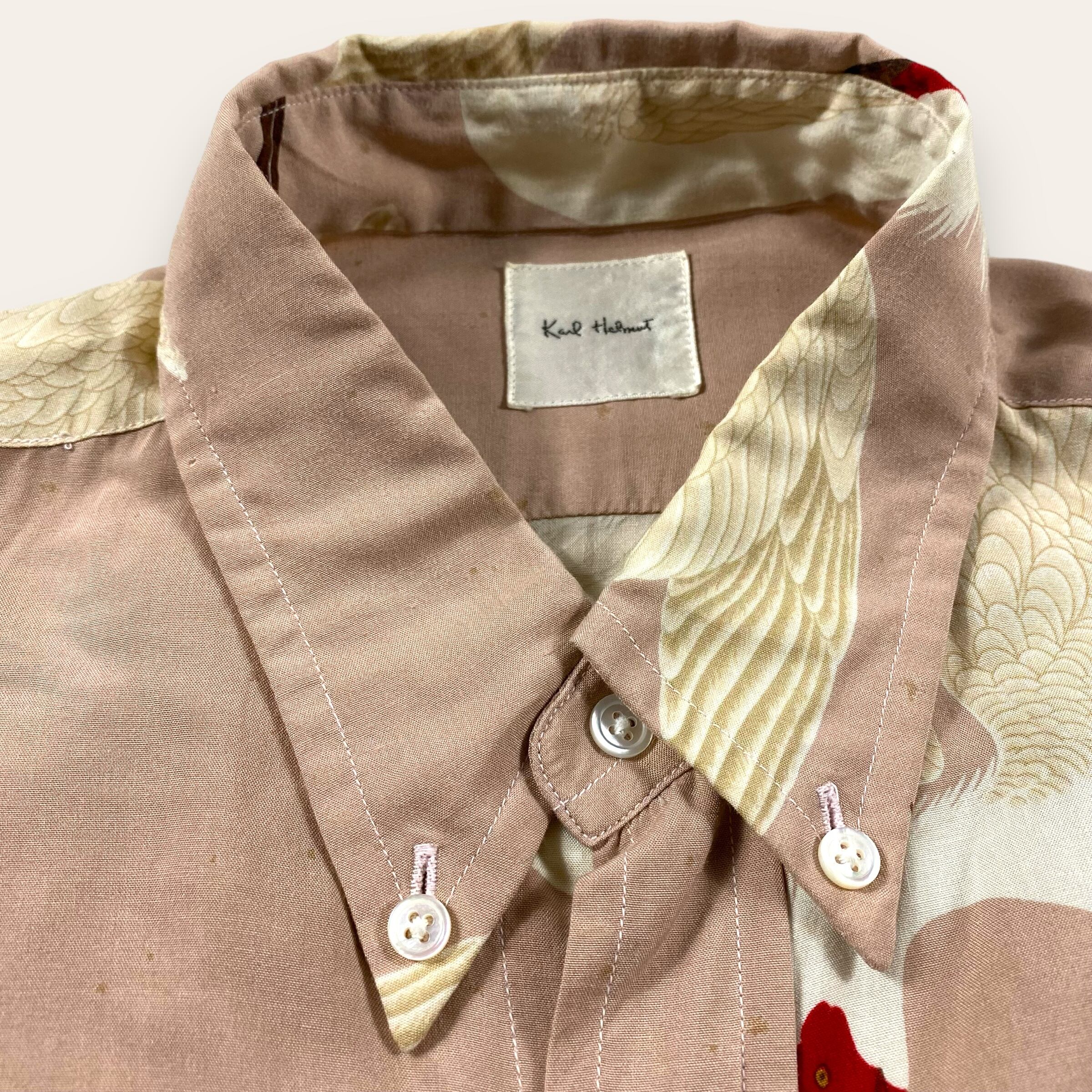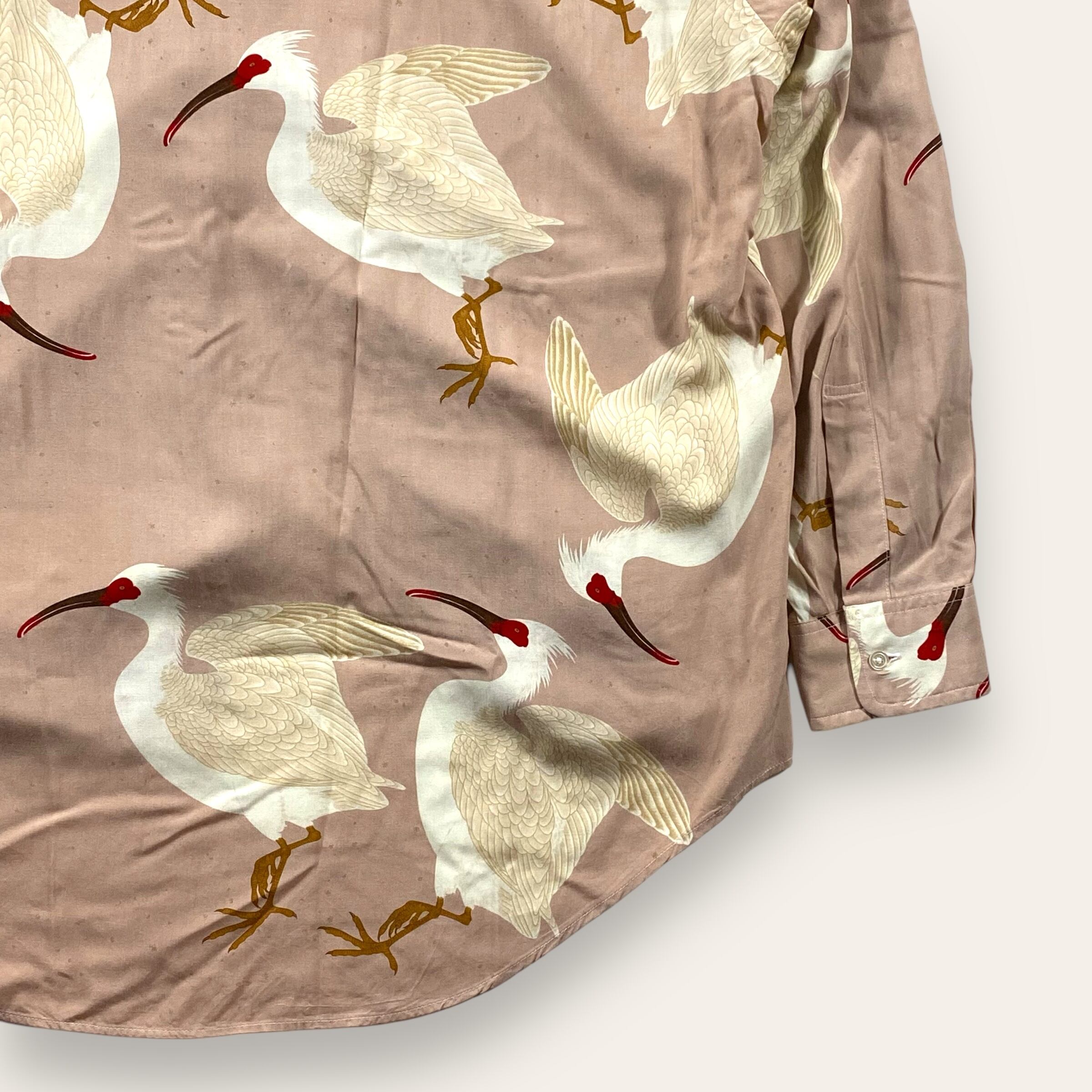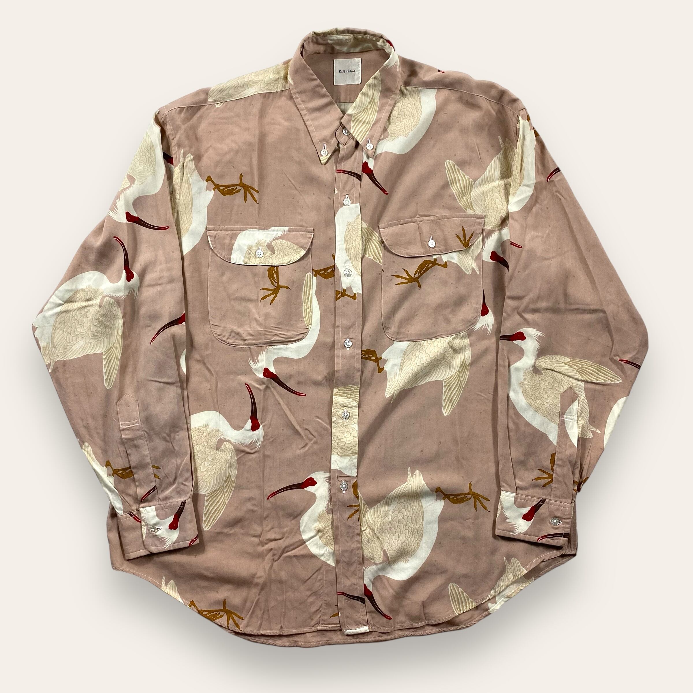 80年代のカール・ヘルムのアーカイブより、朱鷺が全面にプリントされたレーヨン100%のボタンダウンシャツです。