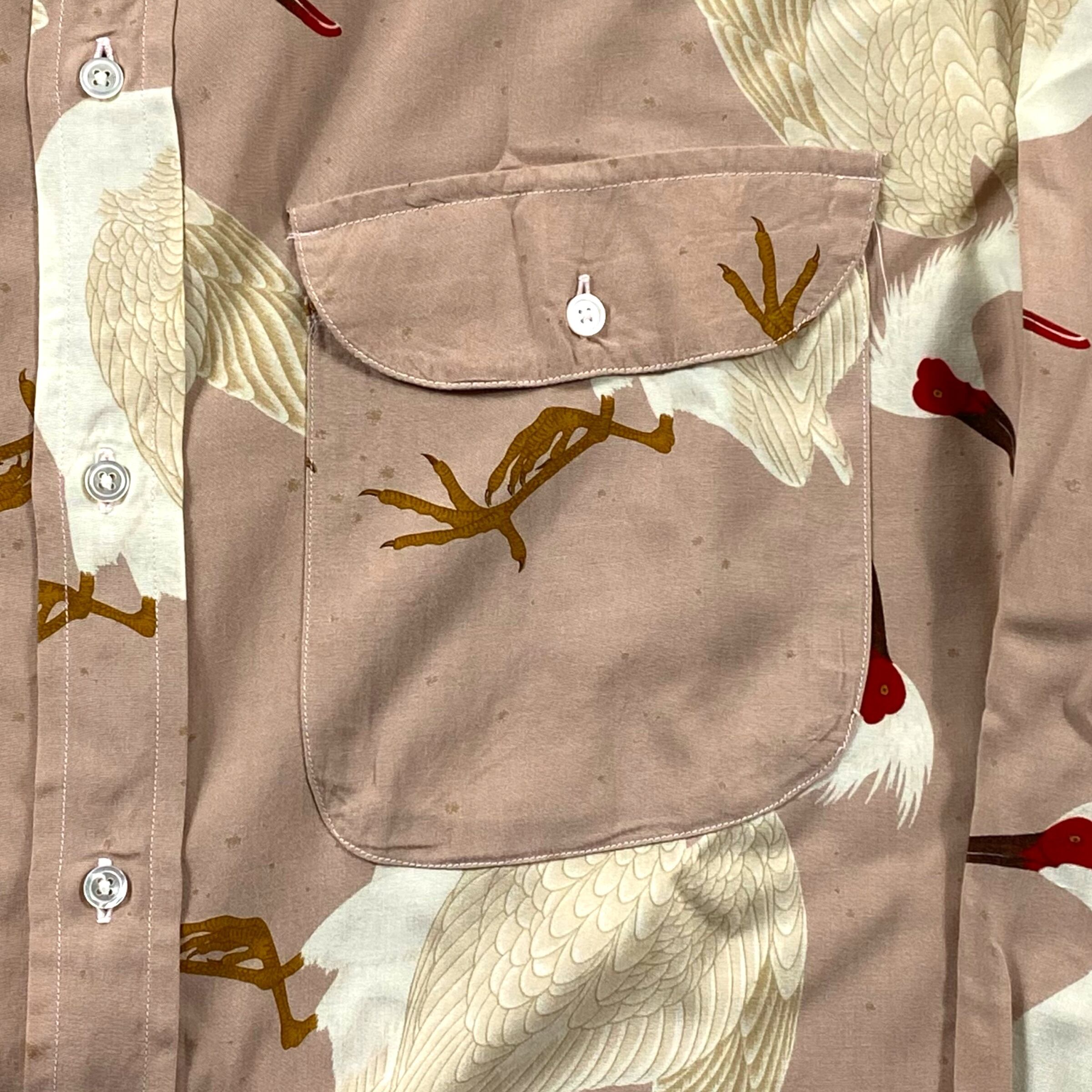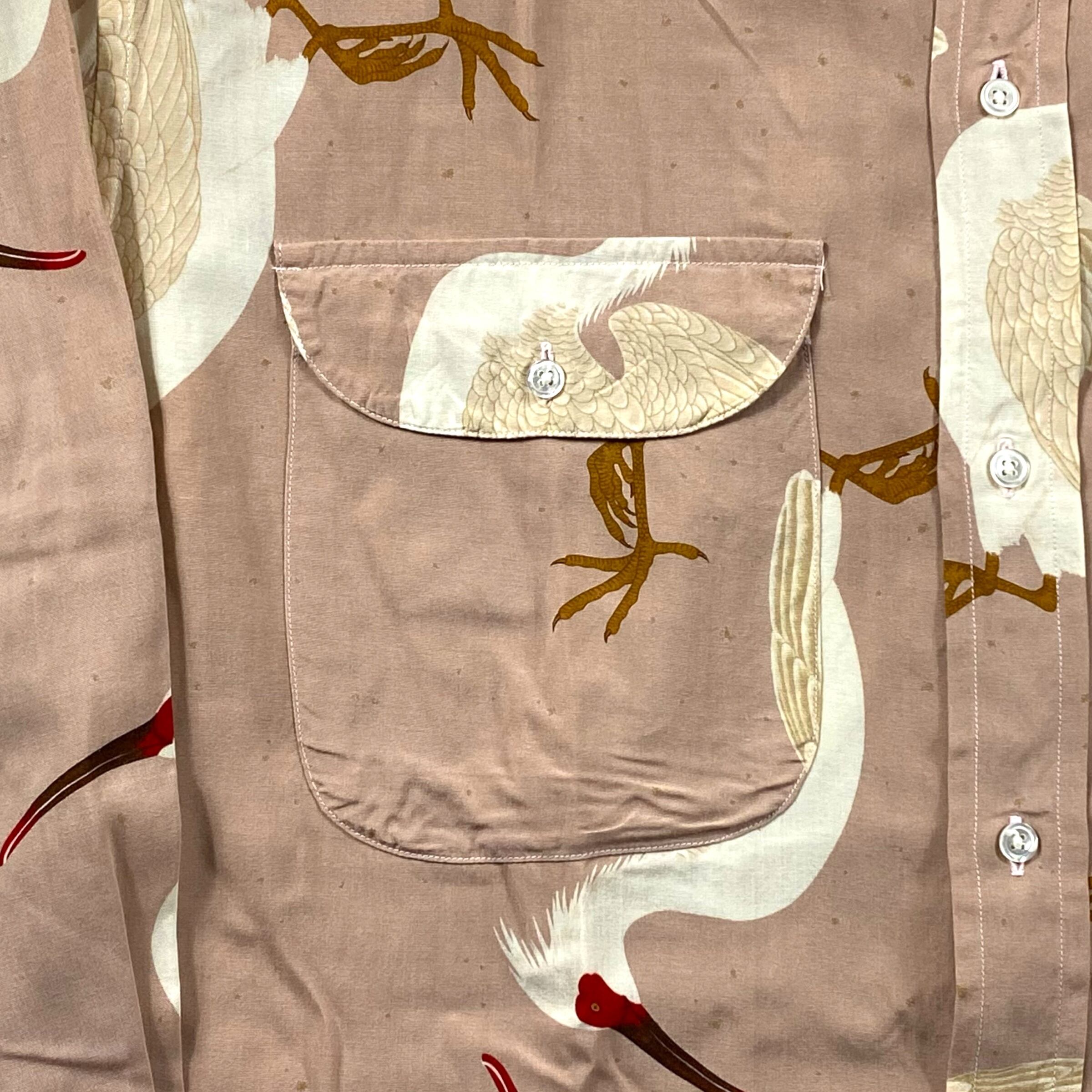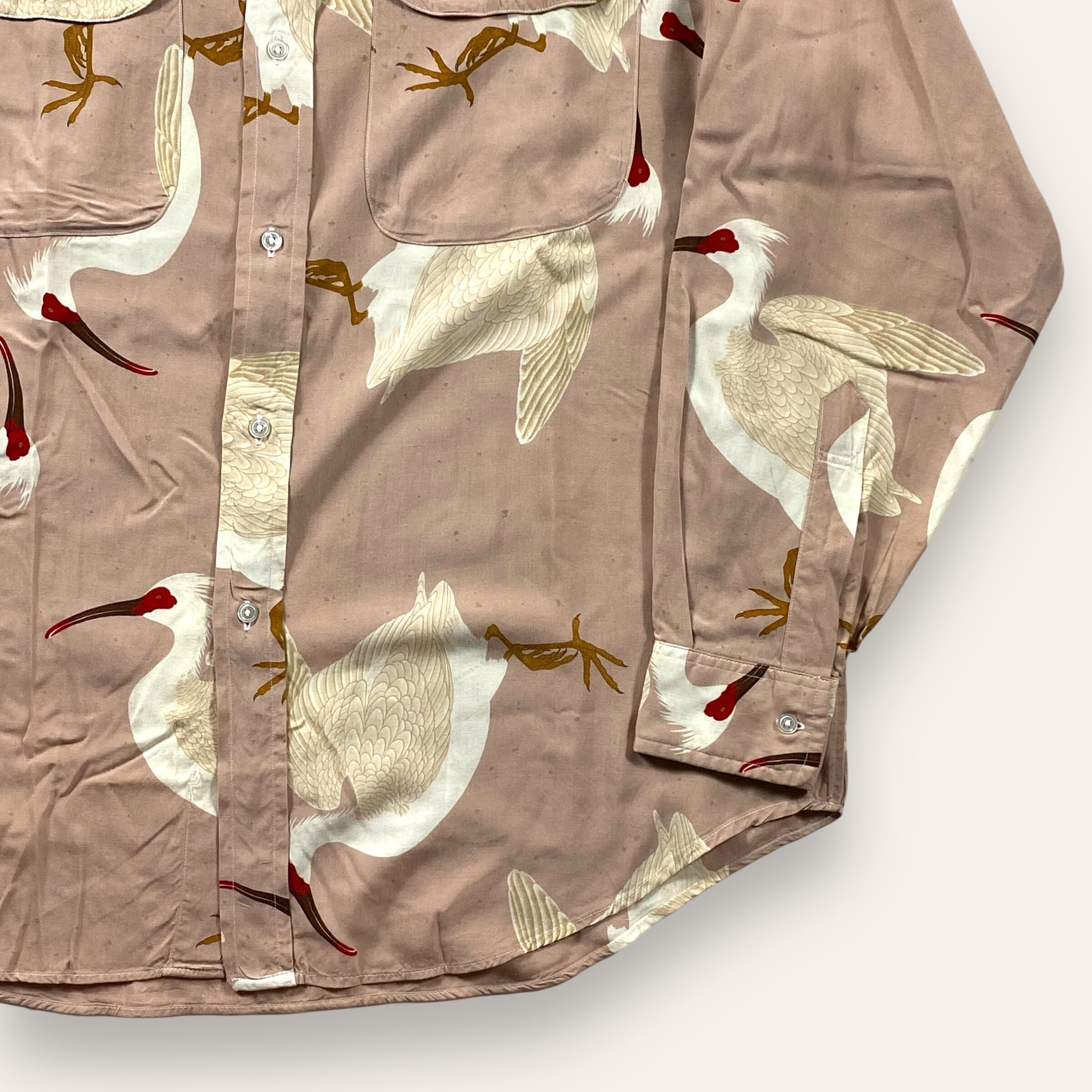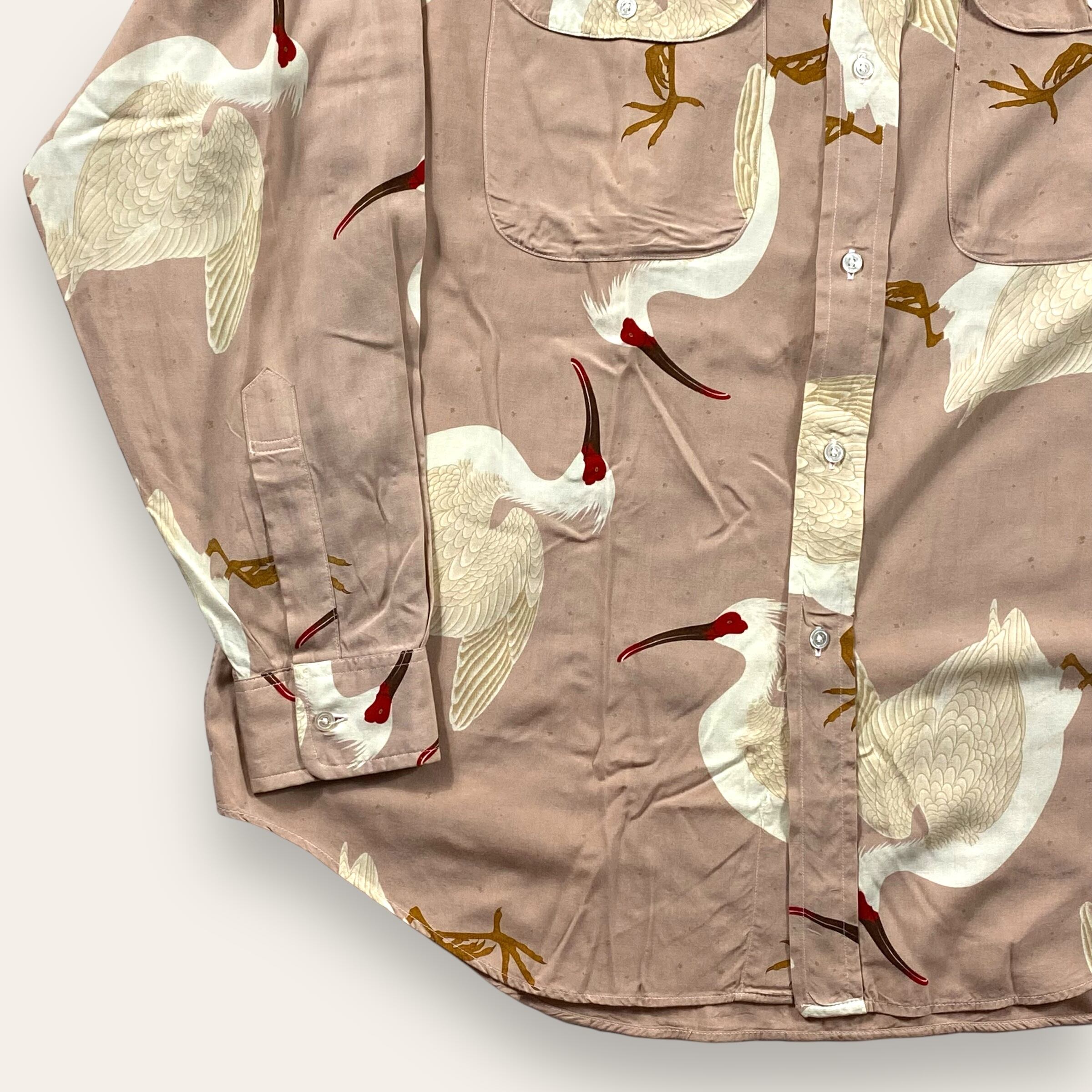 80年代のカール・ヘルムのアーカイブより、朱鷺が全面にプリントされたレーヨン100%のボタンダウンシャツです。