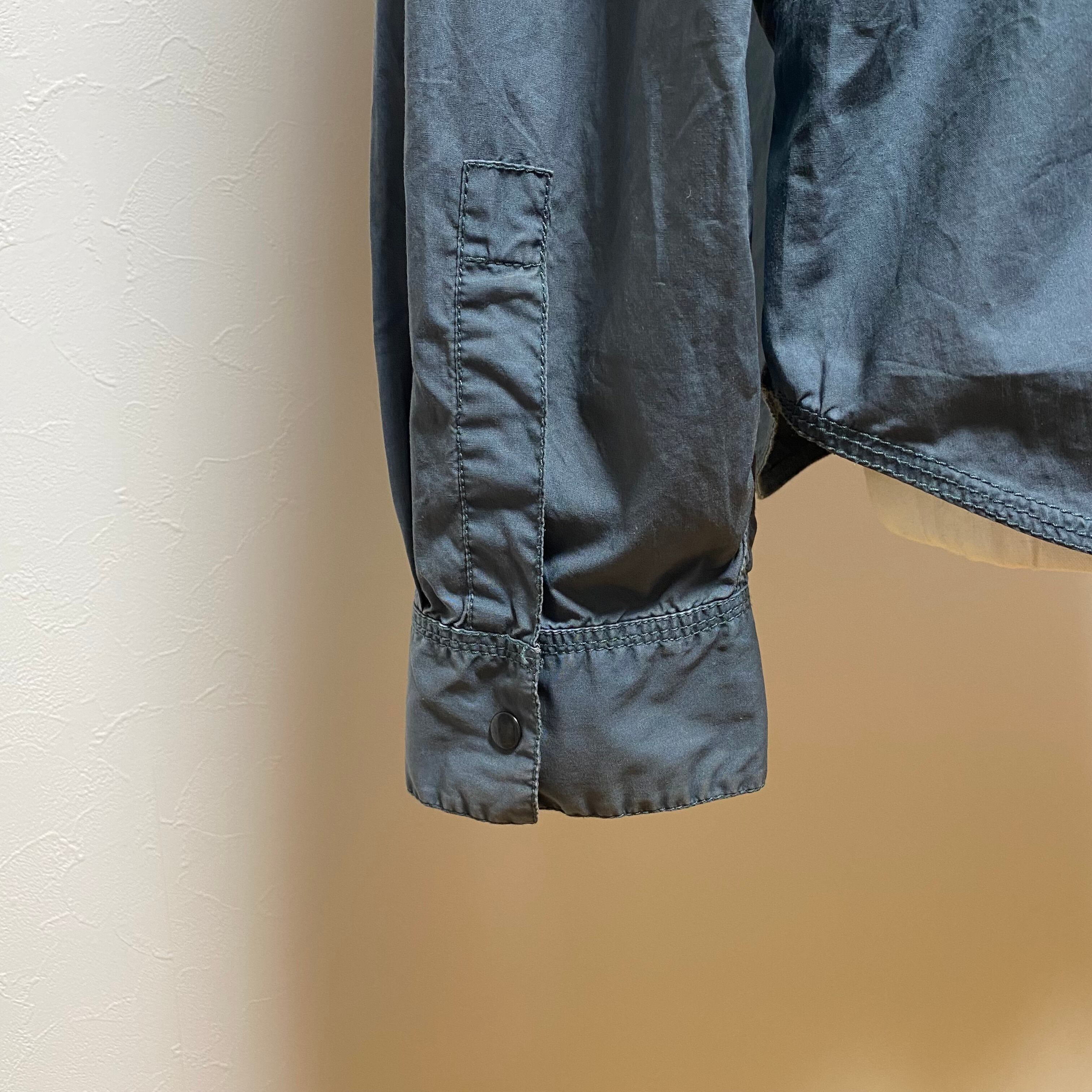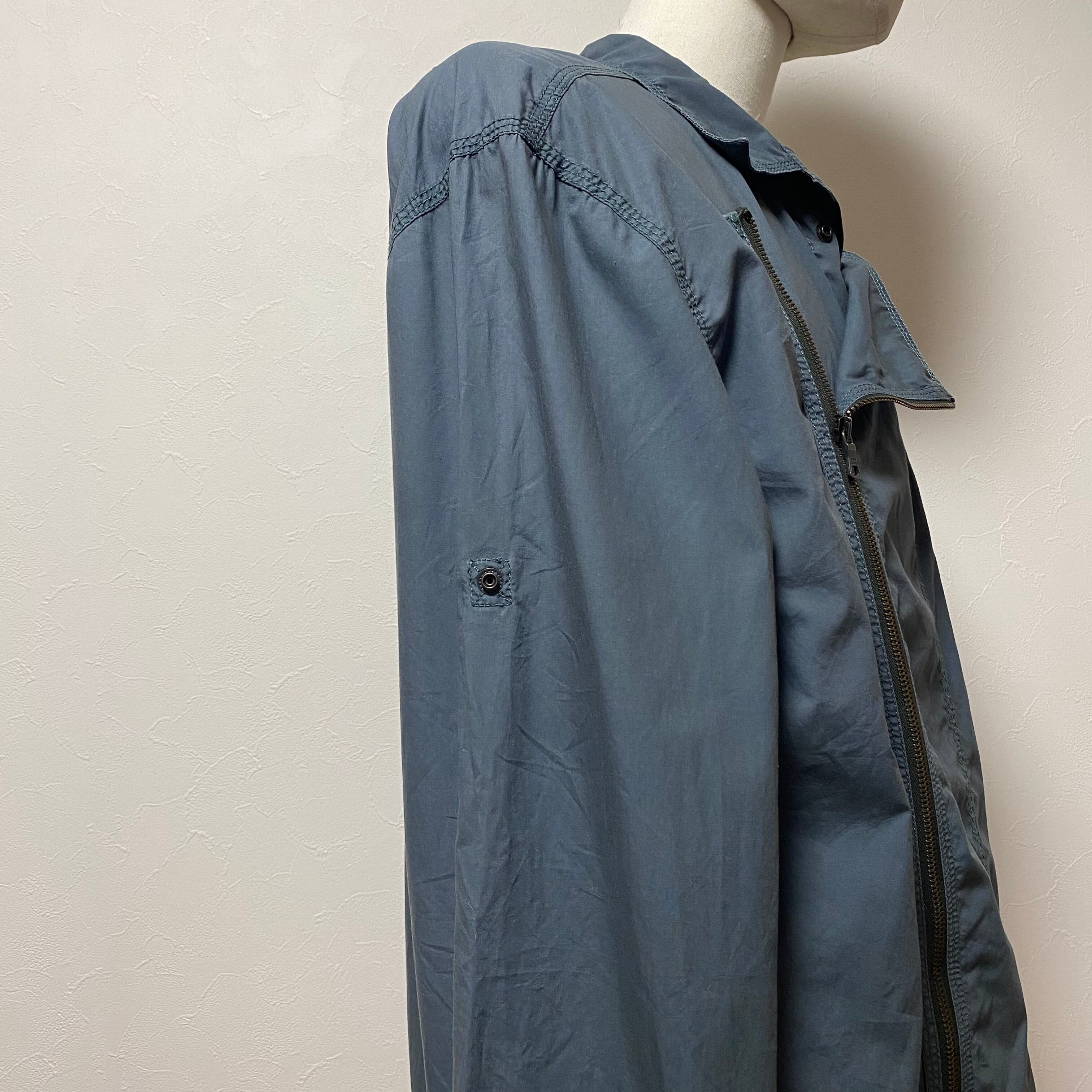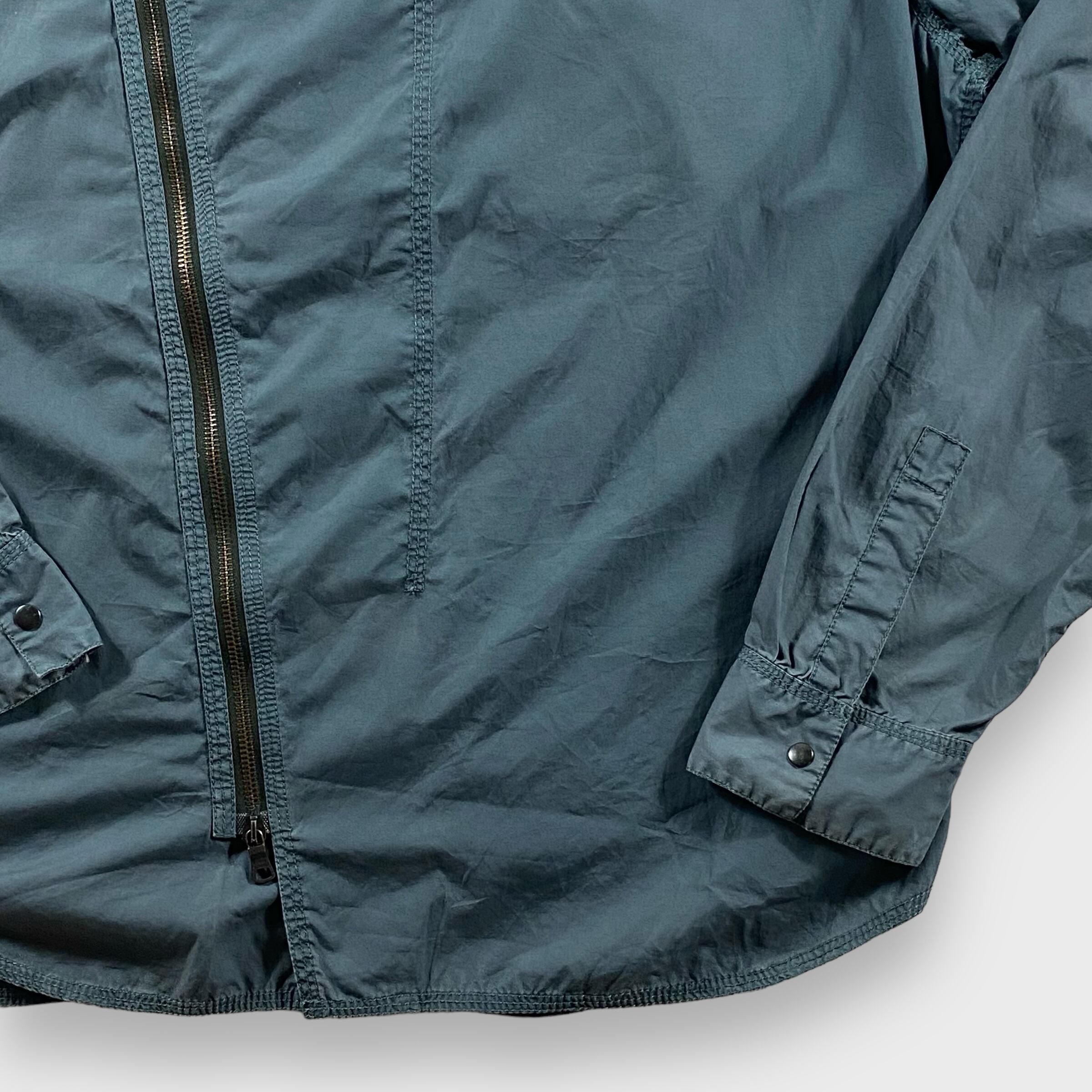 ナイロンの様なハリのあるコットン生地を仕様した一枚生地のシャツJKTで、斜めに付いたダブルジップが特徴です。