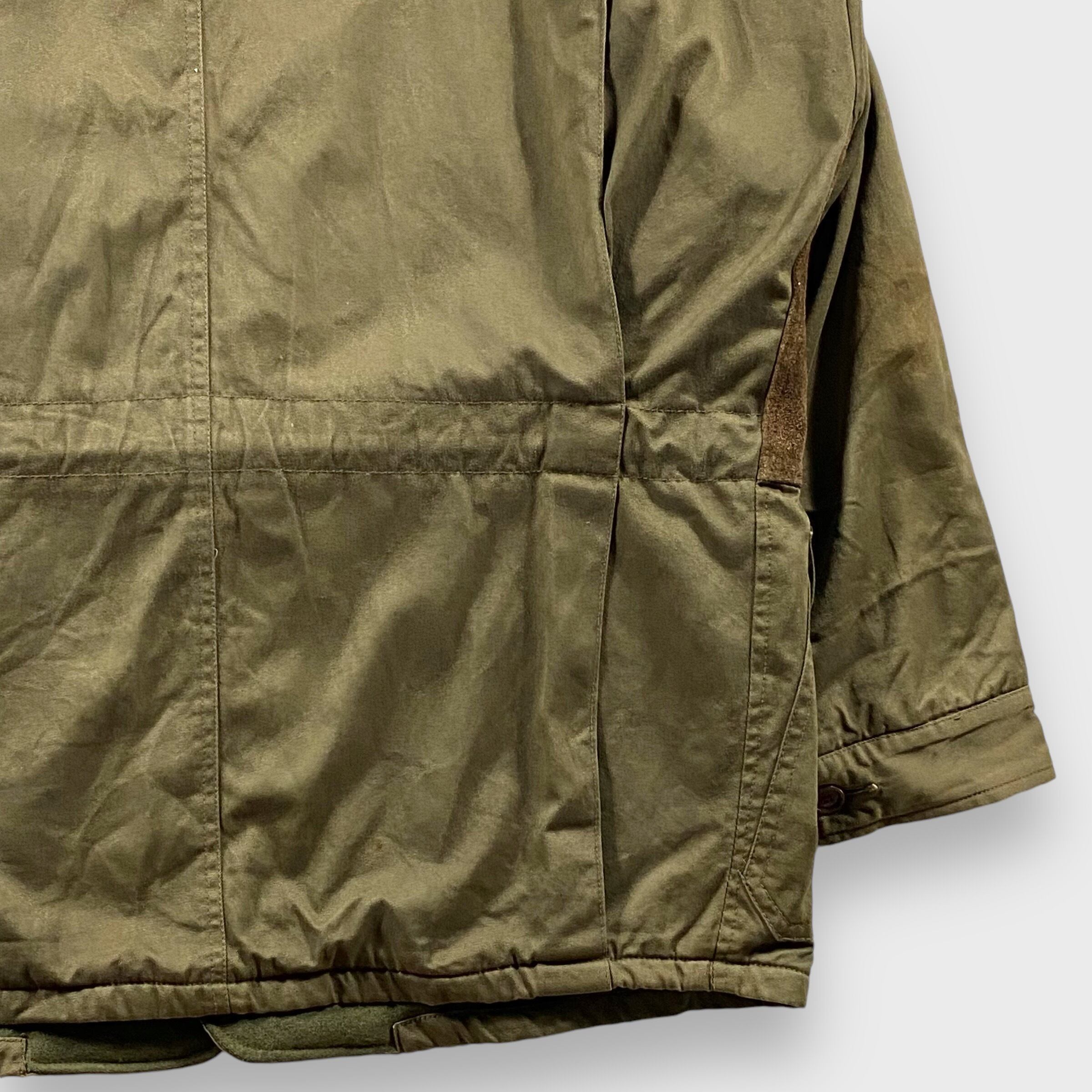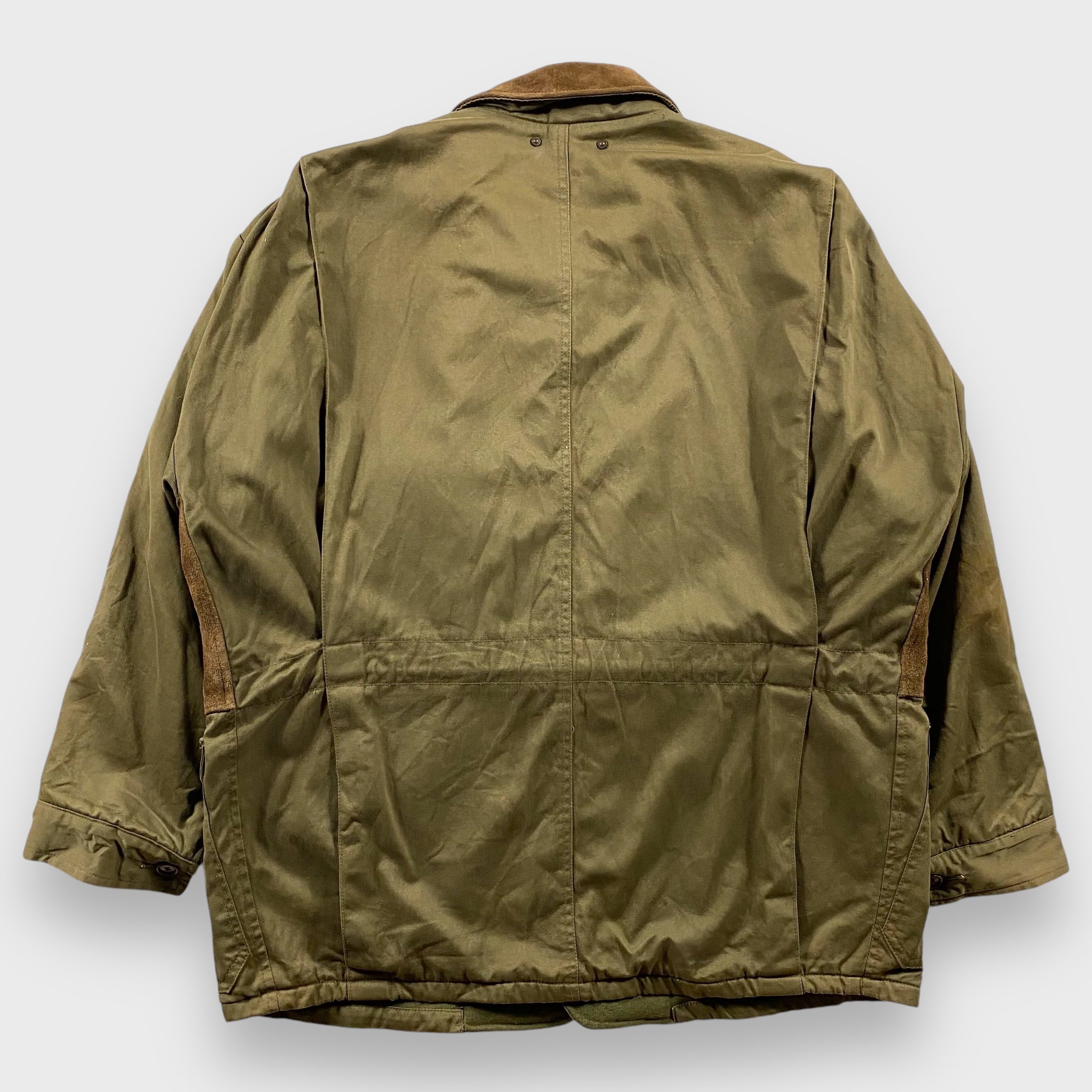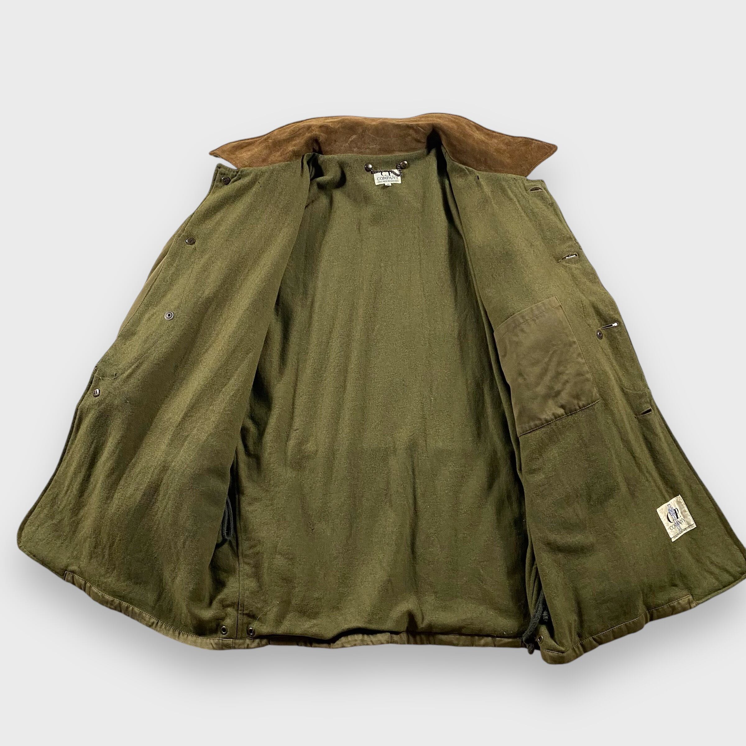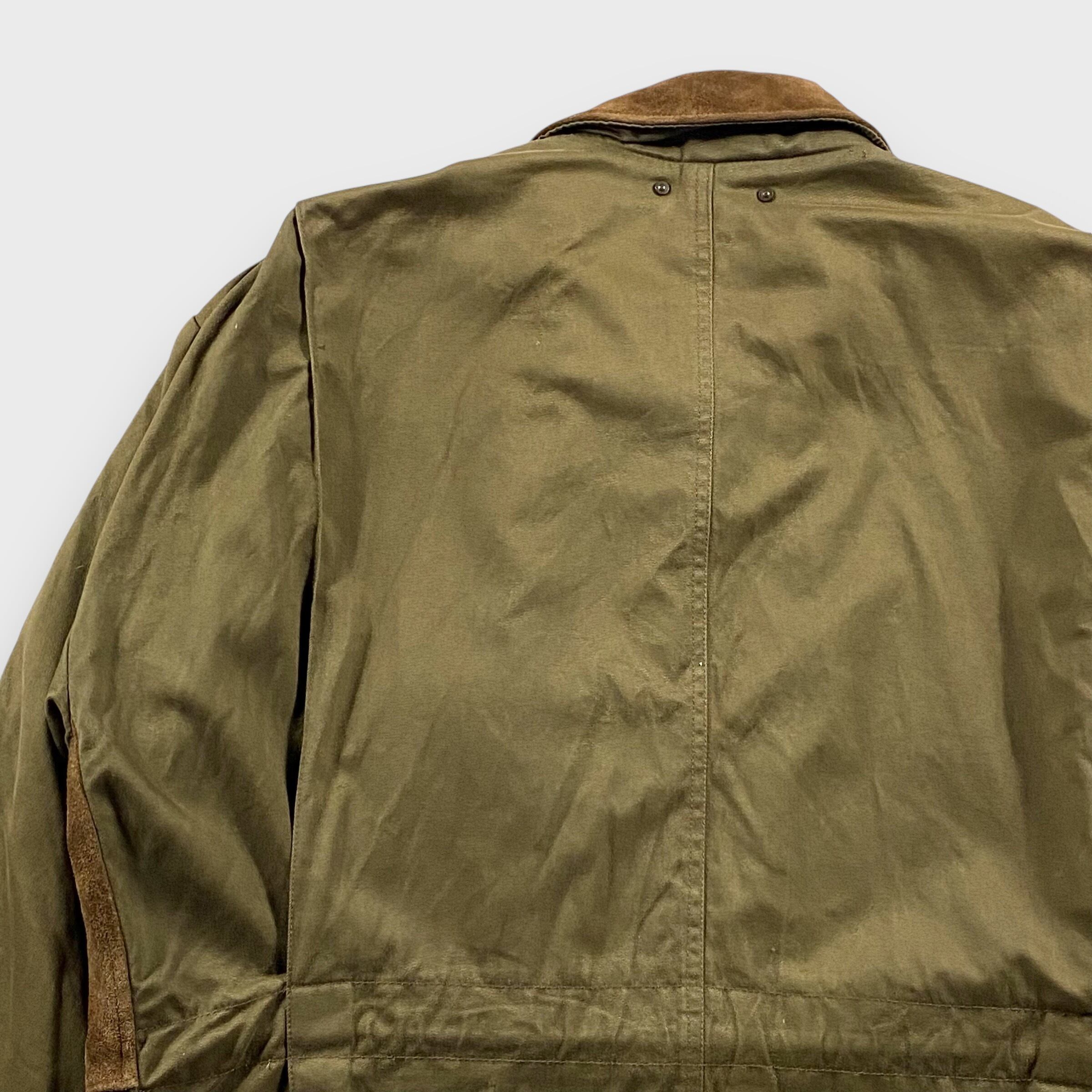厚地のコットンボディの身体の稼働する部分には全てアクションプリーツ仕様となっており、フロント上部から肩付近には強固な牛革のスウェード生地が付けられていて、これは獲物を獲る際に猟銃等を担ぐ際の補強の意味合いもあるディティールとなっています◎